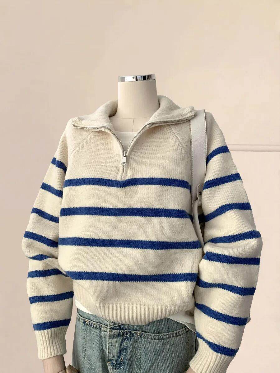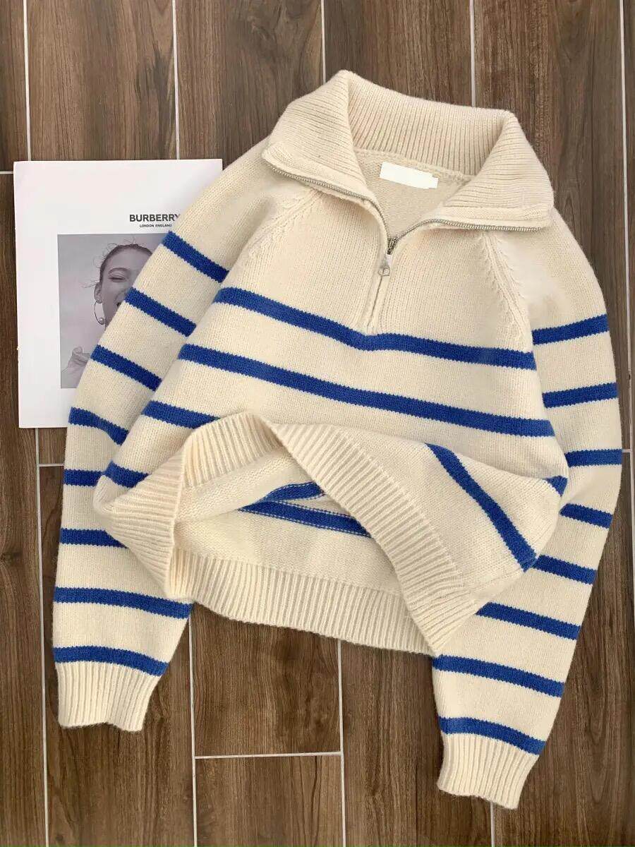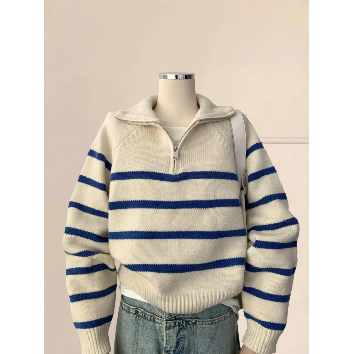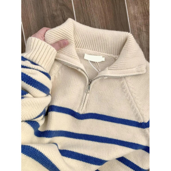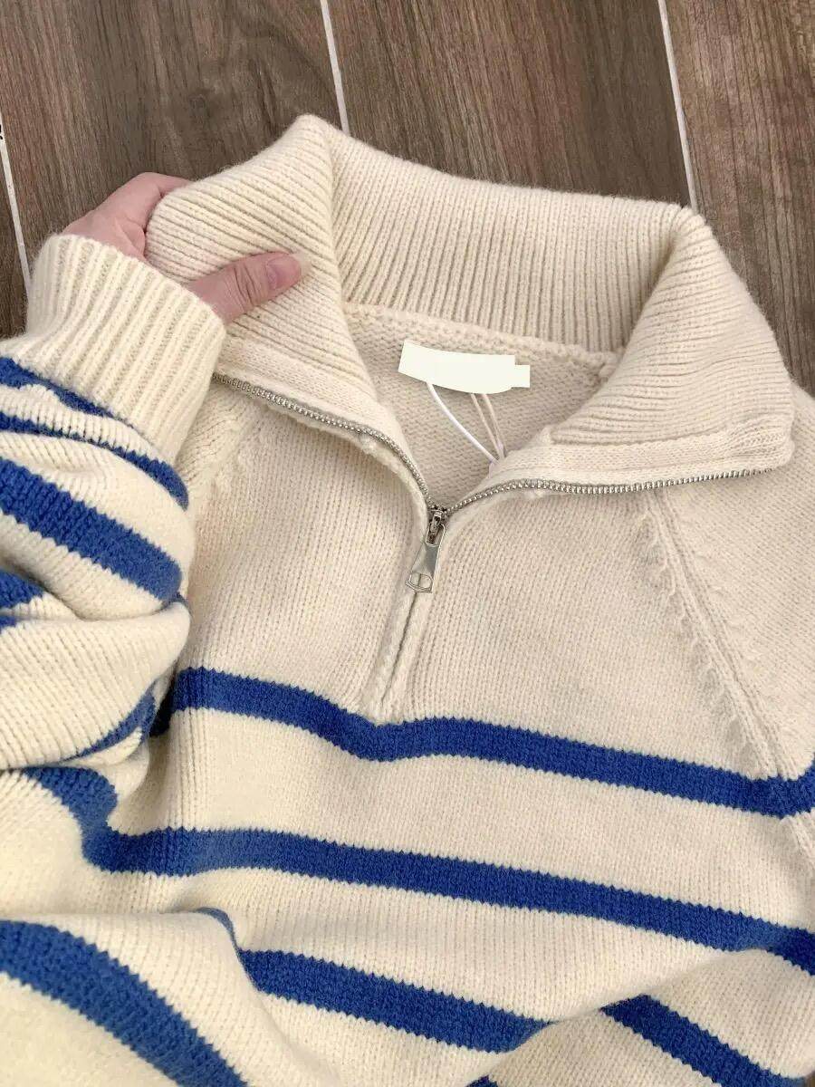 藍色條紋浣熊絨半拉鍊polo翻領外穿毛衣秋冬女針織內搭打底衫上衣