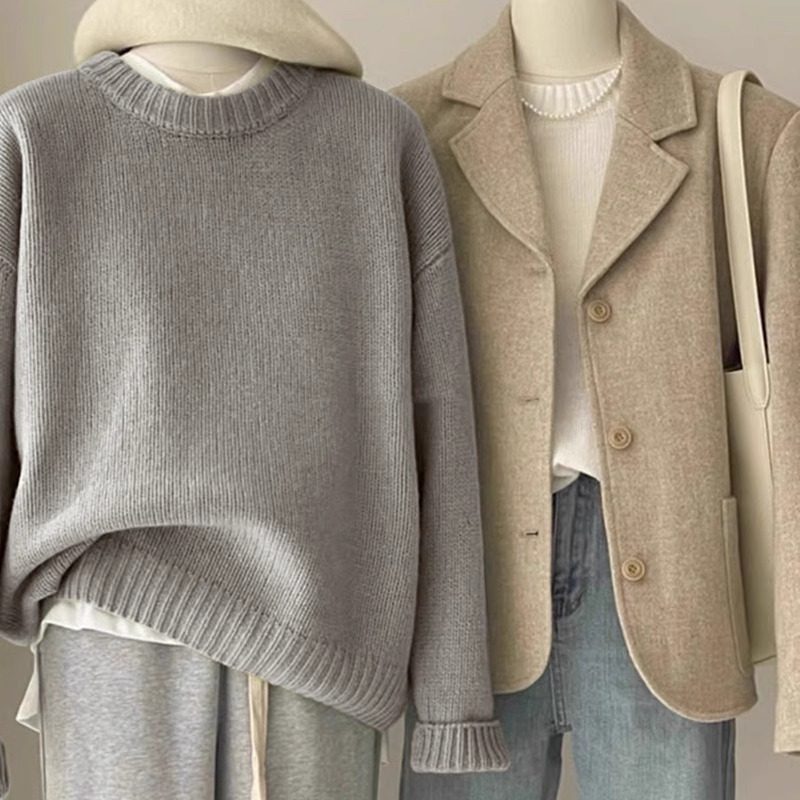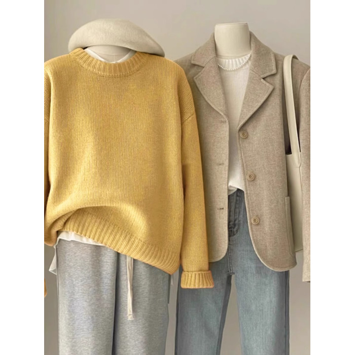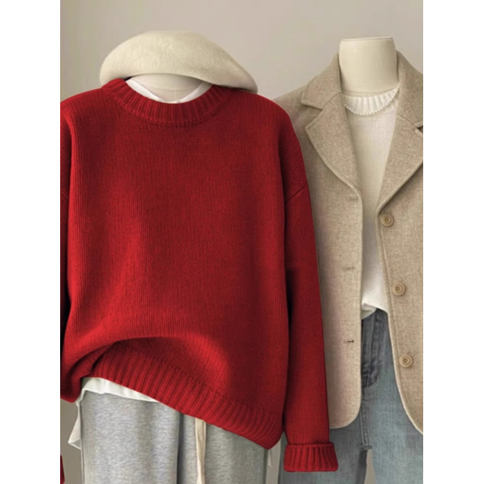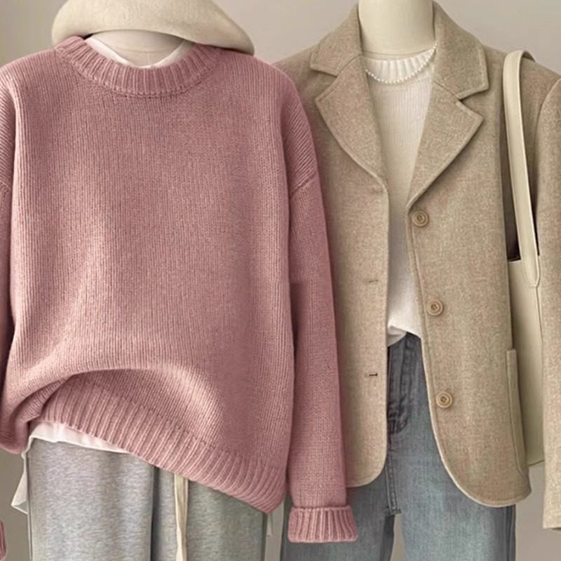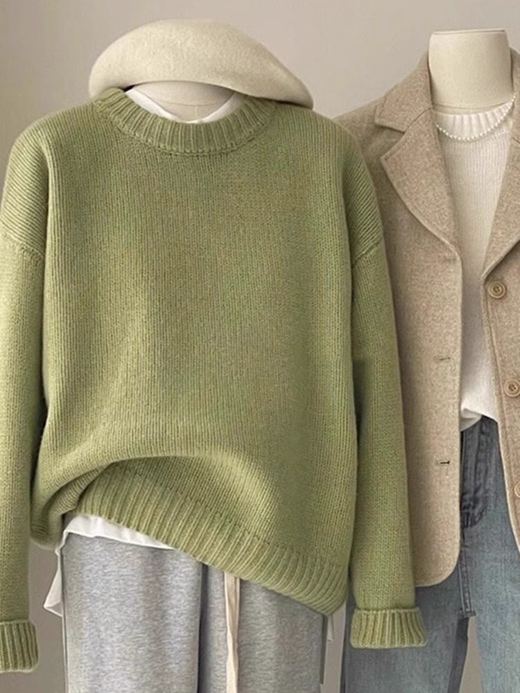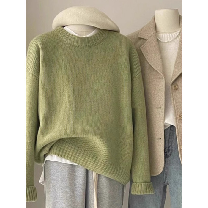嬭fufu綠色毛衣女秋冬韓系寬鬆慵嬾風松弛感圓領打底內搭針織衫厚