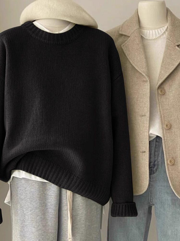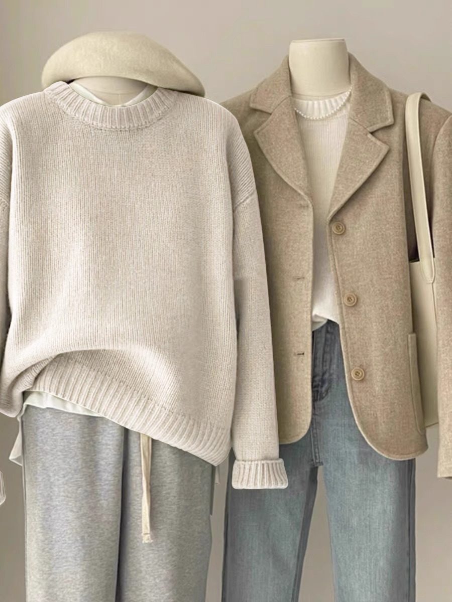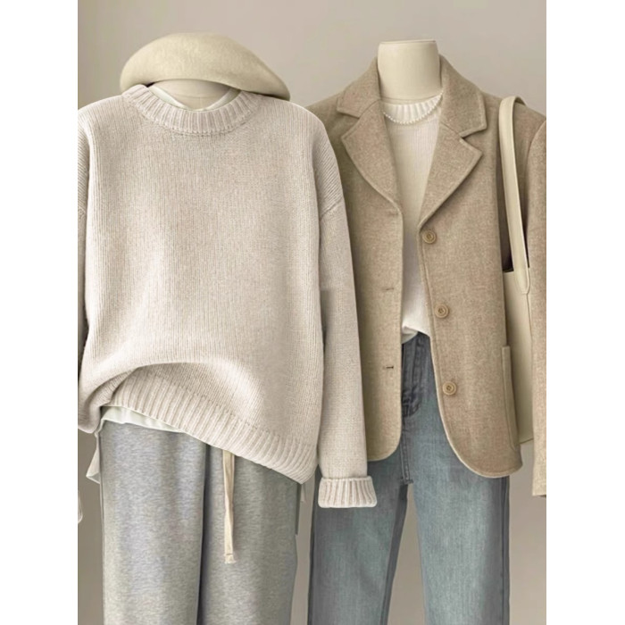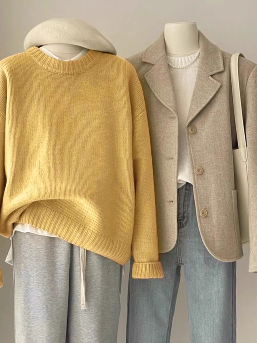 嬭fufu綠色毛衣女秋冬韓系寬鬆慵嬾風松弛感圓領打底內搭針織衫厚