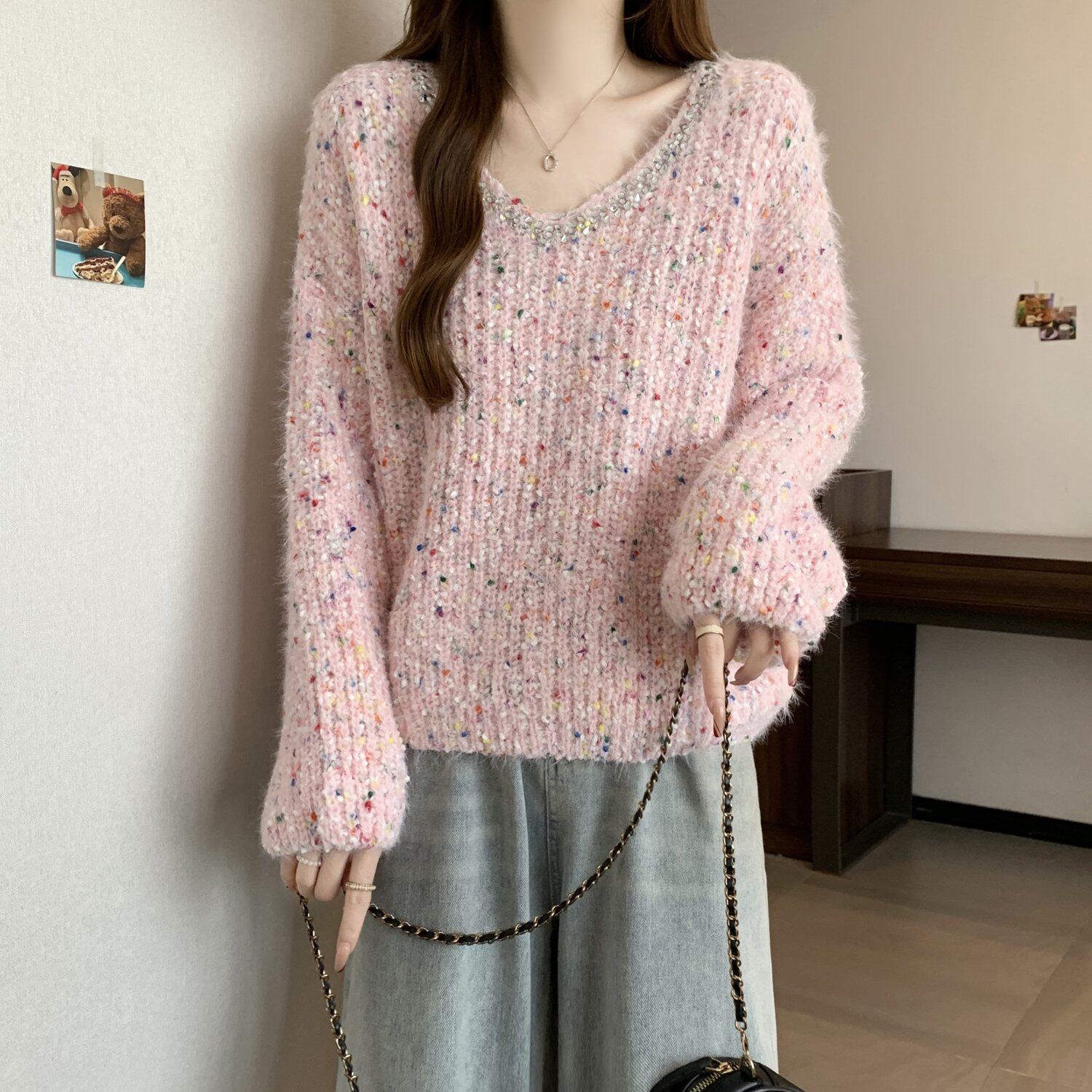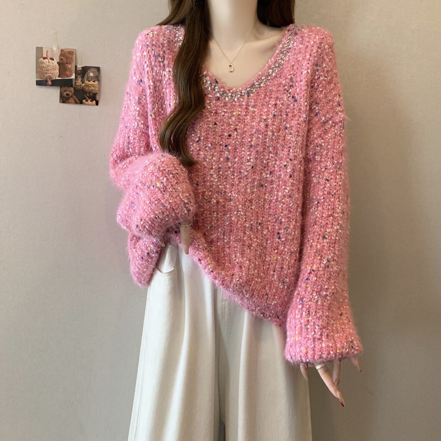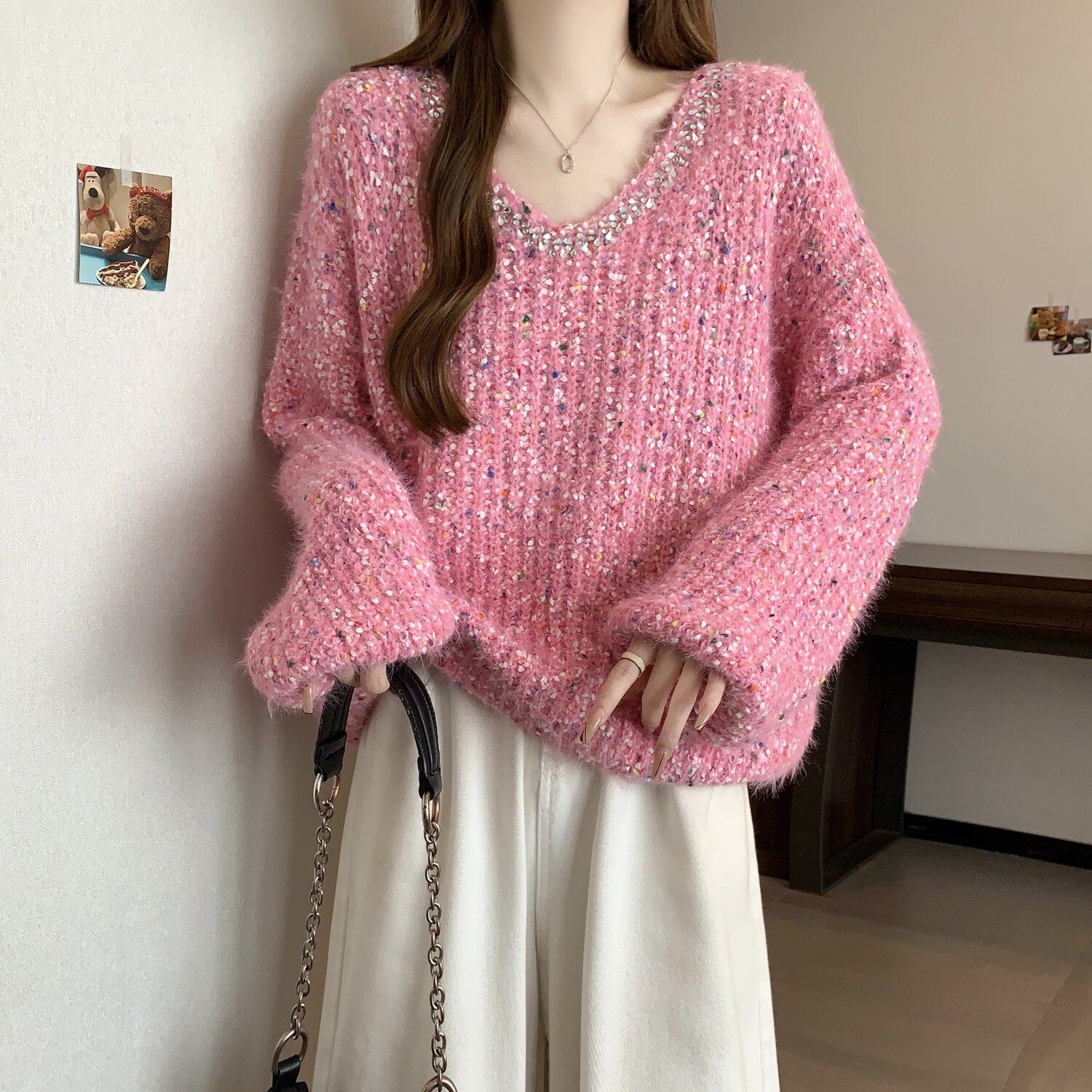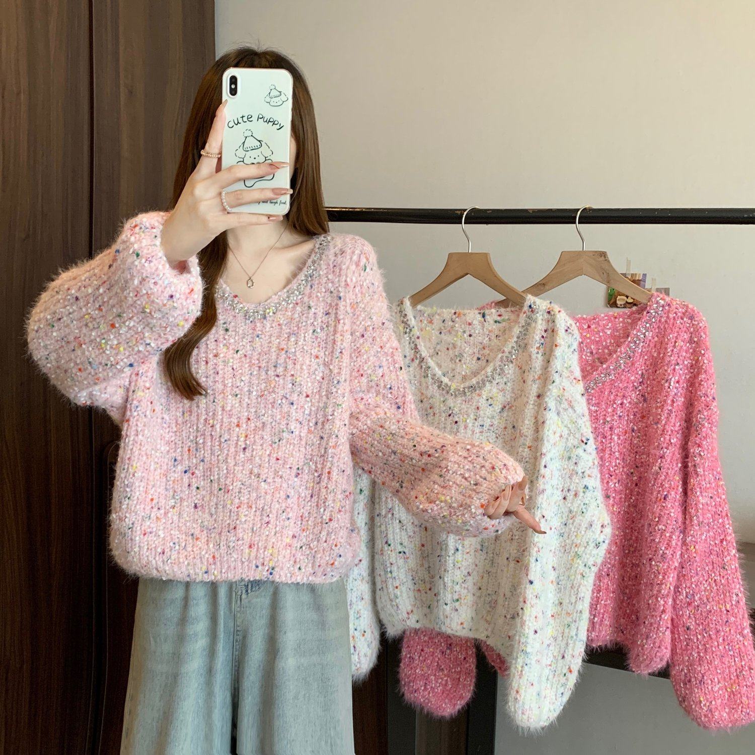 粉色彩點V領毛衣女春秋2025大碼胖mm獨特漂亮上衣重工燙鑽針織衫