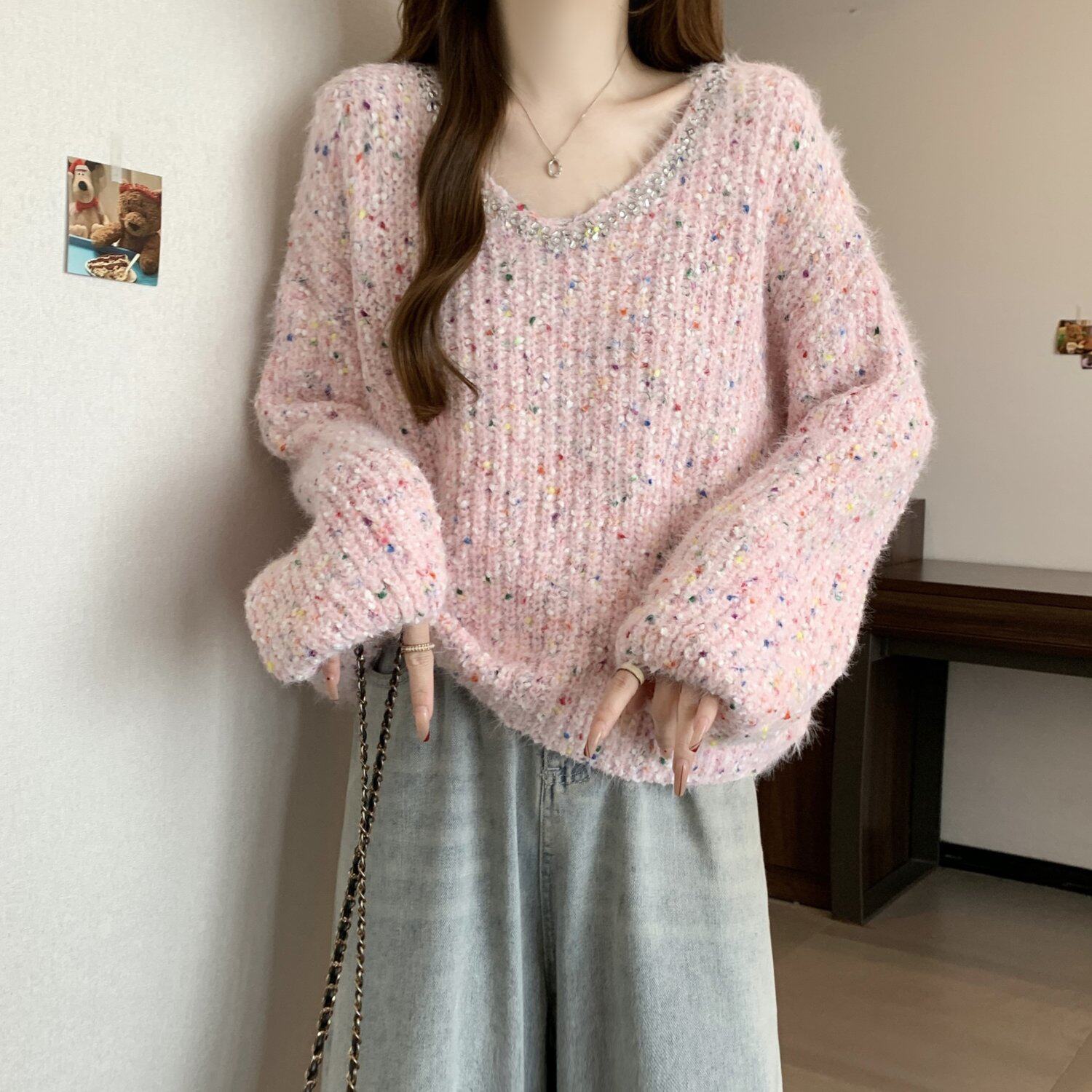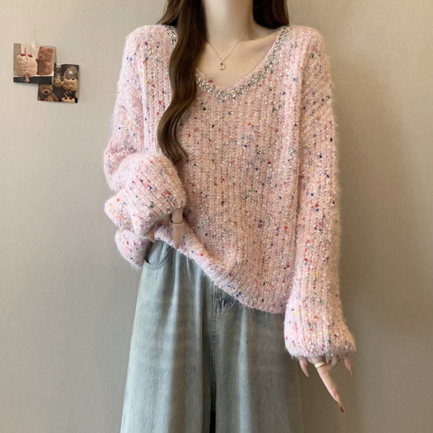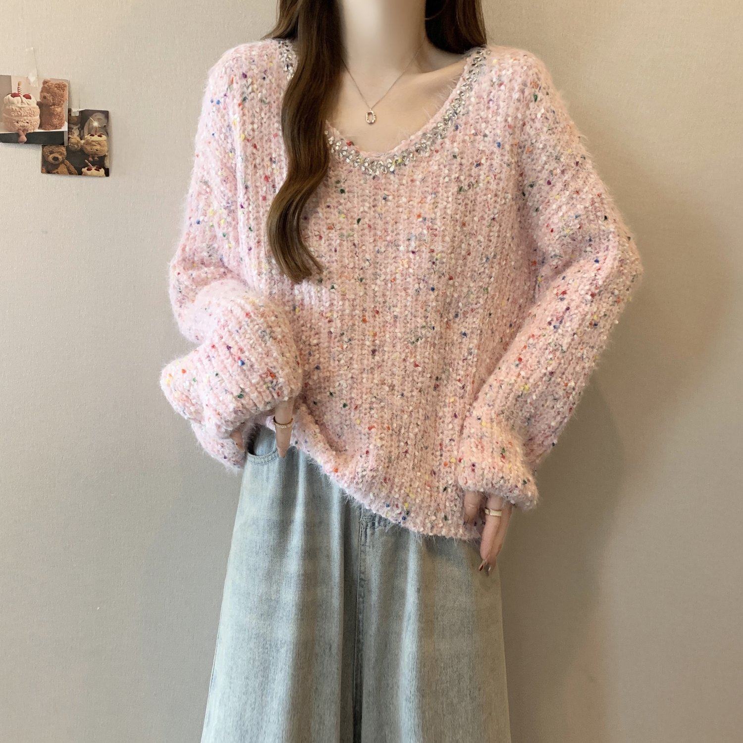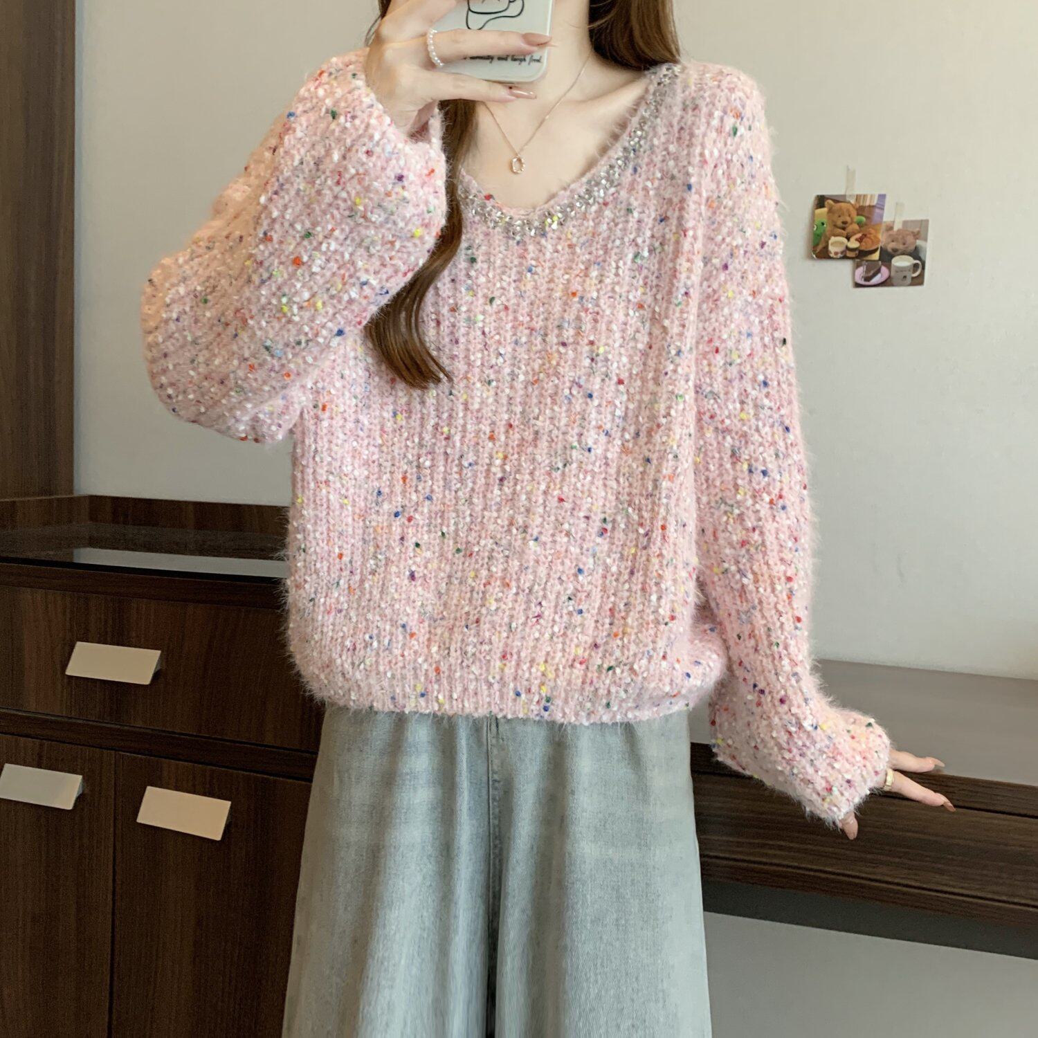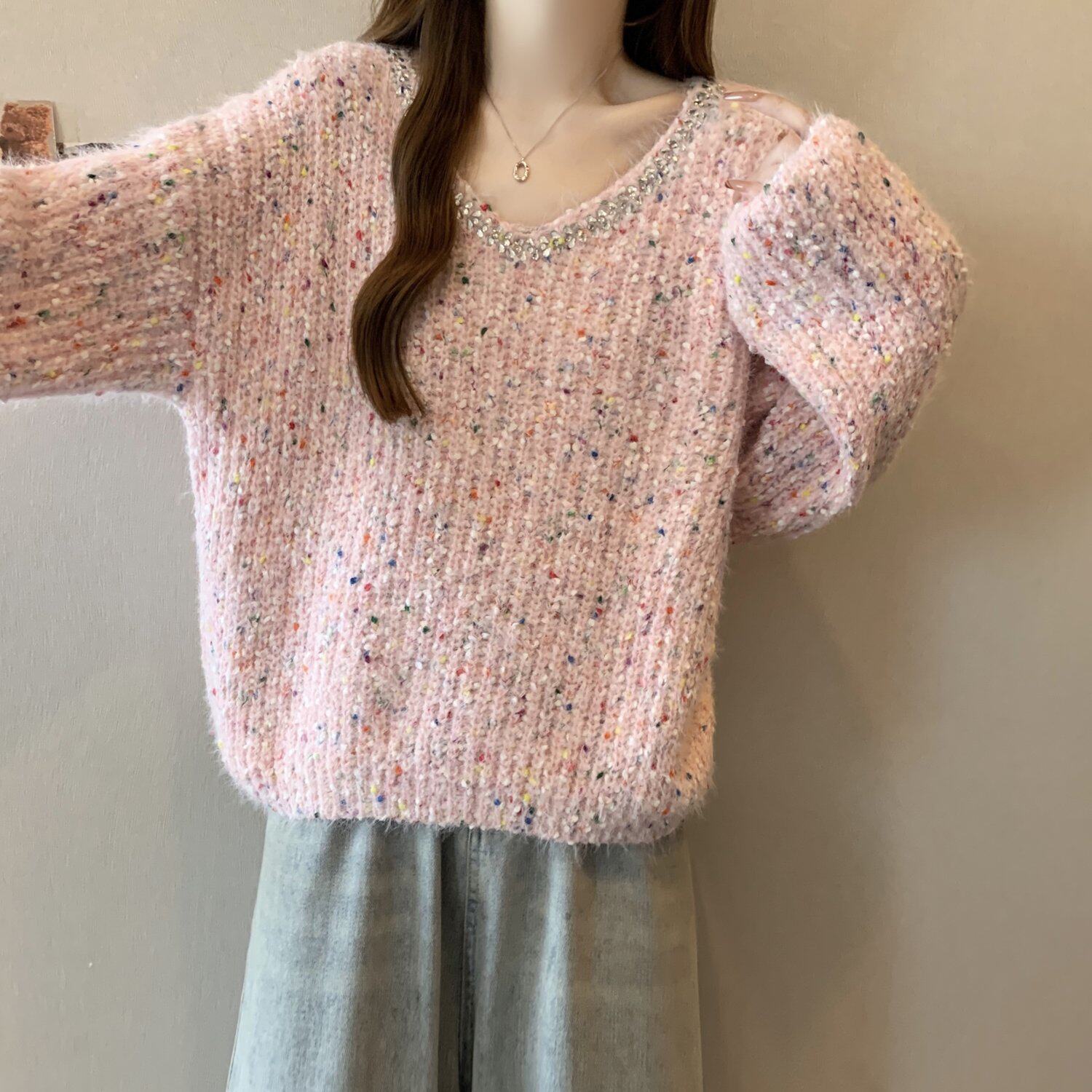 粉色彩點V領毛衣女春秋2025大碼胖mm獨特漂亮上衣重工燙鑽針織衫