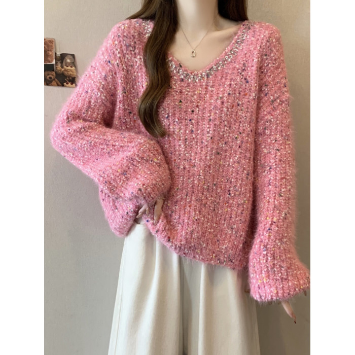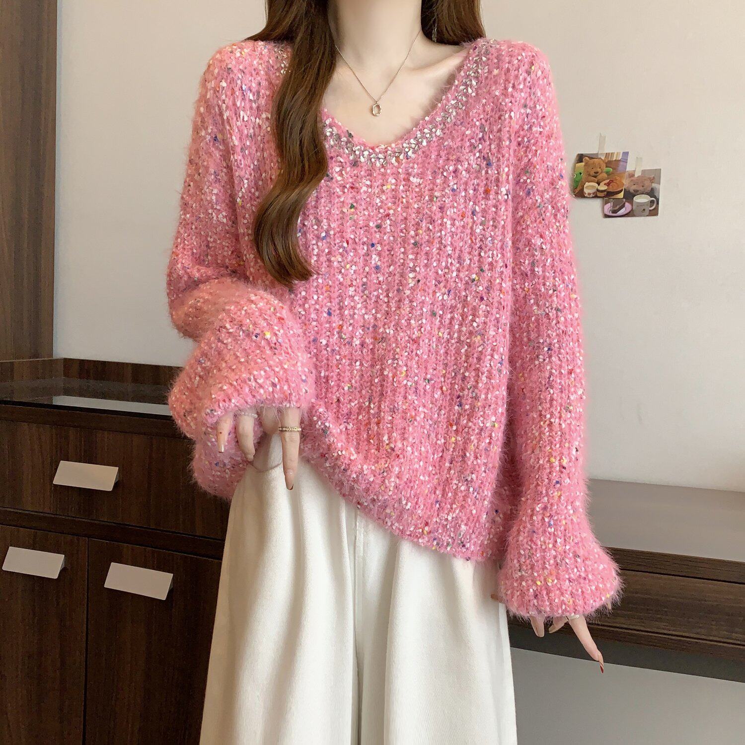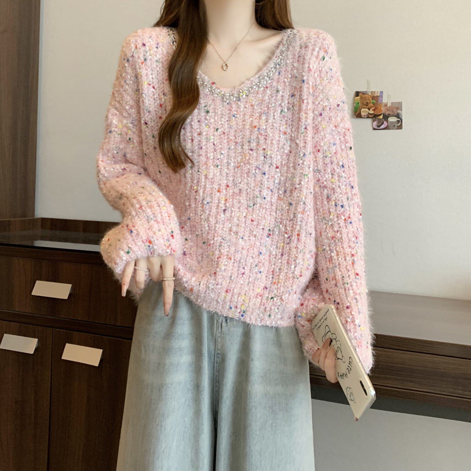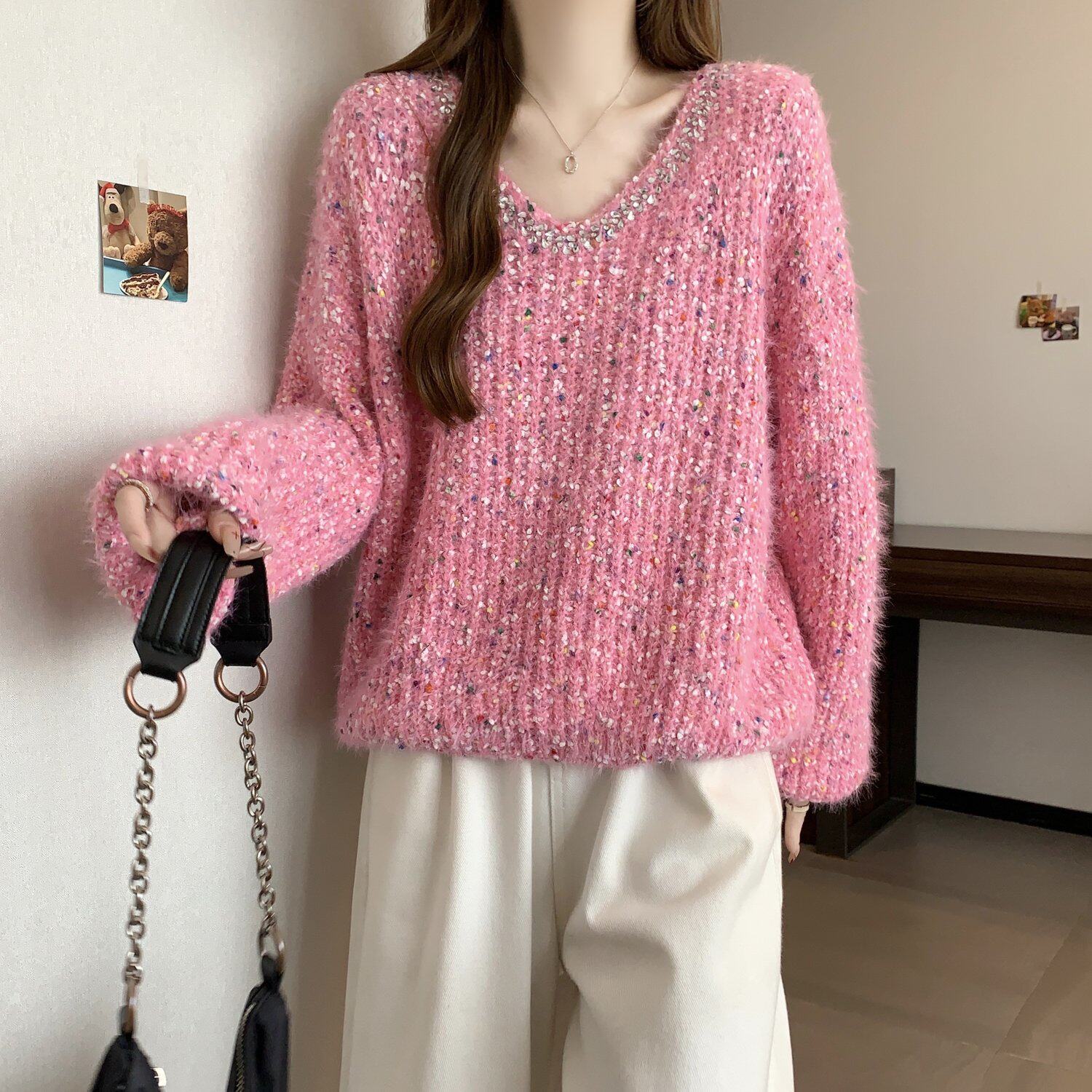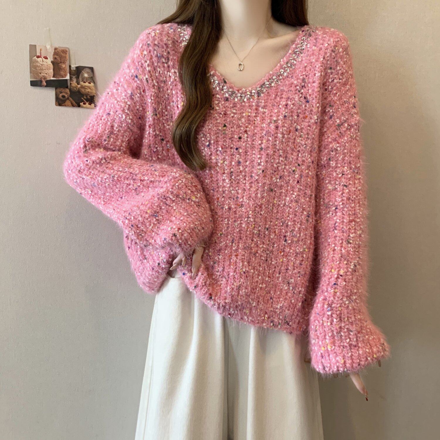 粉色彩點V領毛衣女春秋2025大碼胖mm獨特漂亮上衣重工燙鑽針織衫