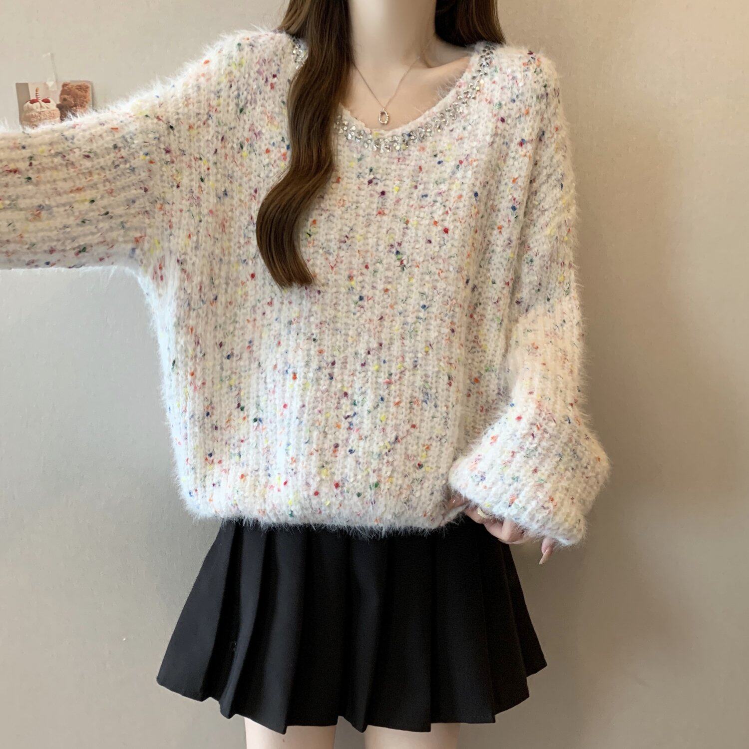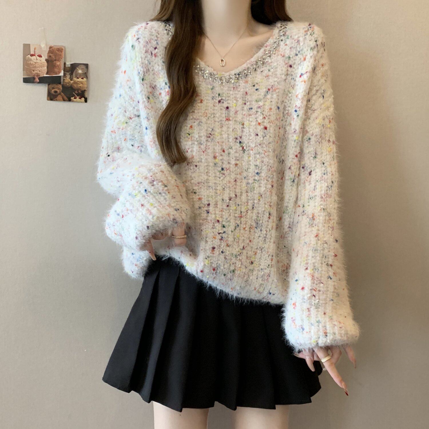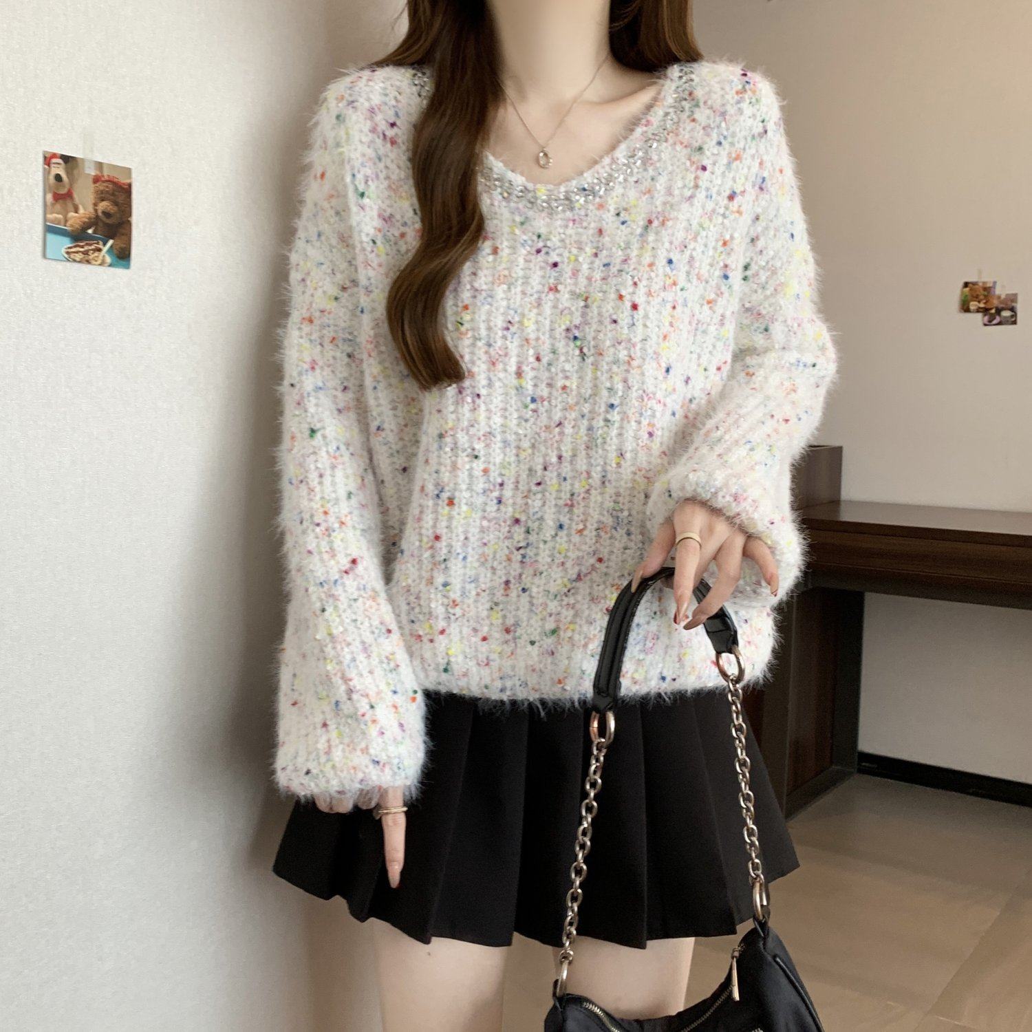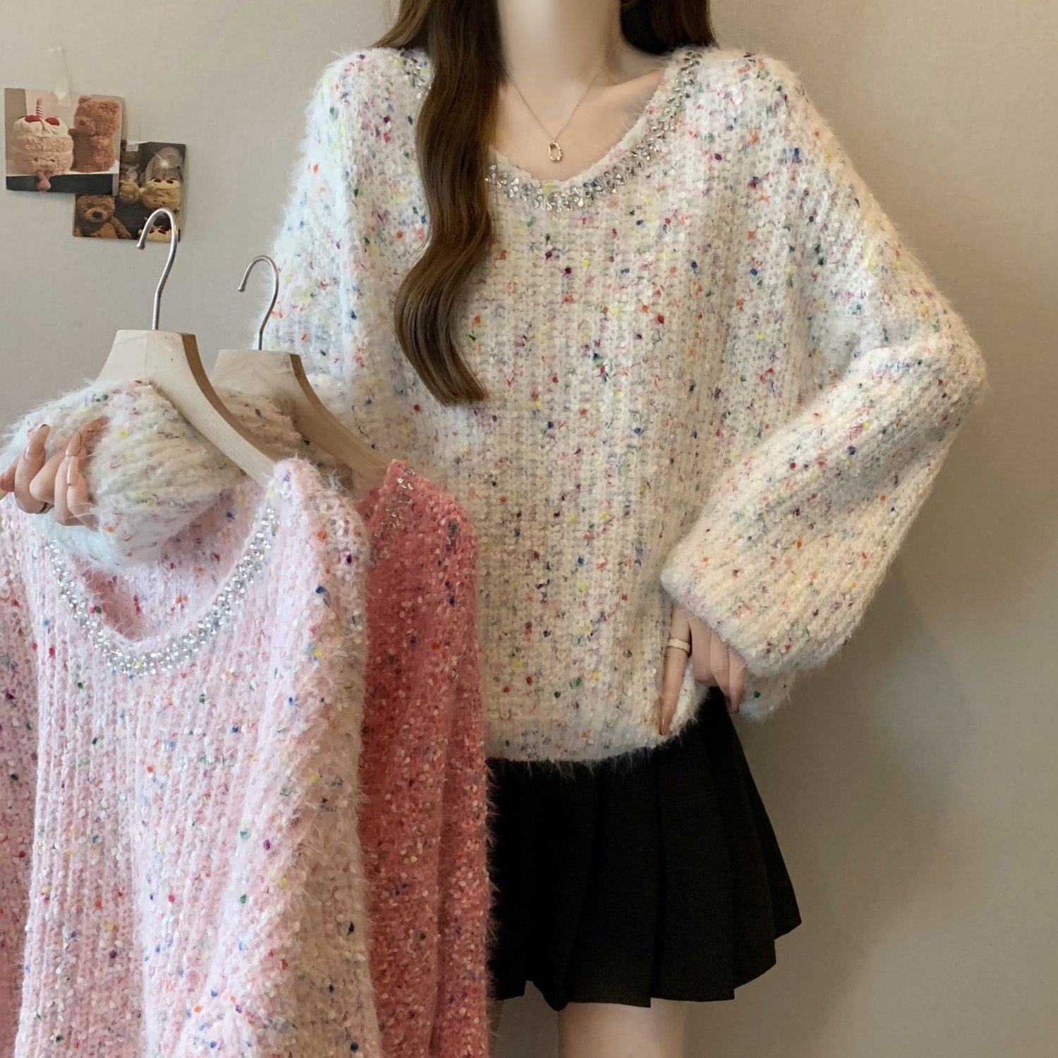 粉色彩點V領毛衣女春秋2025大碼胖mm獨特漂亮上衣重工燙鑽針織衫