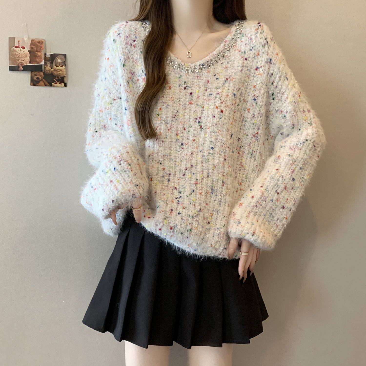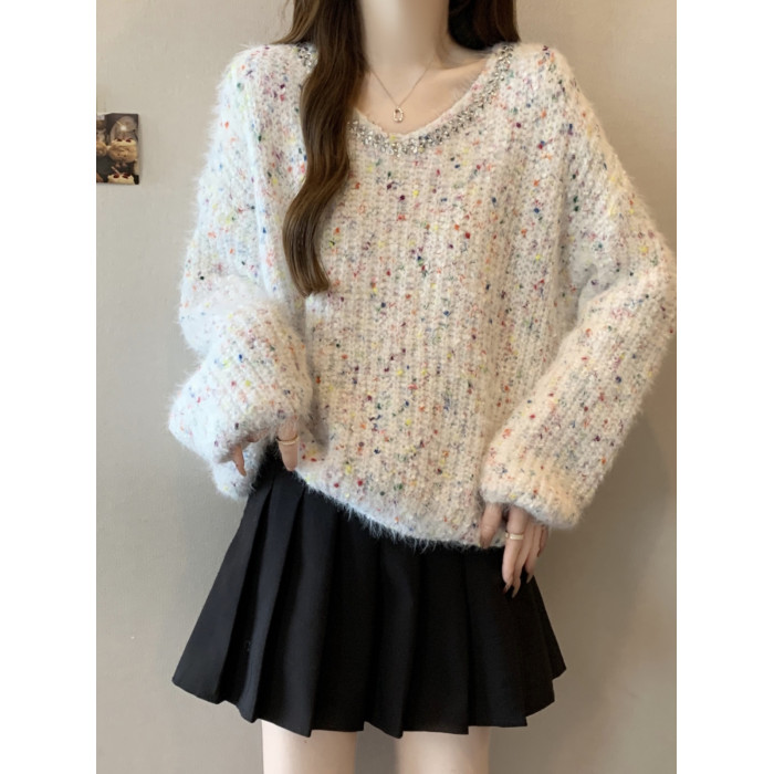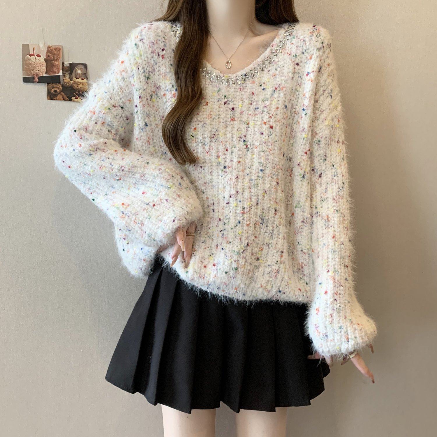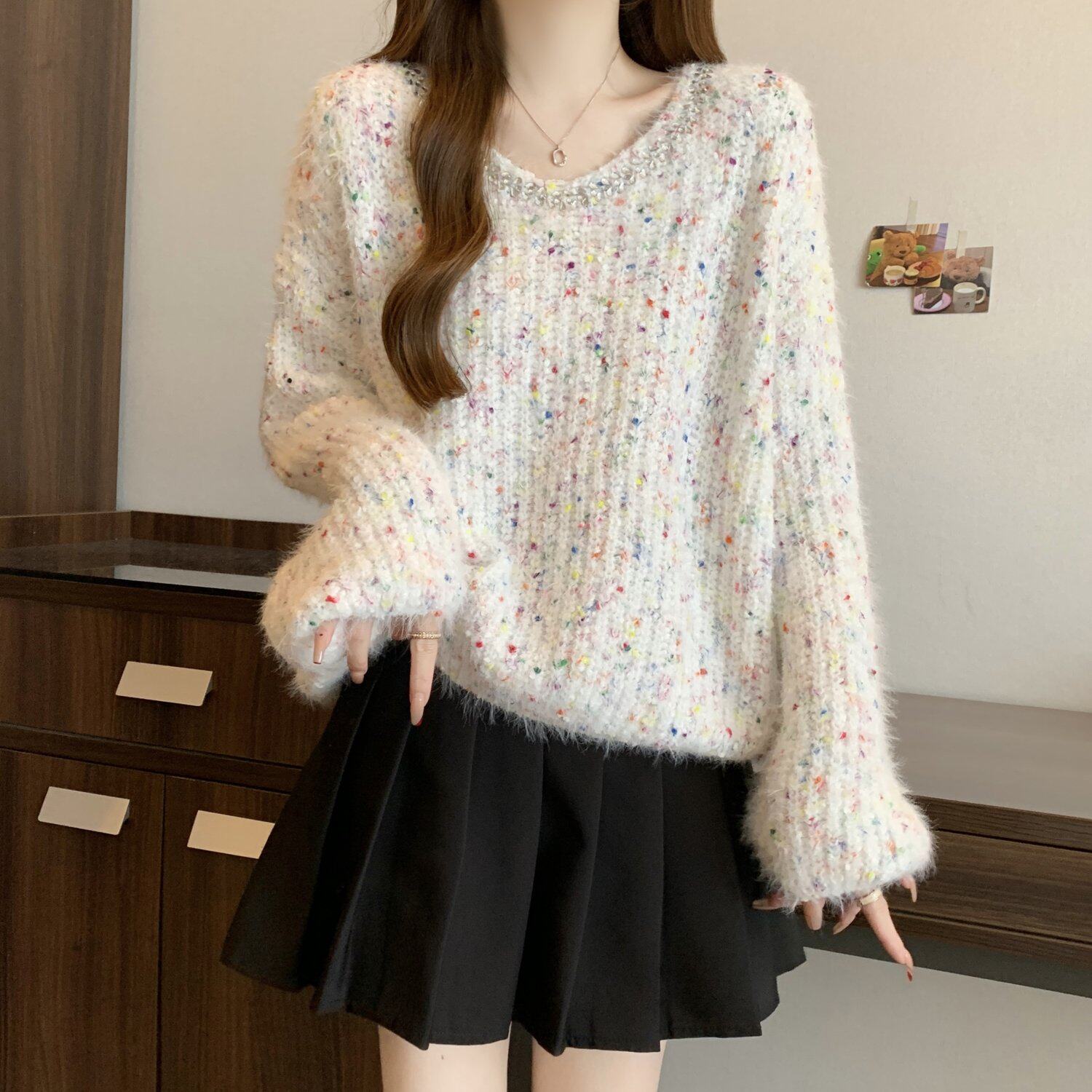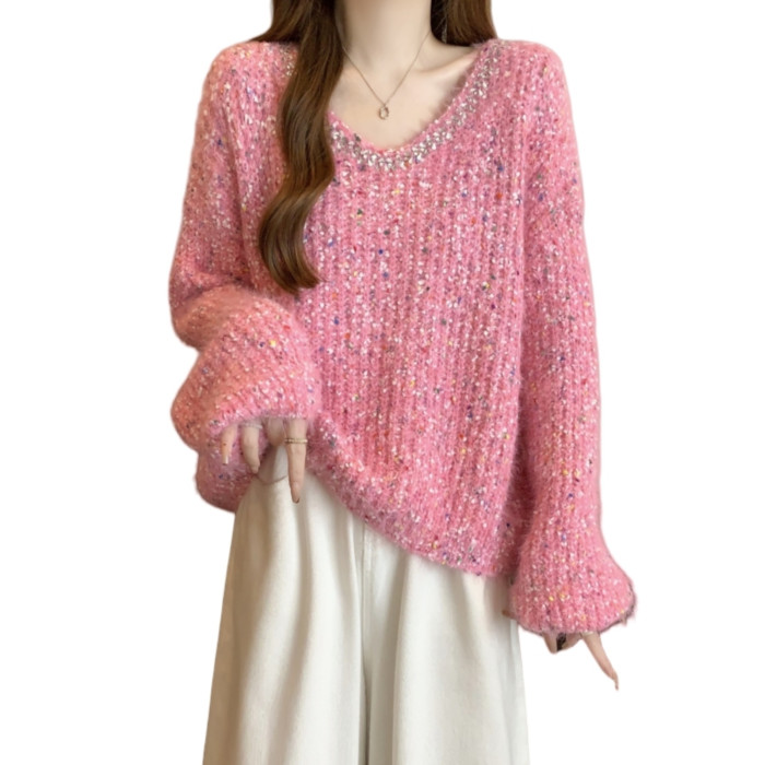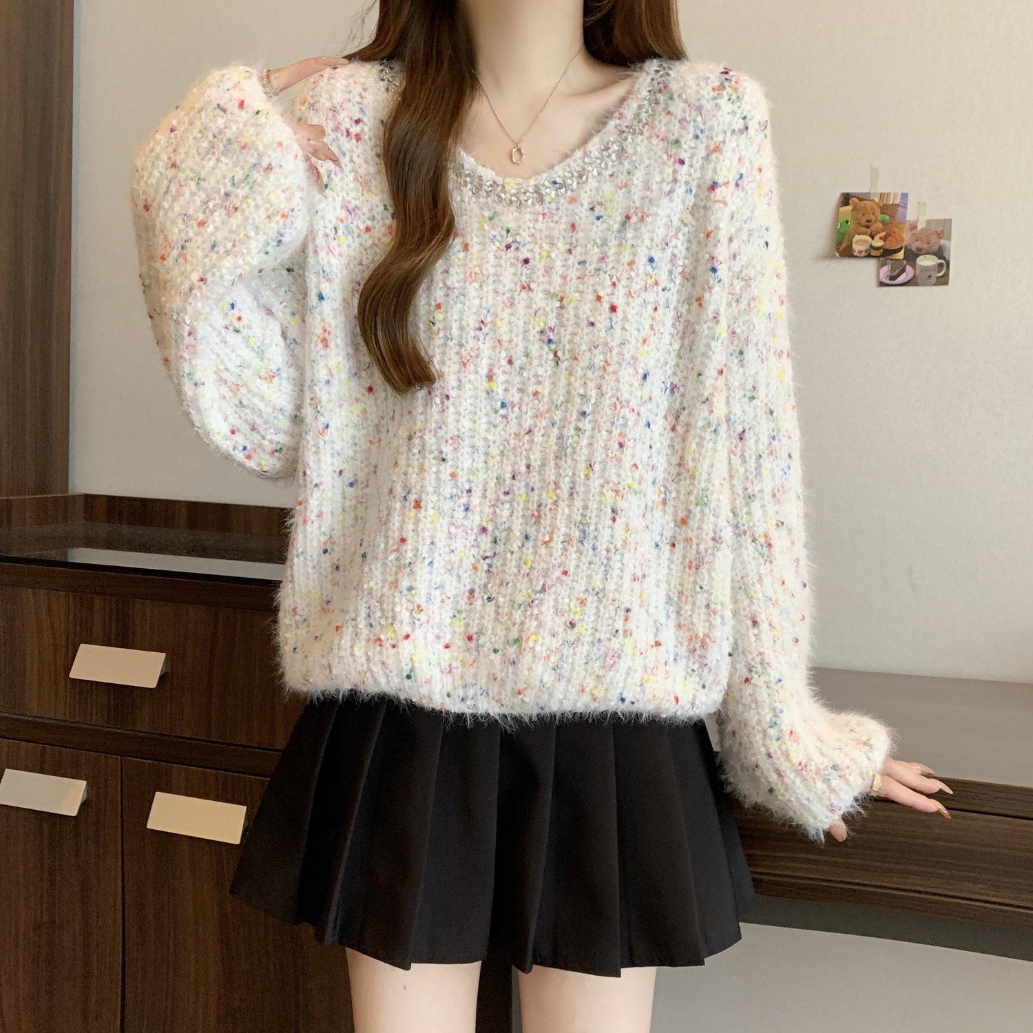 粉色彩點V領毛衣女春秋2025大碼胖mm獨特漂亮上衣重工燙鑽針織衫
