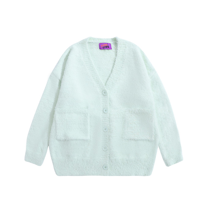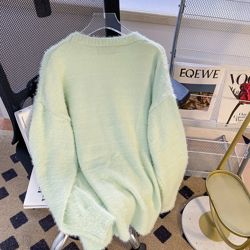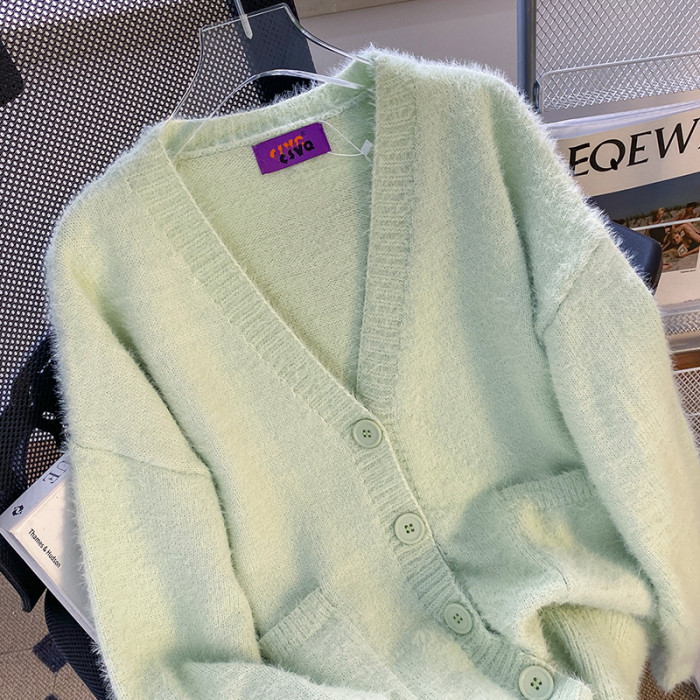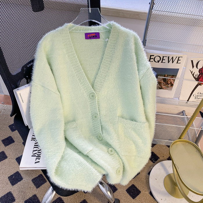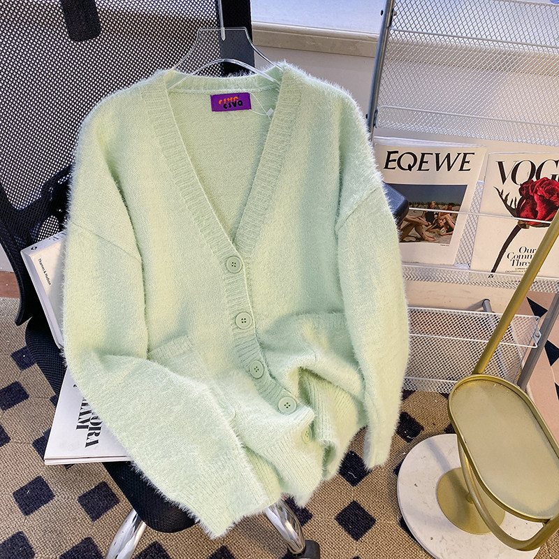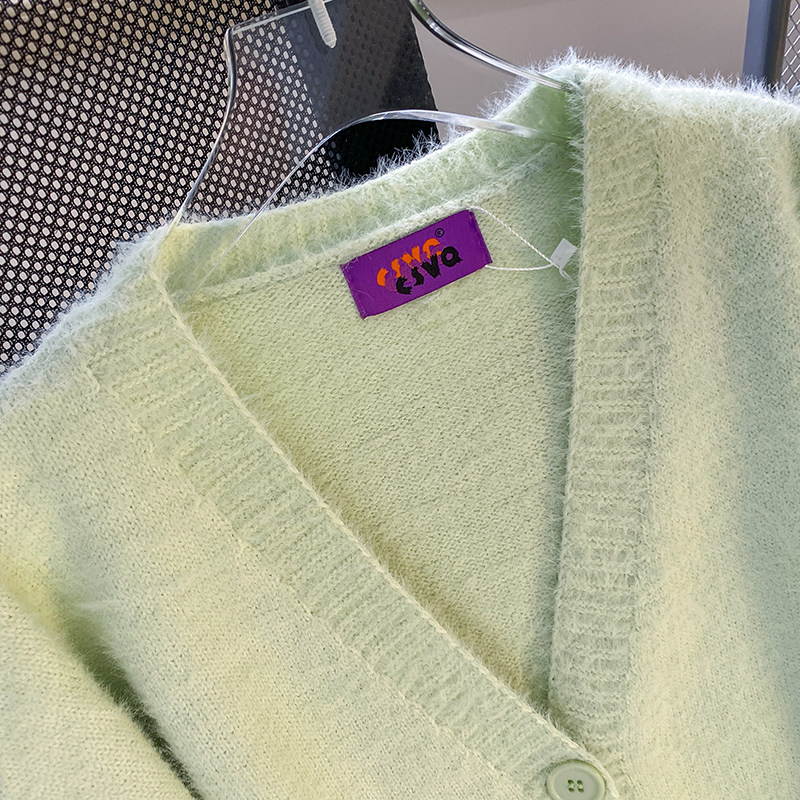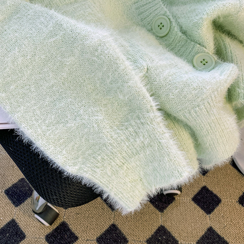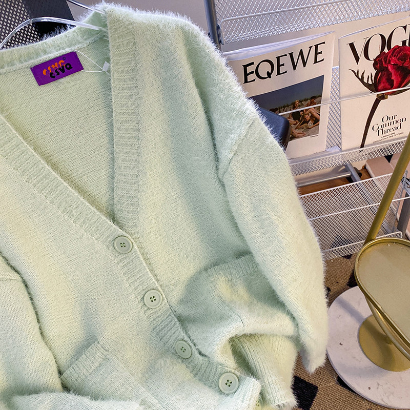 CSVQ薄荷奶綠仿水貂毛V領多色開衫毛衣女軟糯慵懶風針織秋冬外套