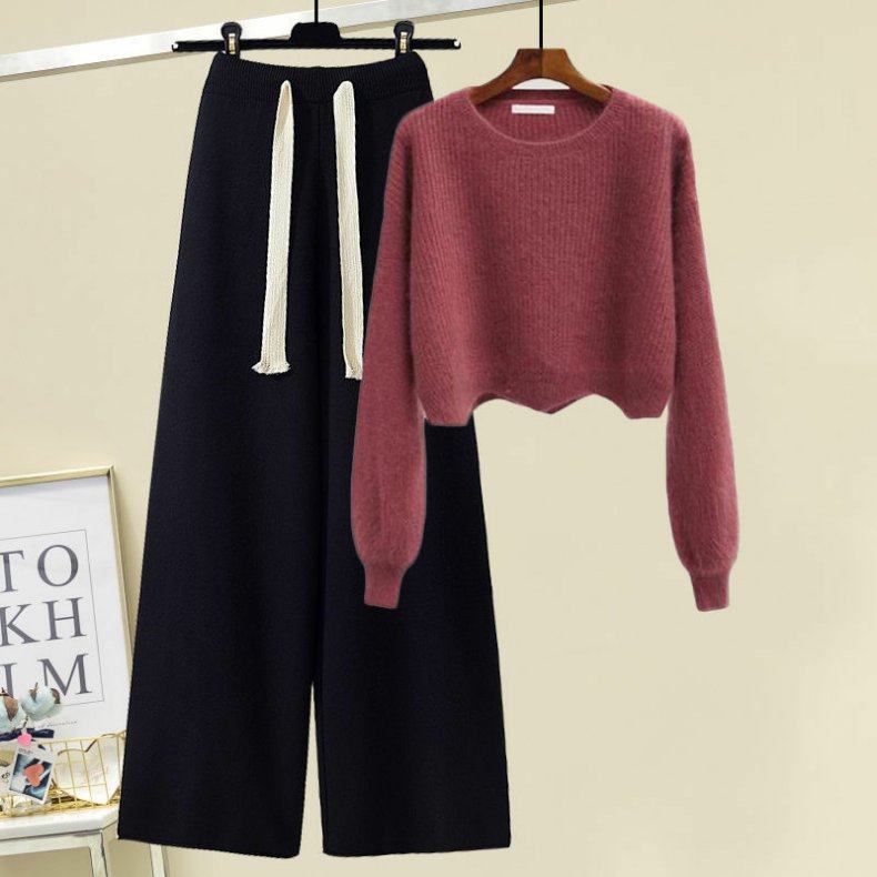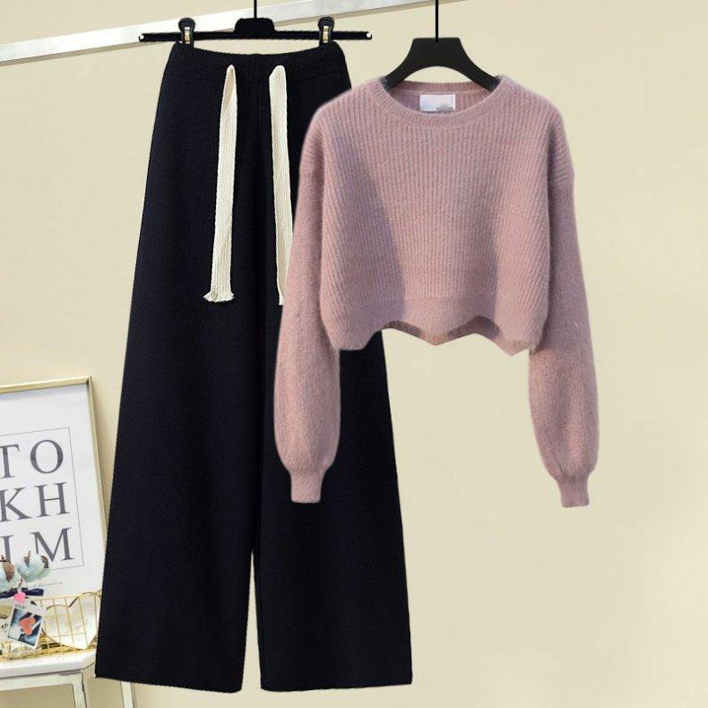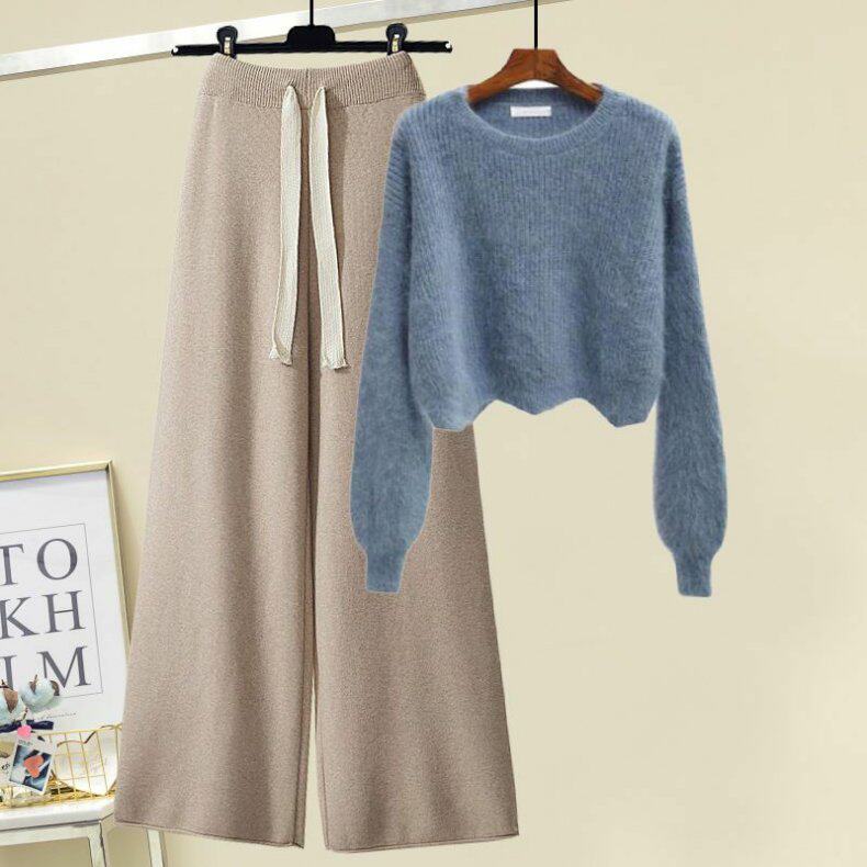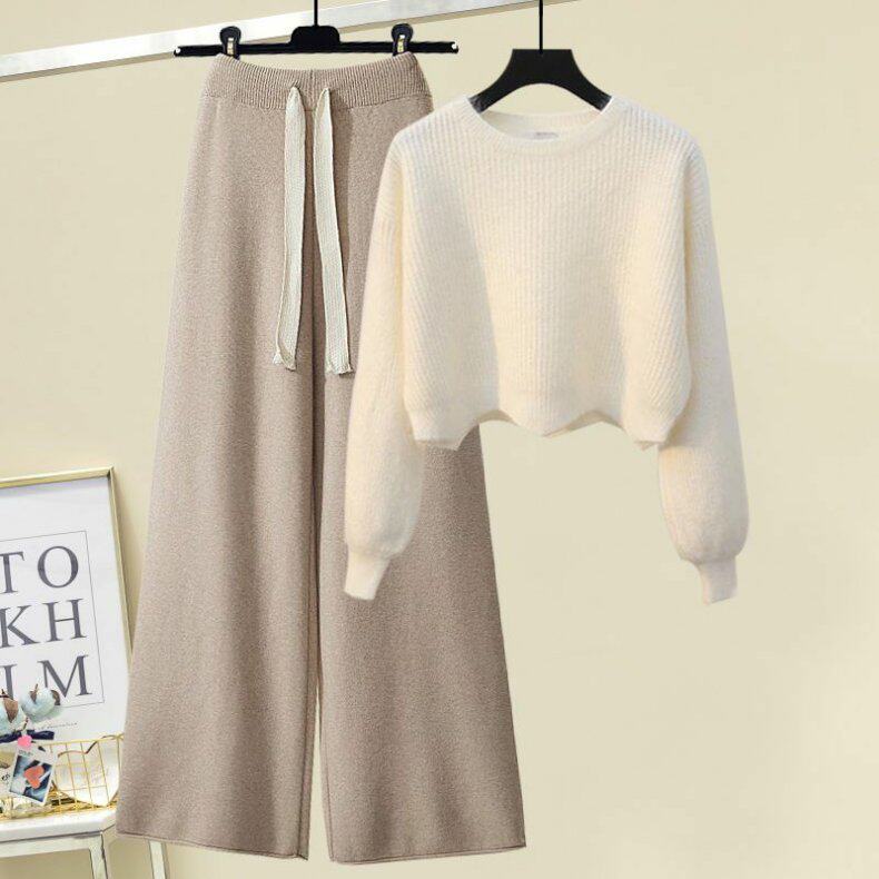 針織毛衣女秋冬新款休閒時尚設計感奶系穿搭顯瘦高腰濶腿褲兩件套