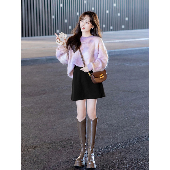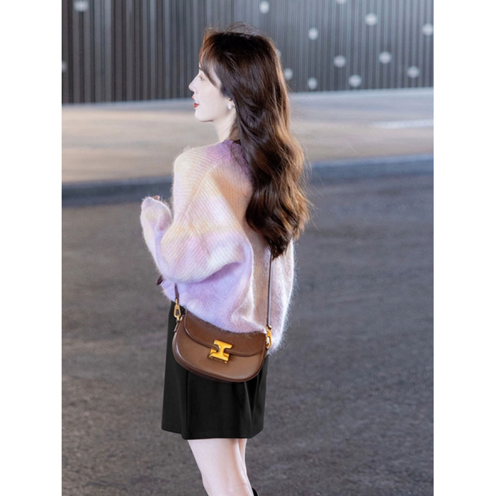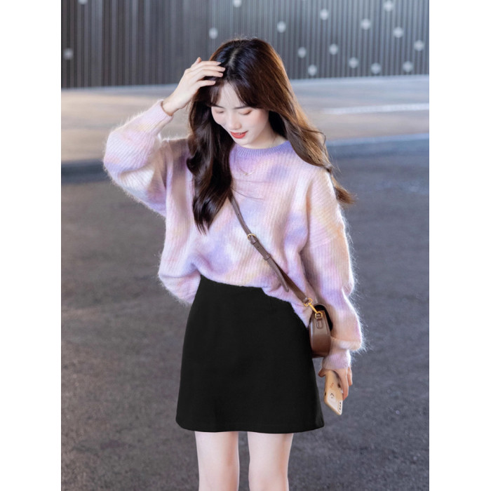 紫色高級感紥染打底毛衣女士秋冬季新款慵懶風外穿長袖針織衫上衣