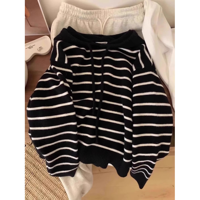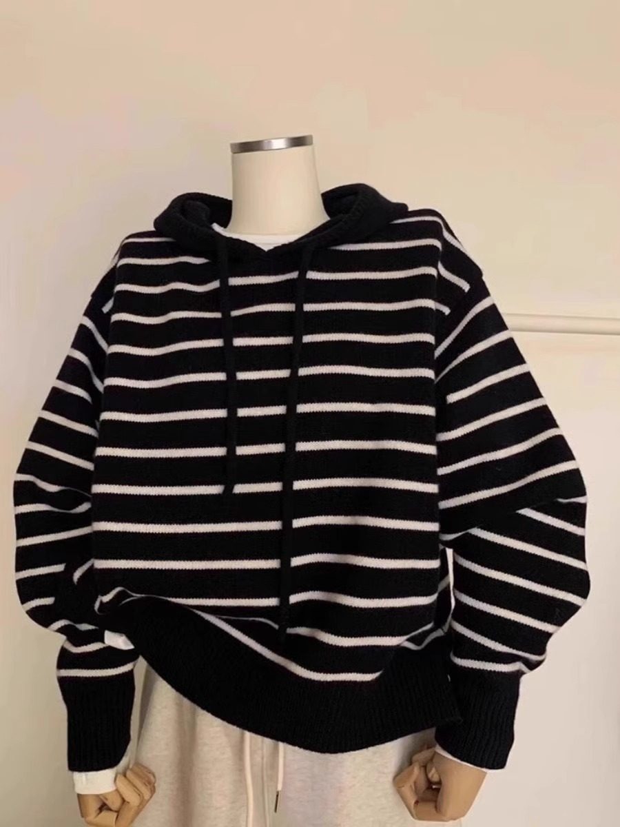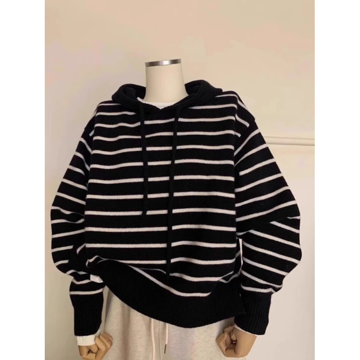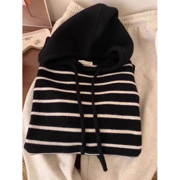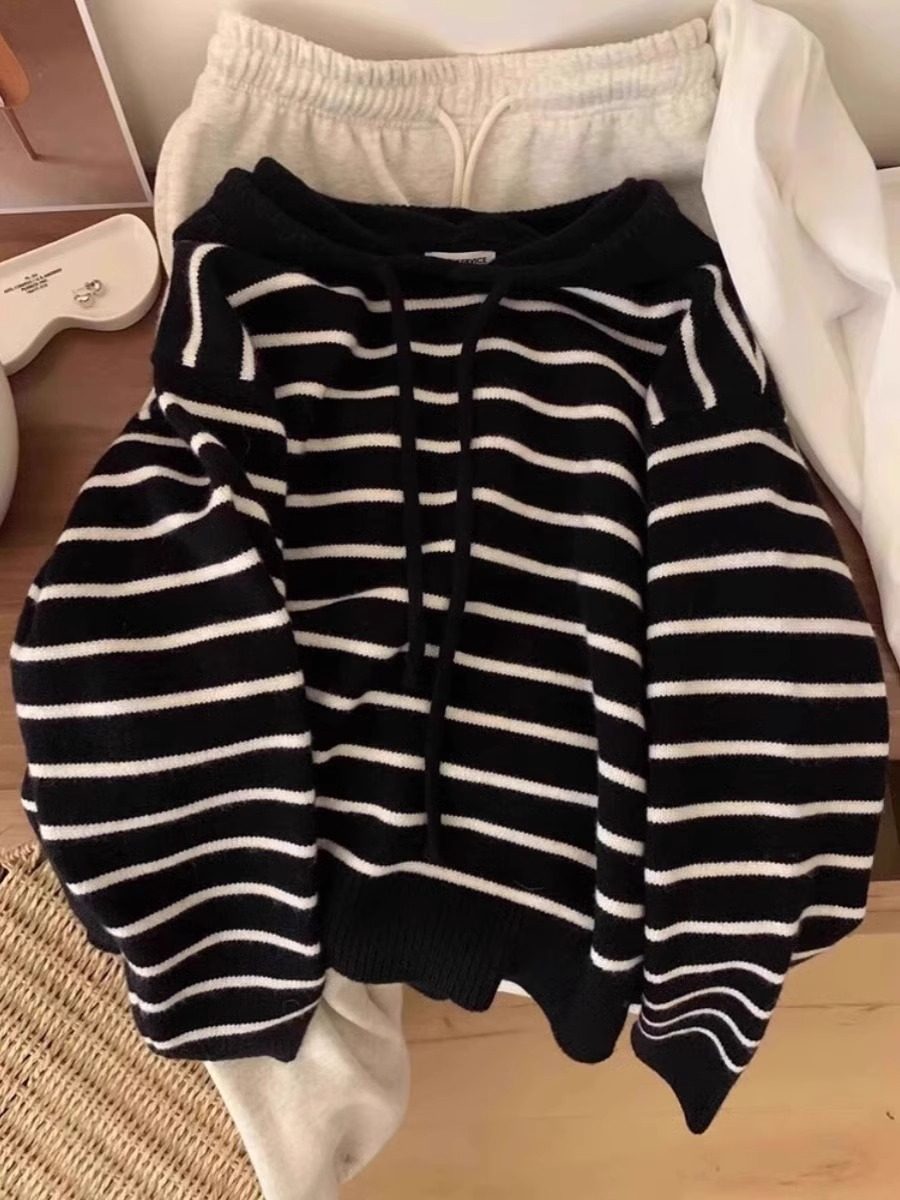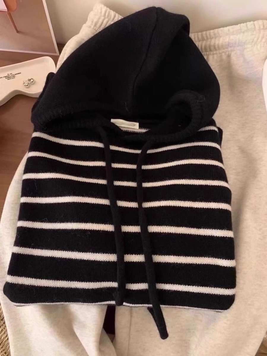 秋冬新款溫柔風撞色條紋連帽針織衫衛衣女內搭韓系軟糯毛衣上衣厚