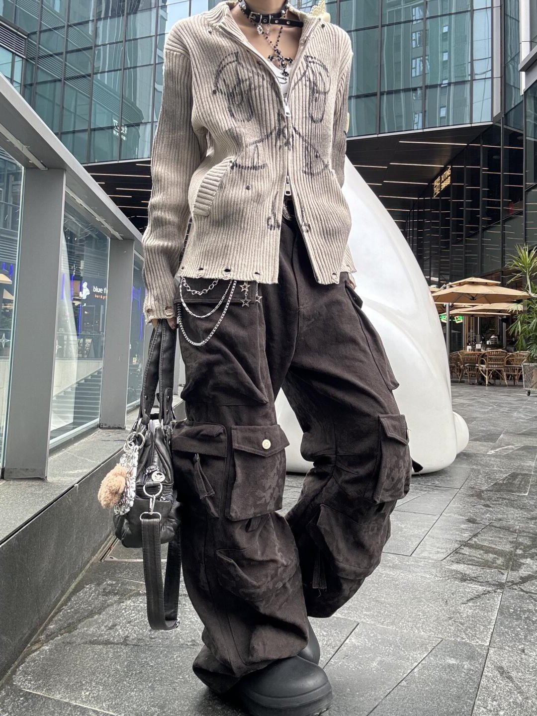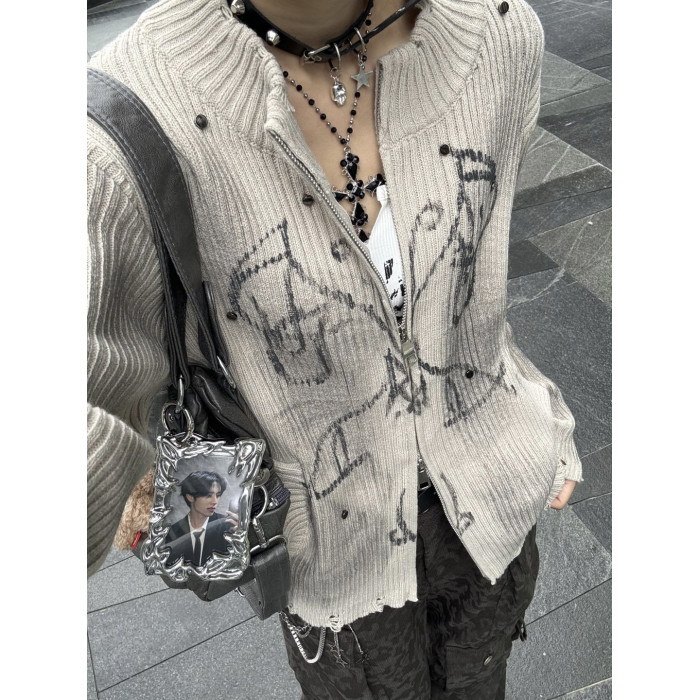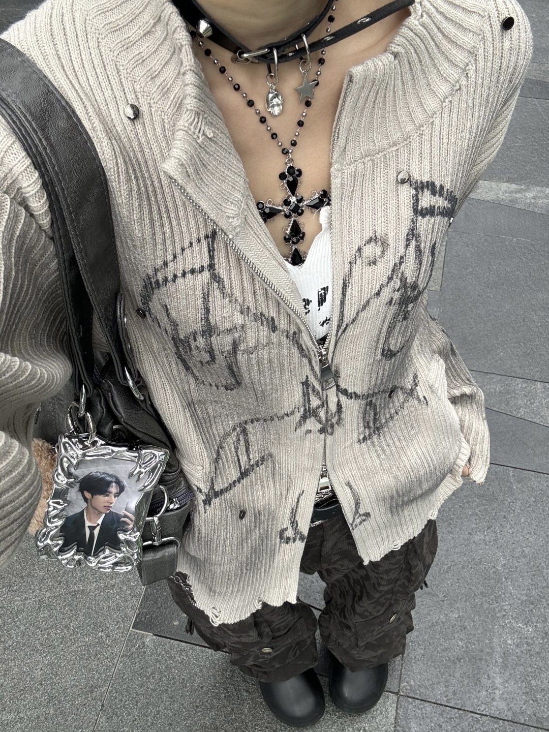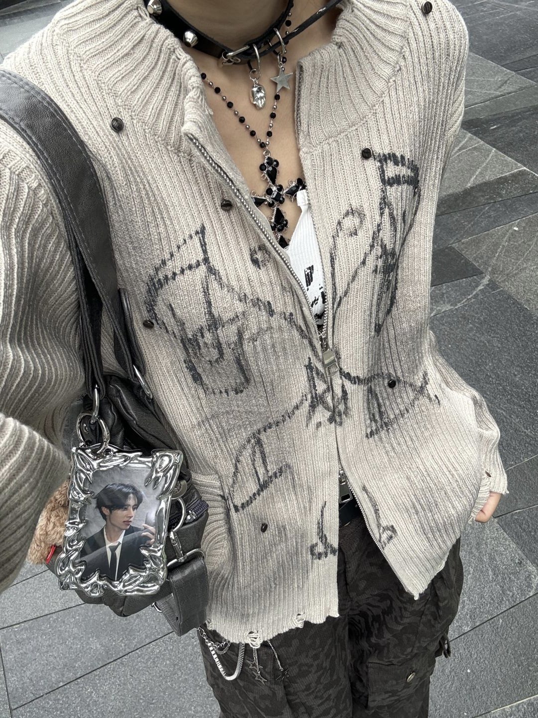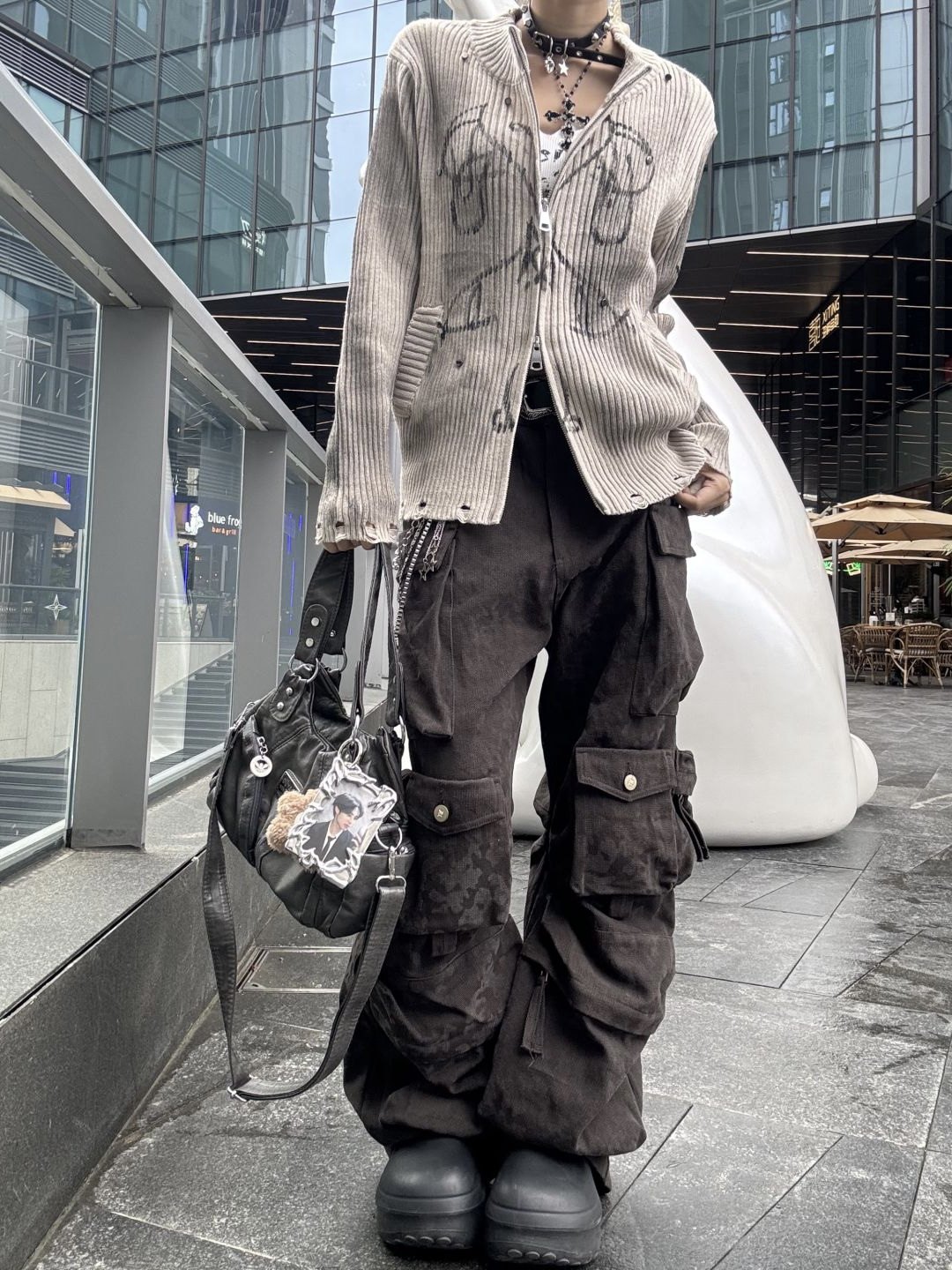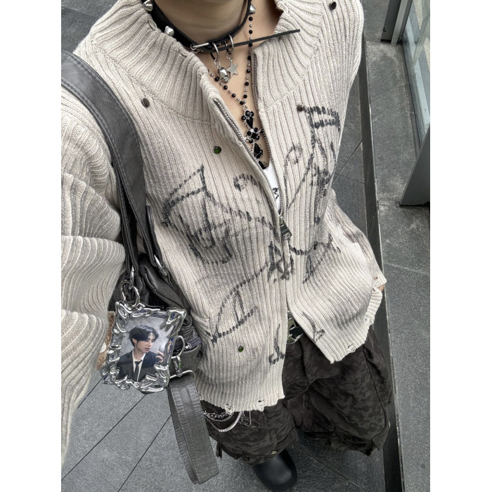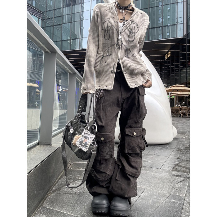 原創美式復古水洗做舊開衫毛衣男女秋冬季高街寬松休閒針織衫外套
