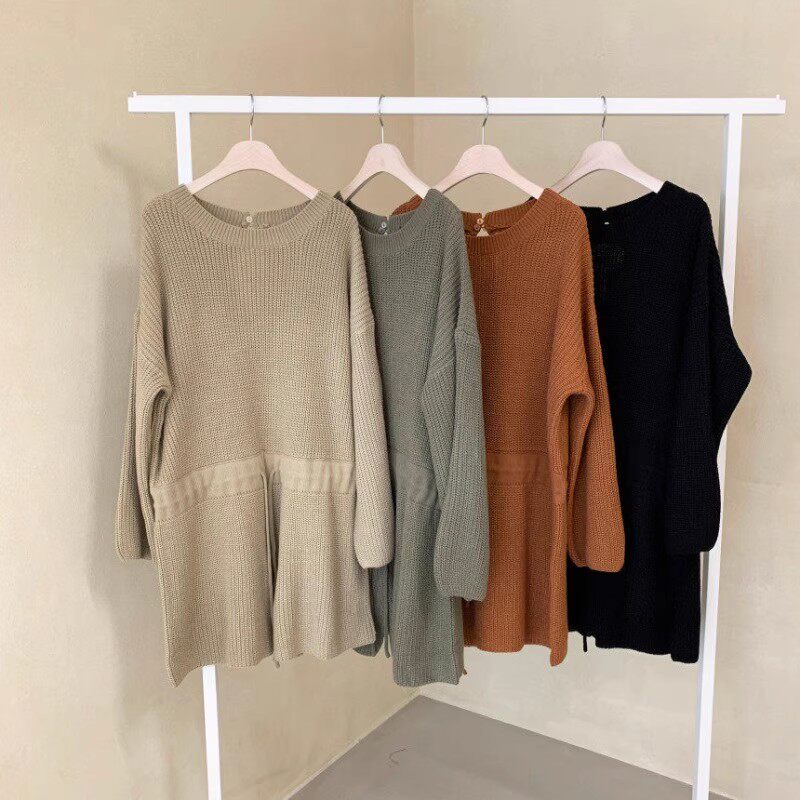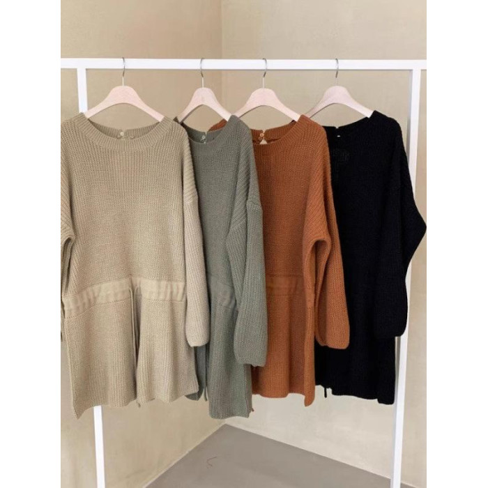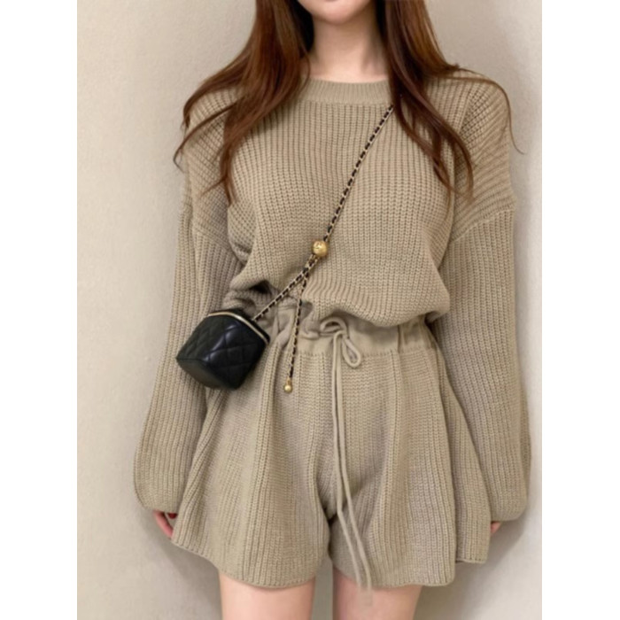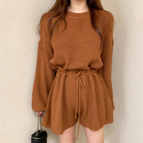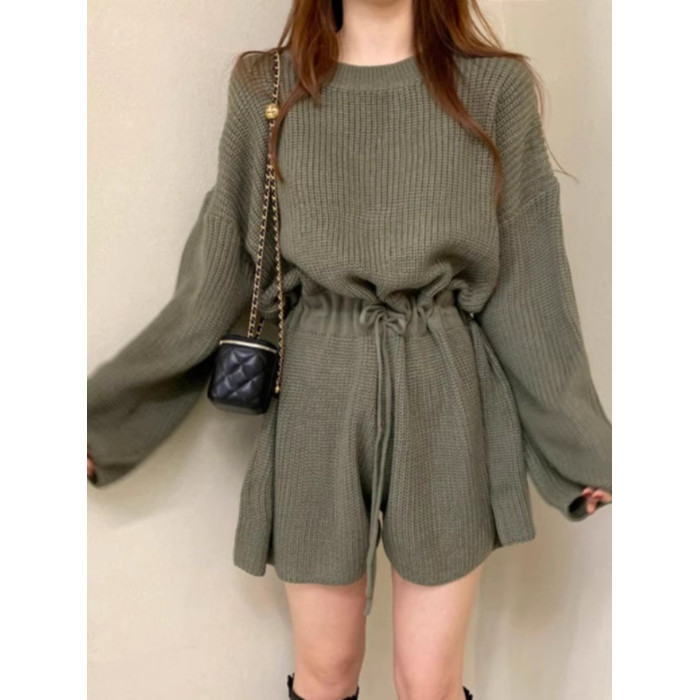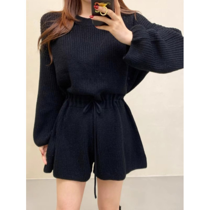 韓國chic春秋復古氣質圓領抽繩系帶收腰顯瘦針織連體褲濶腿短褲女