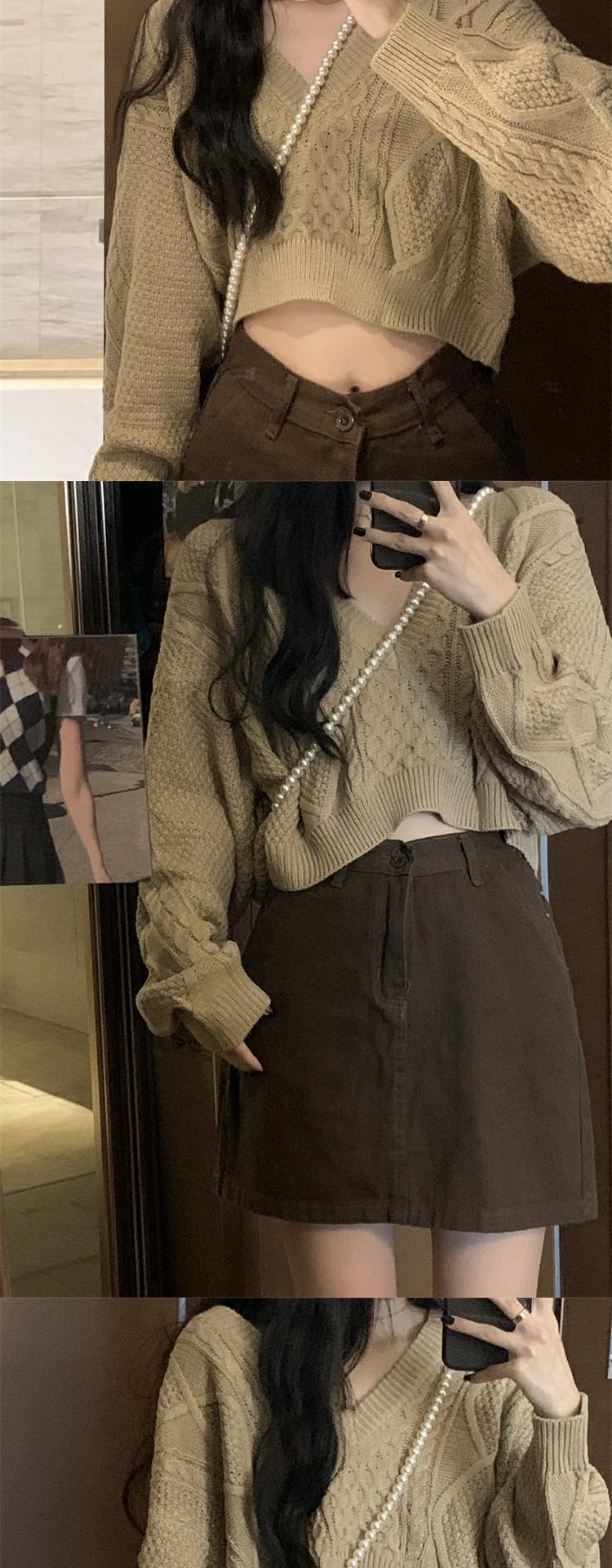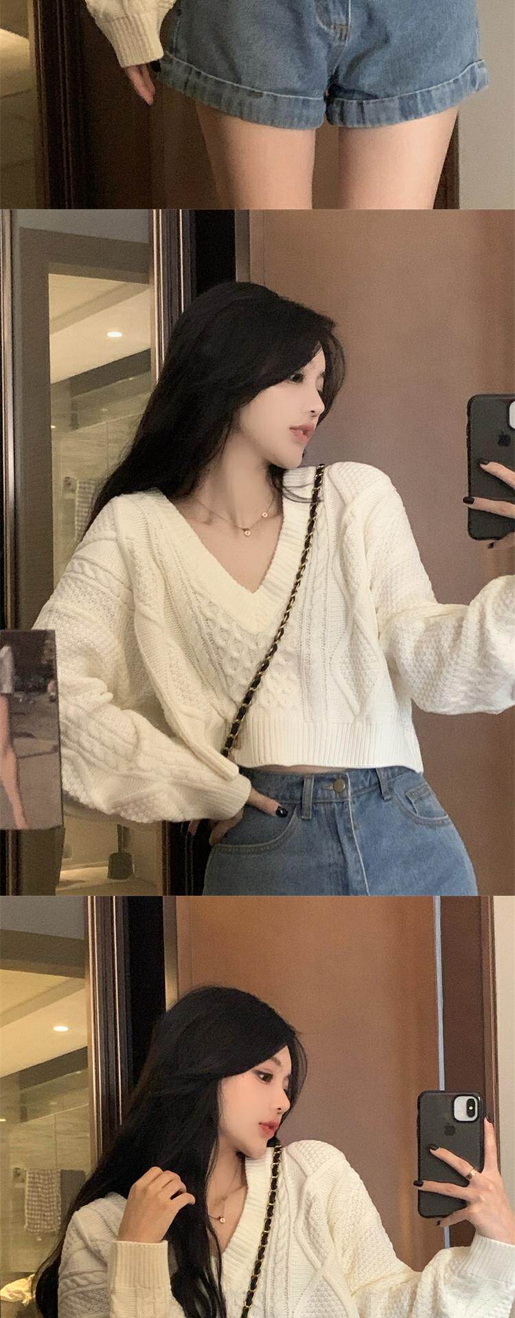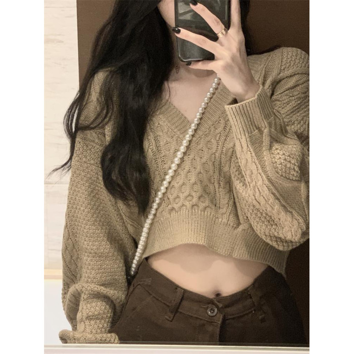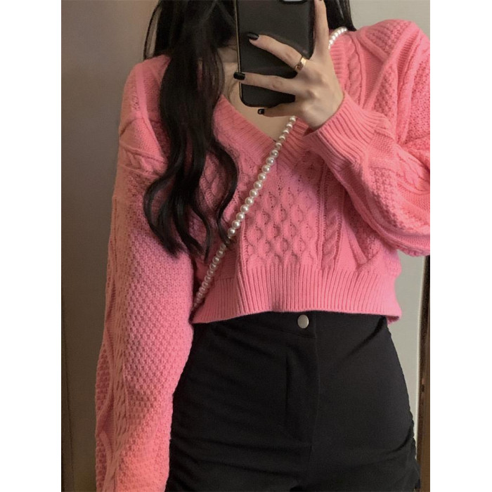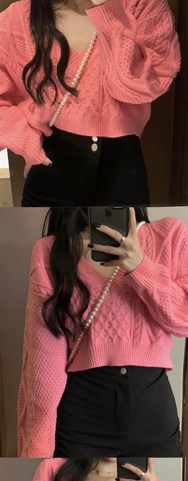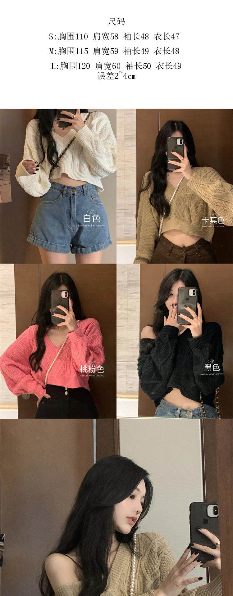 麻花毛衣罩衫女裝秋季2022年新款針織衫v領短款寬松外穿長袖上衣