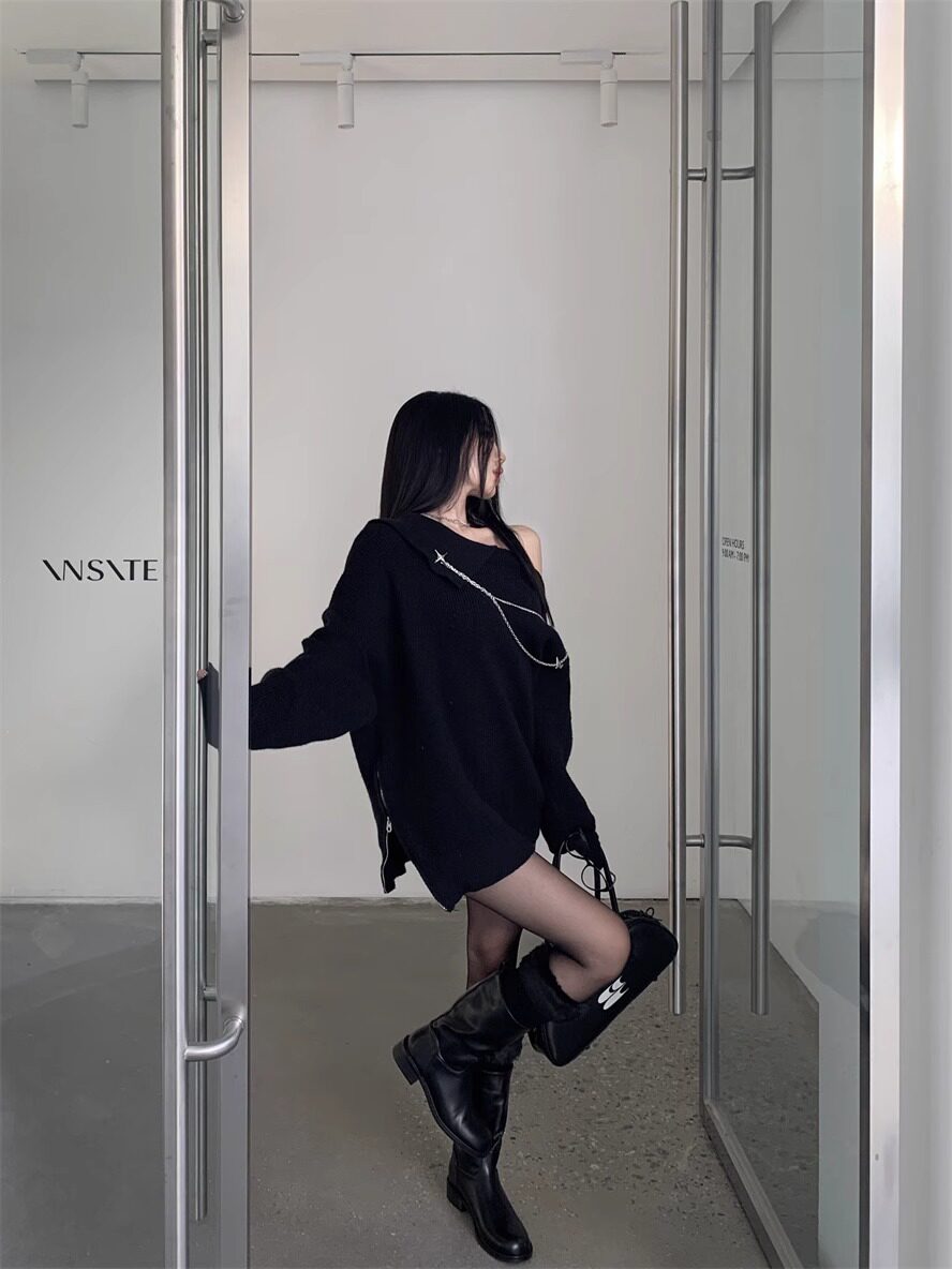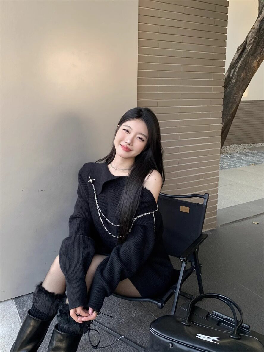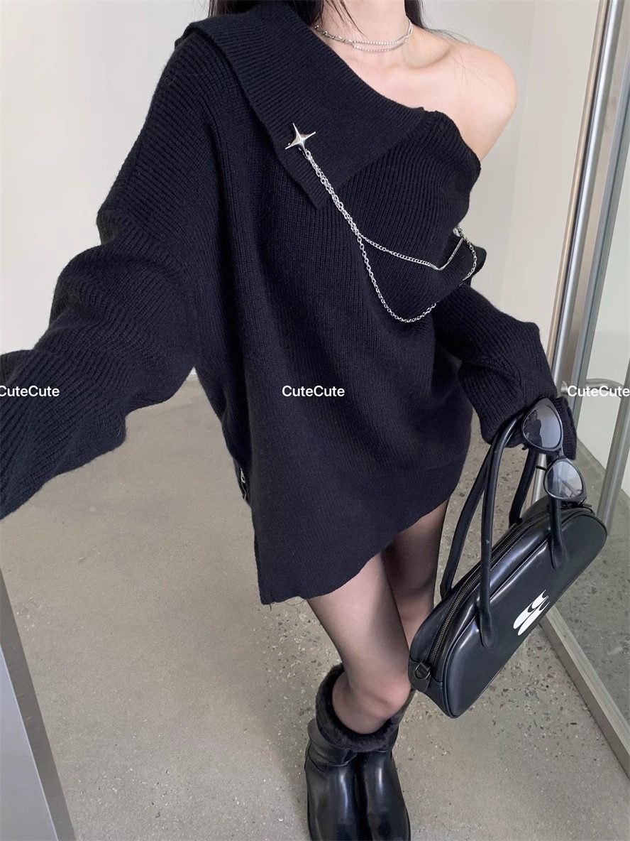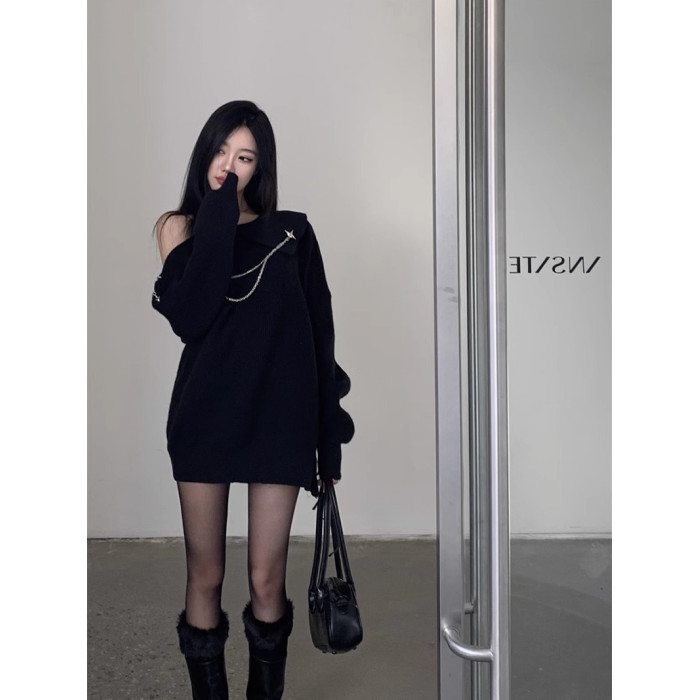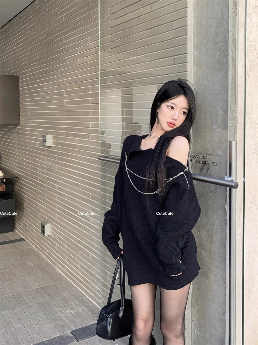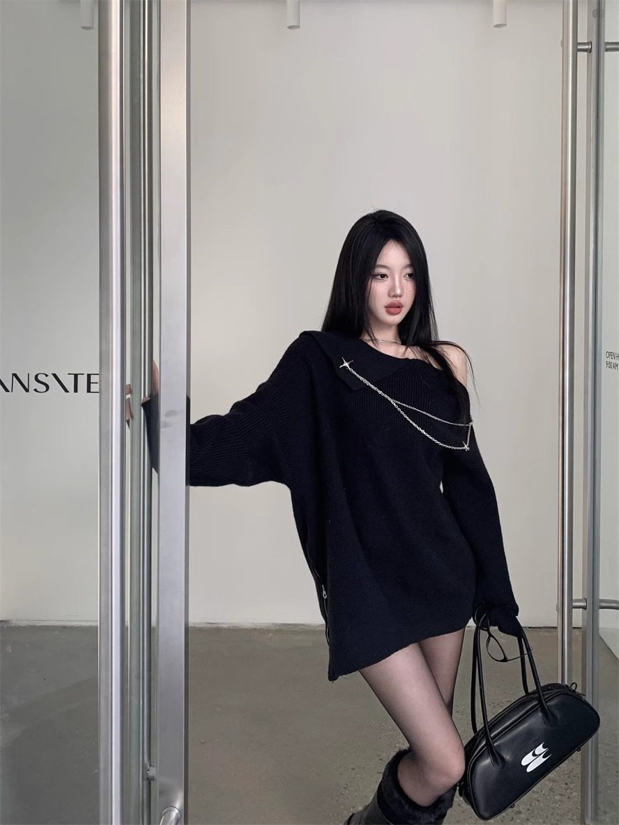純欲風甜美設計感拉鍊露肩鏈條胸針中長款毛衣女秋冬慵懶針織上衣