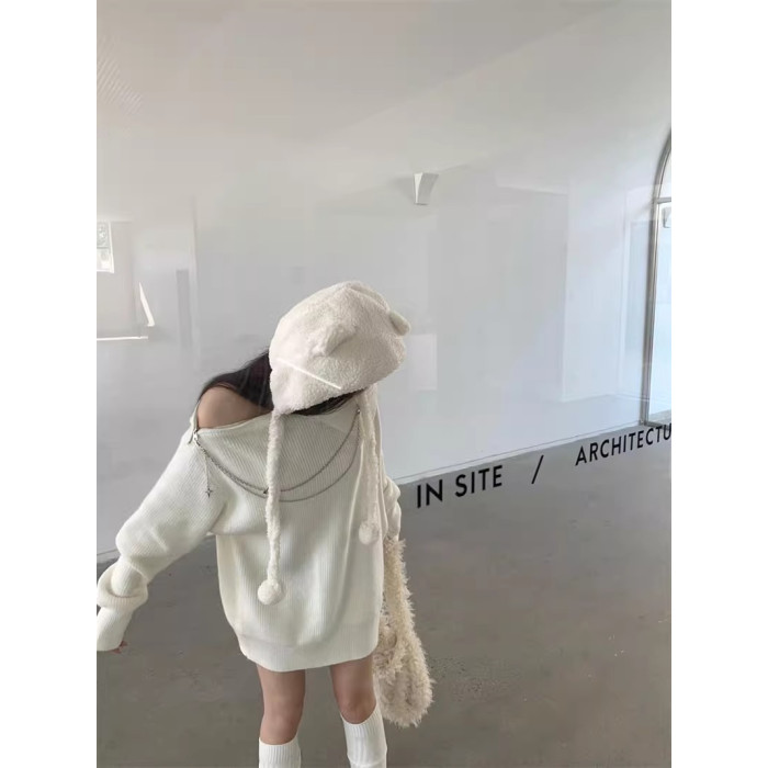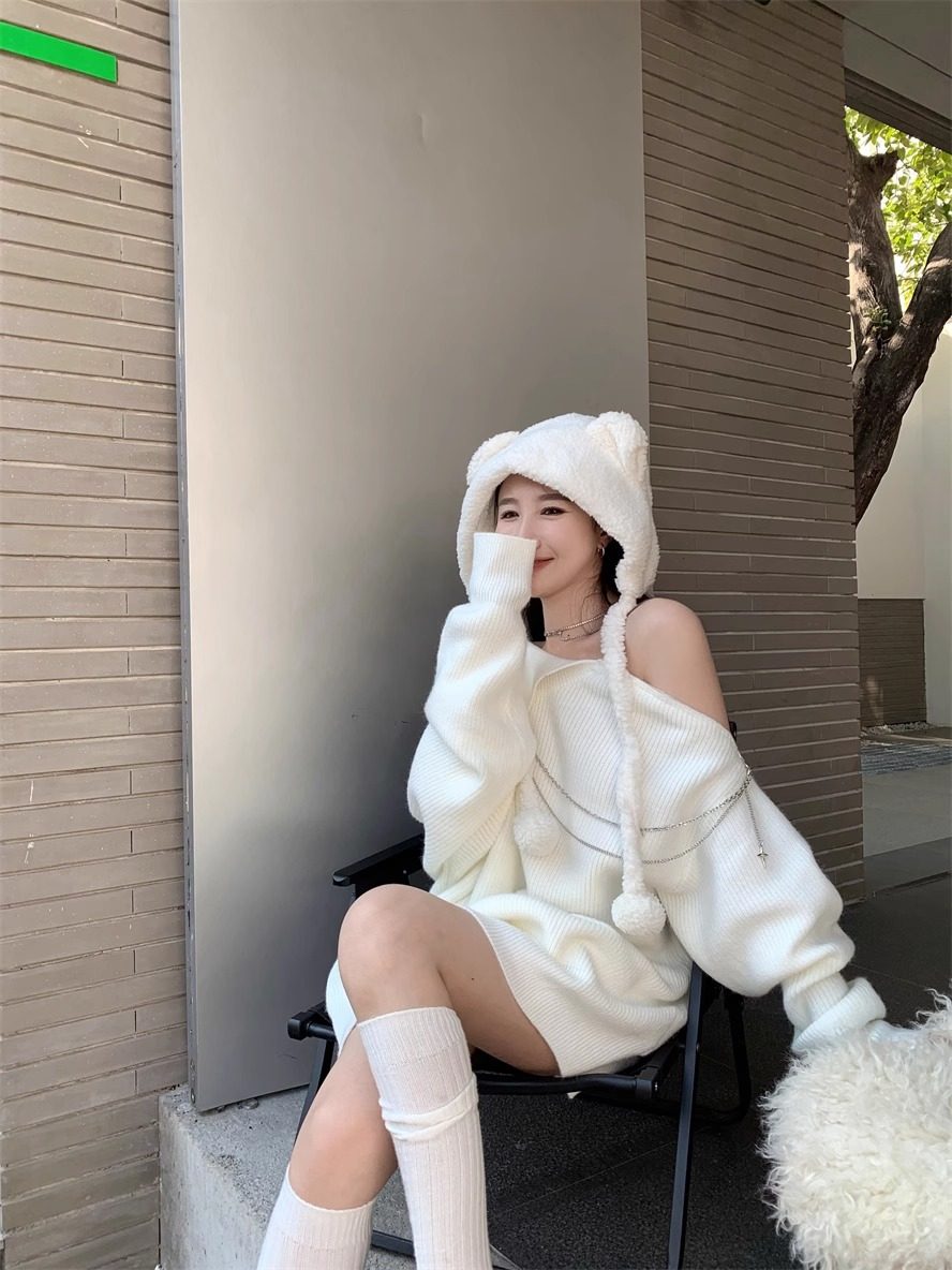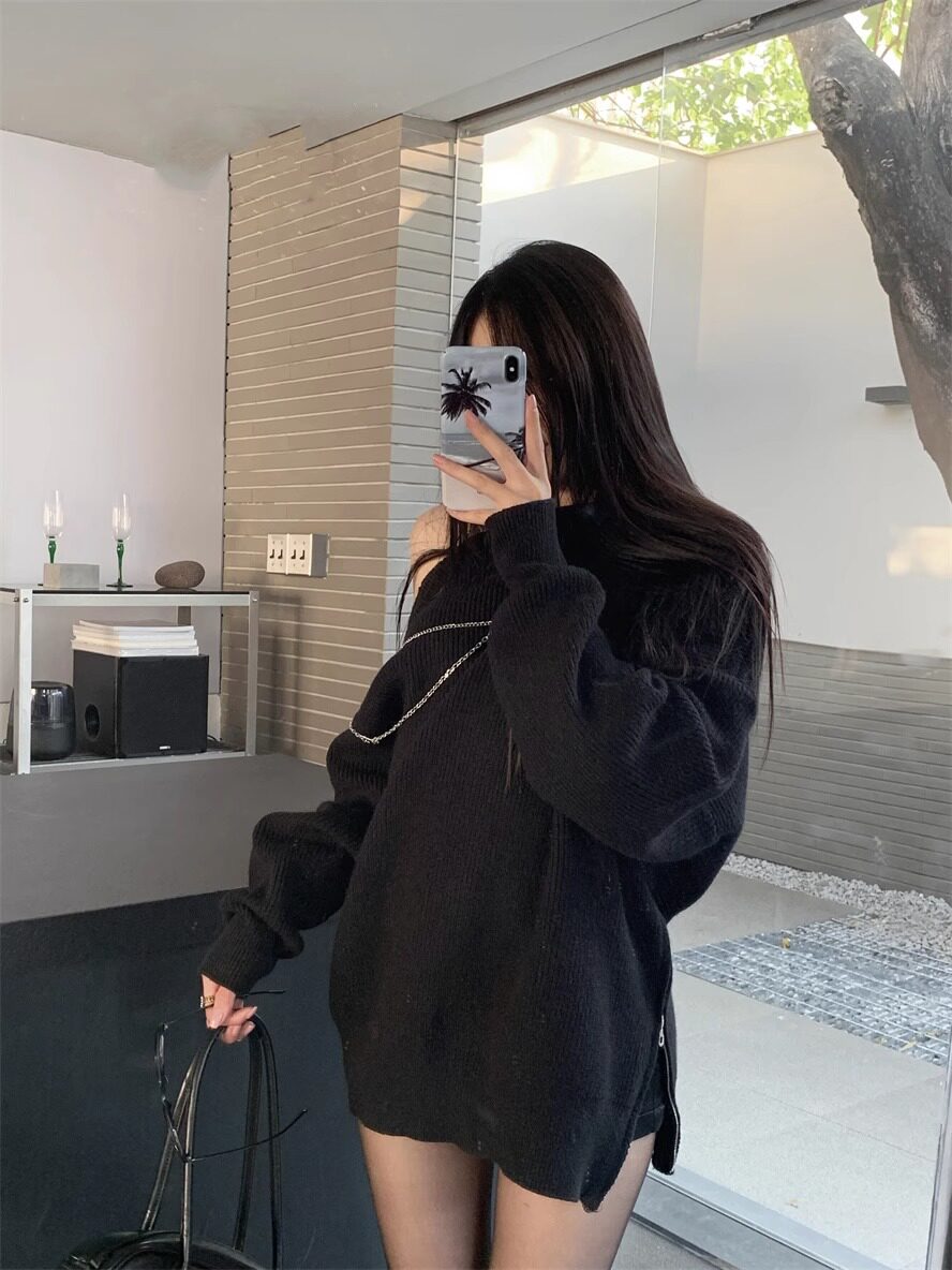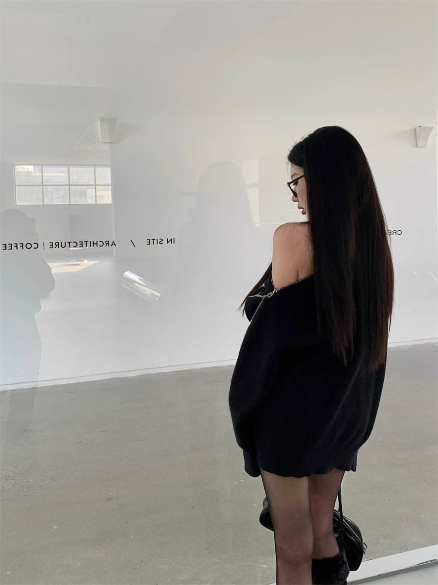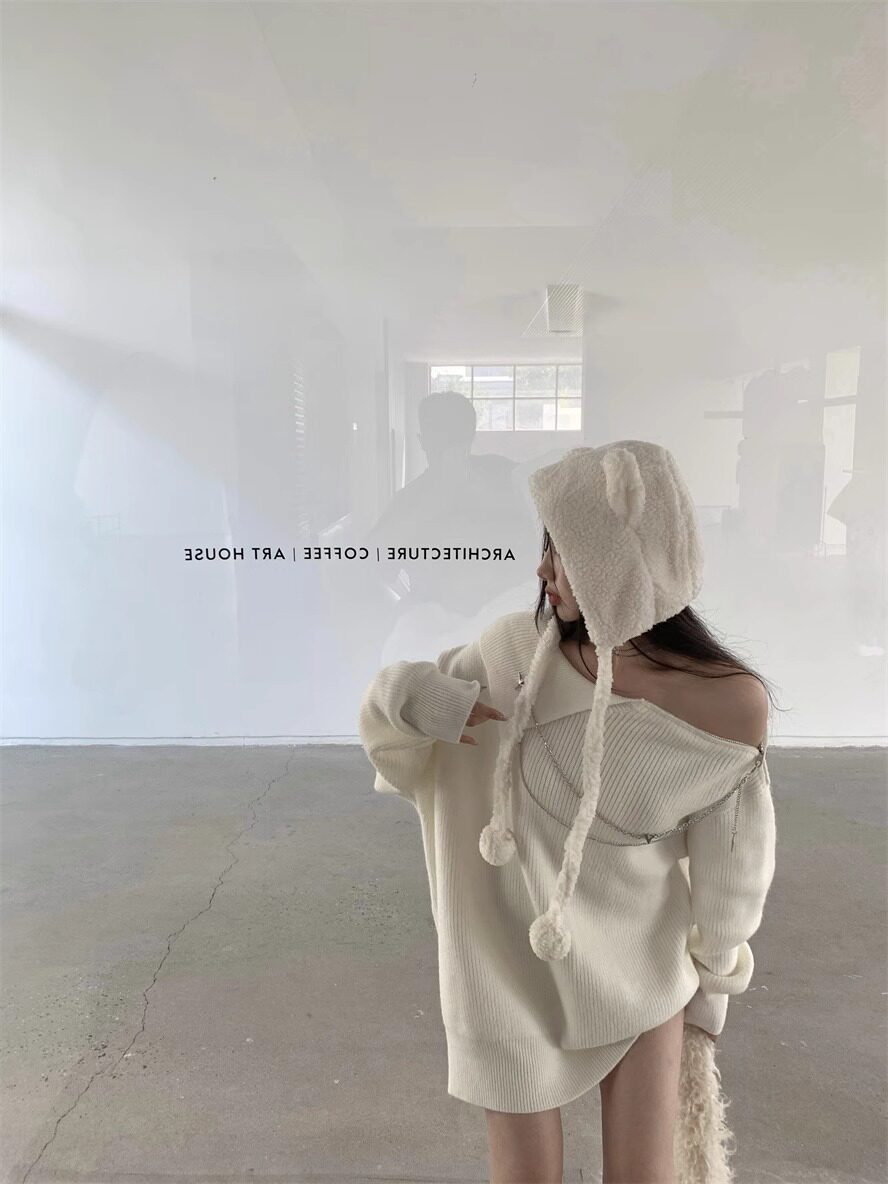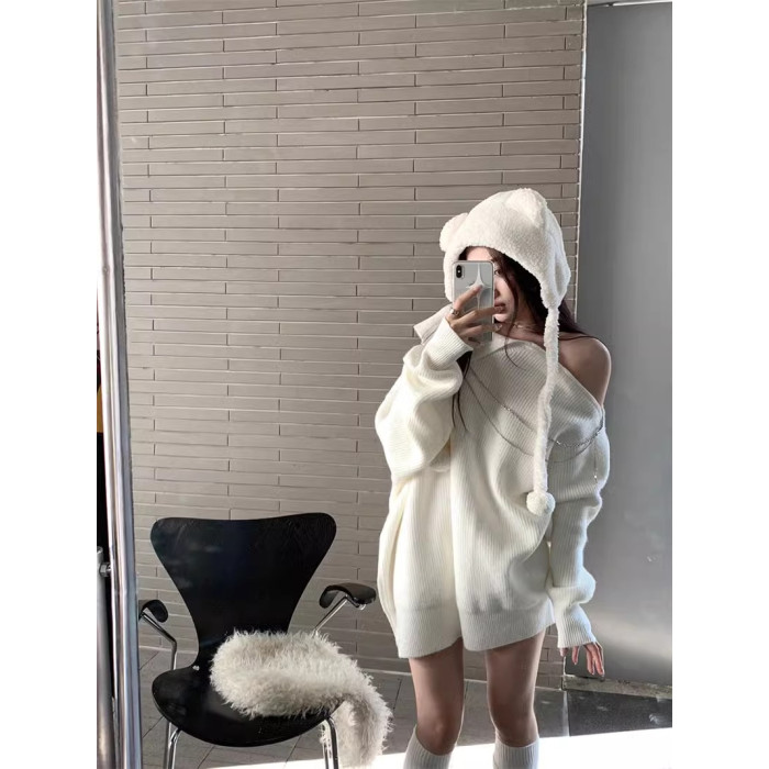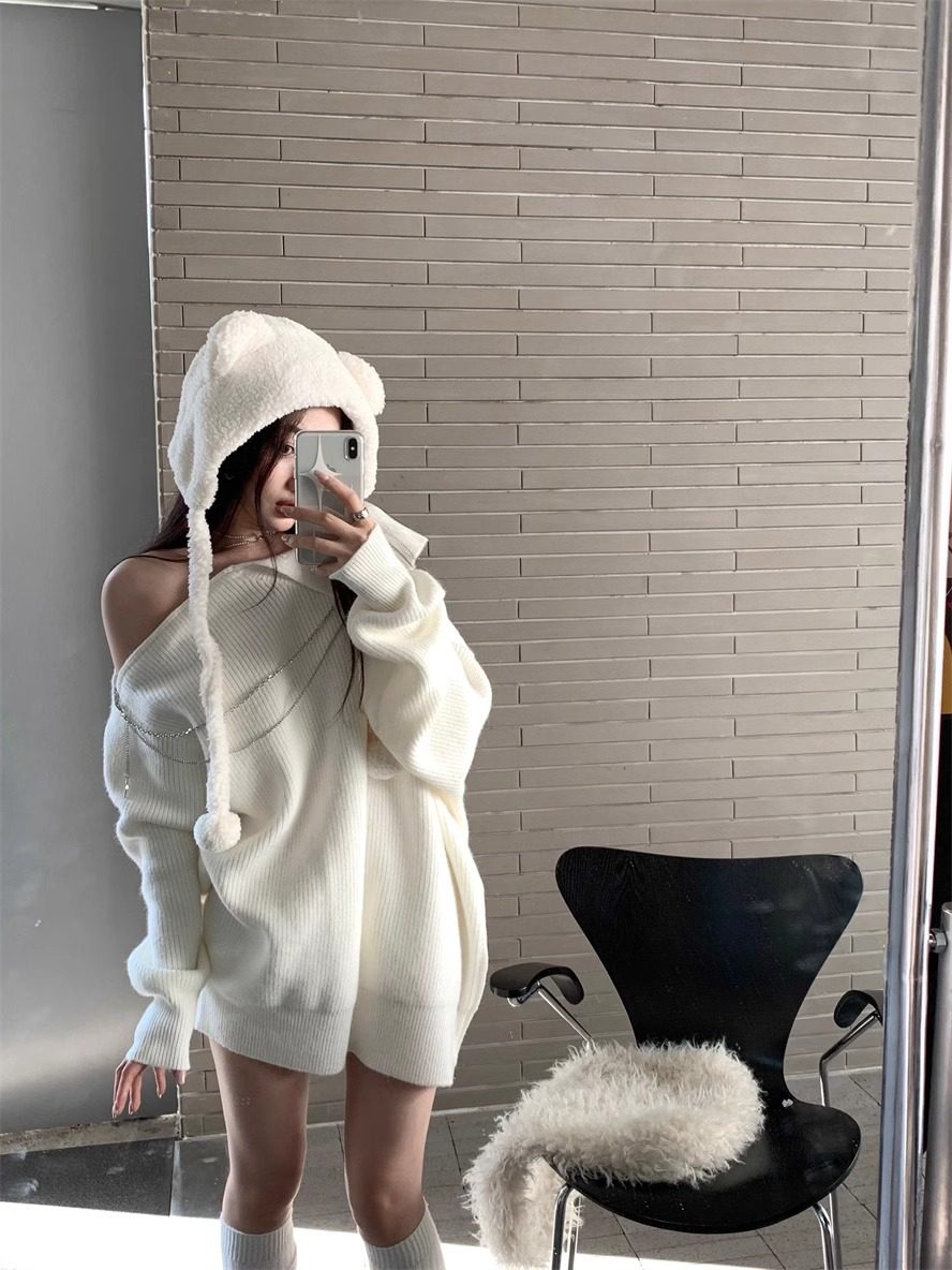 純欲風甜美設計感拉鍊露肩鏈條胸針中長款毛衣女秋冬慵懶針織上衣