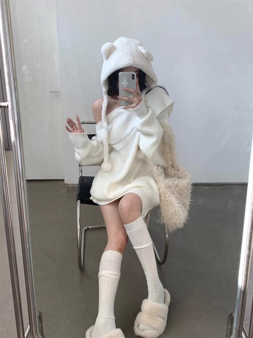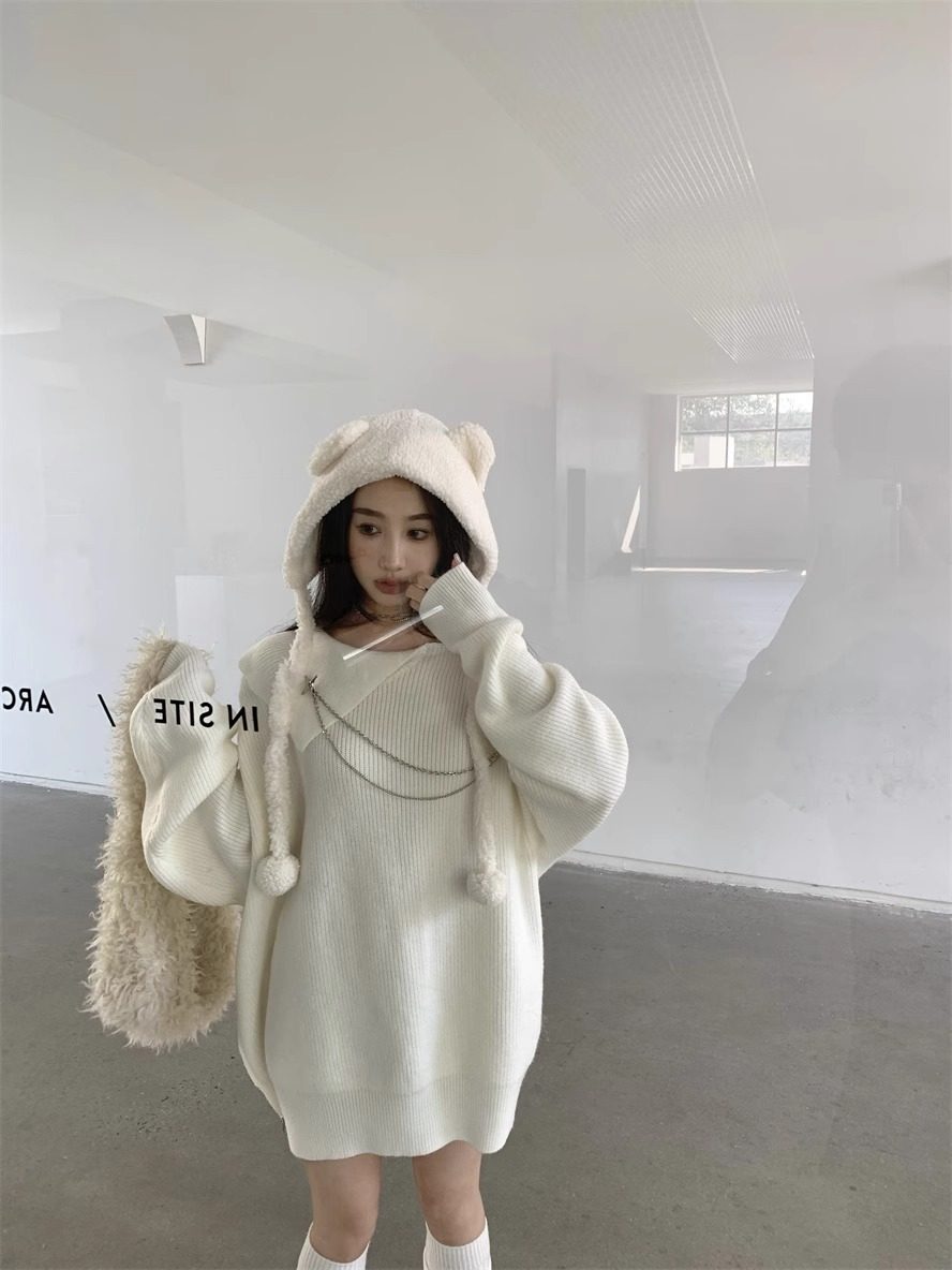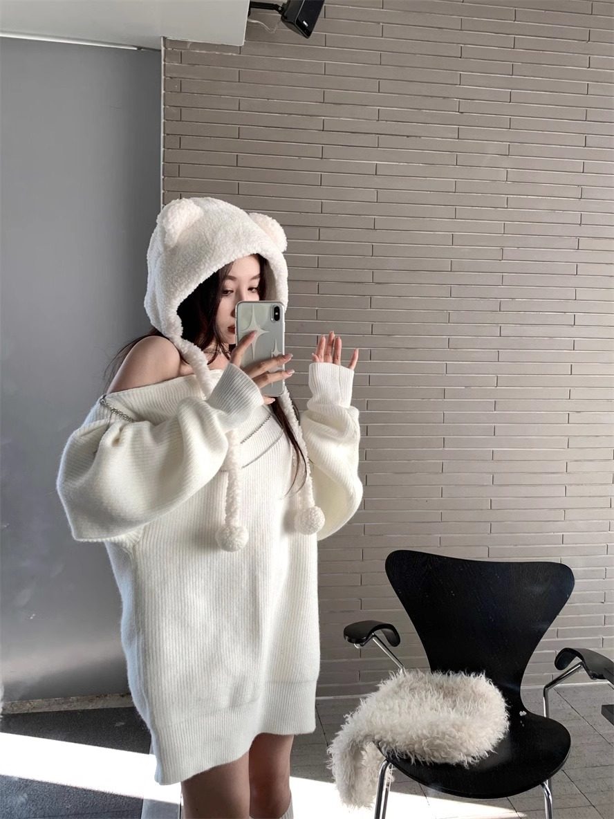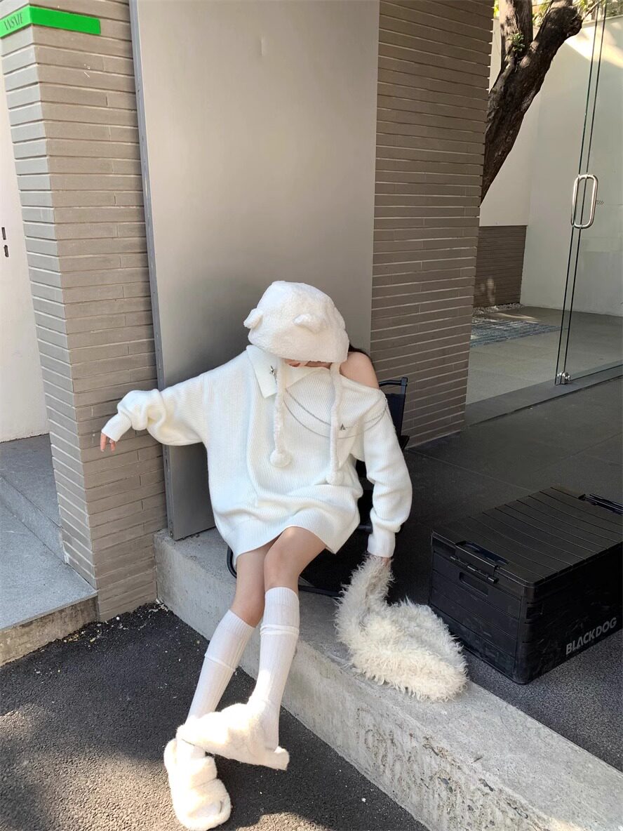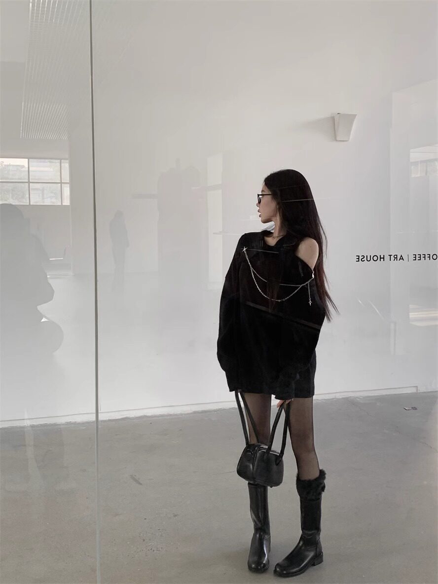 純欲風甜美設計感拉鍊露肩鏈條胸針中長款毛衣女秋冬慵懶針織上衣