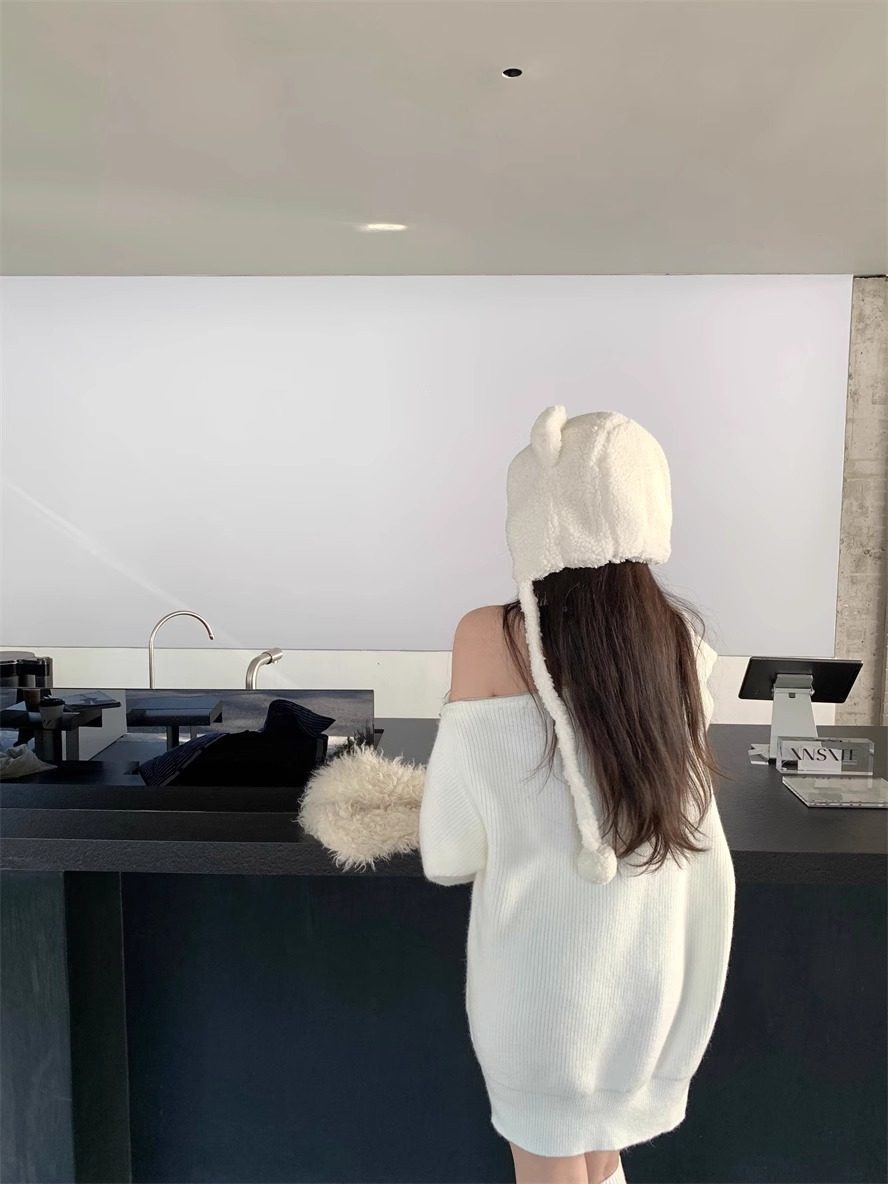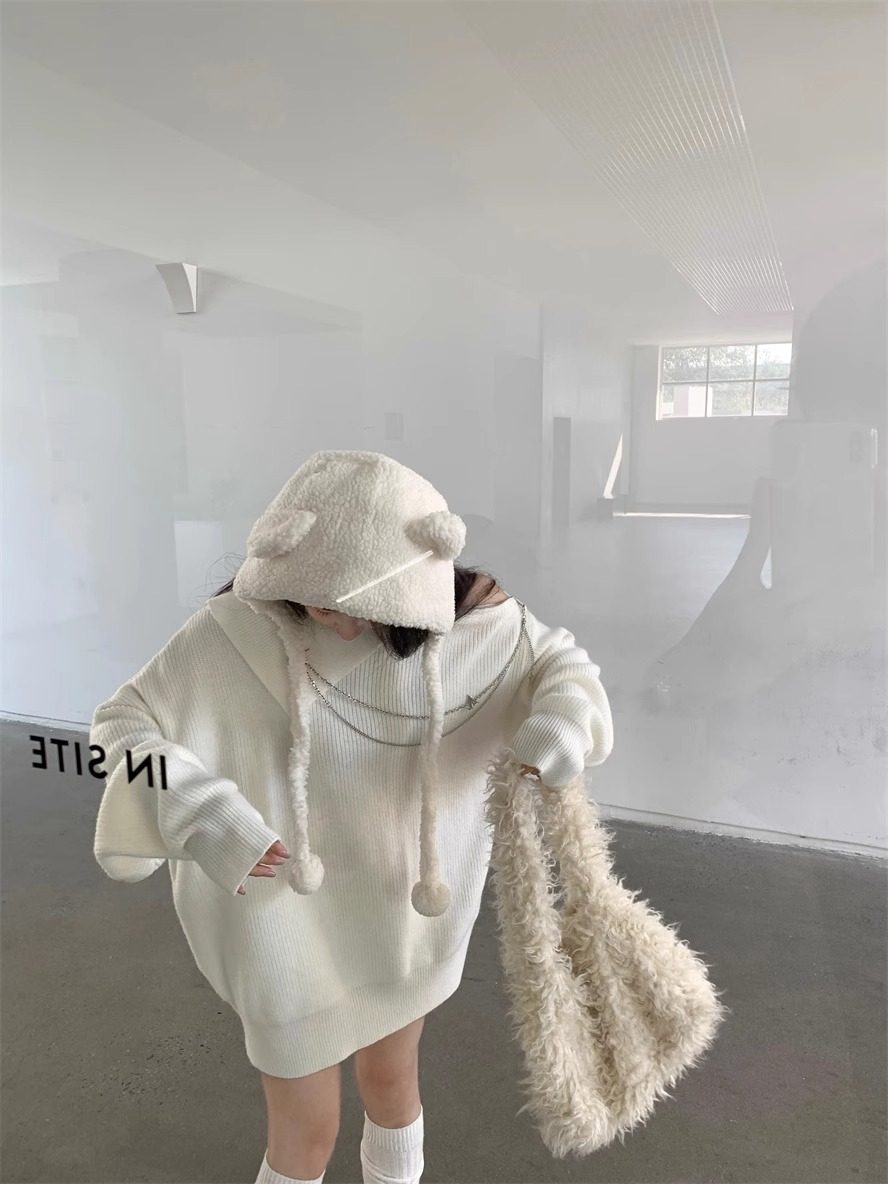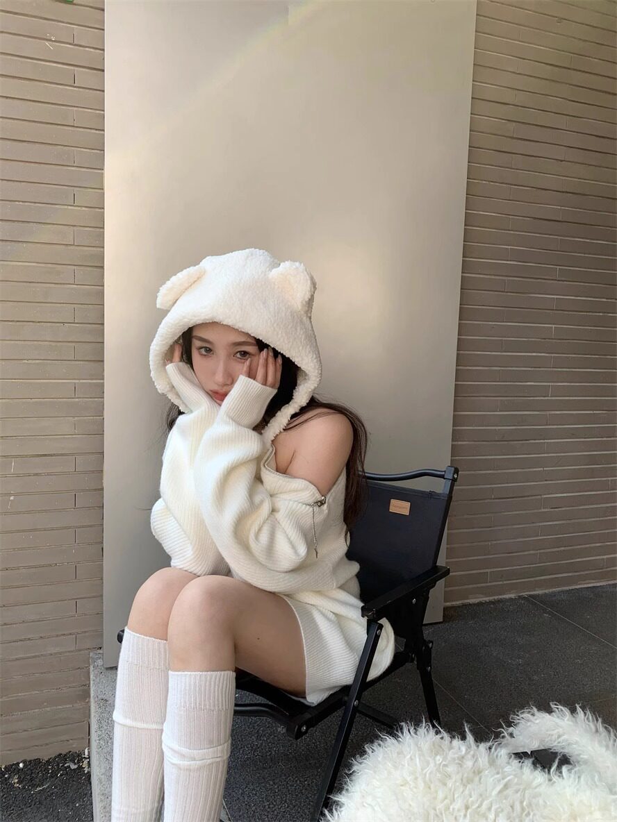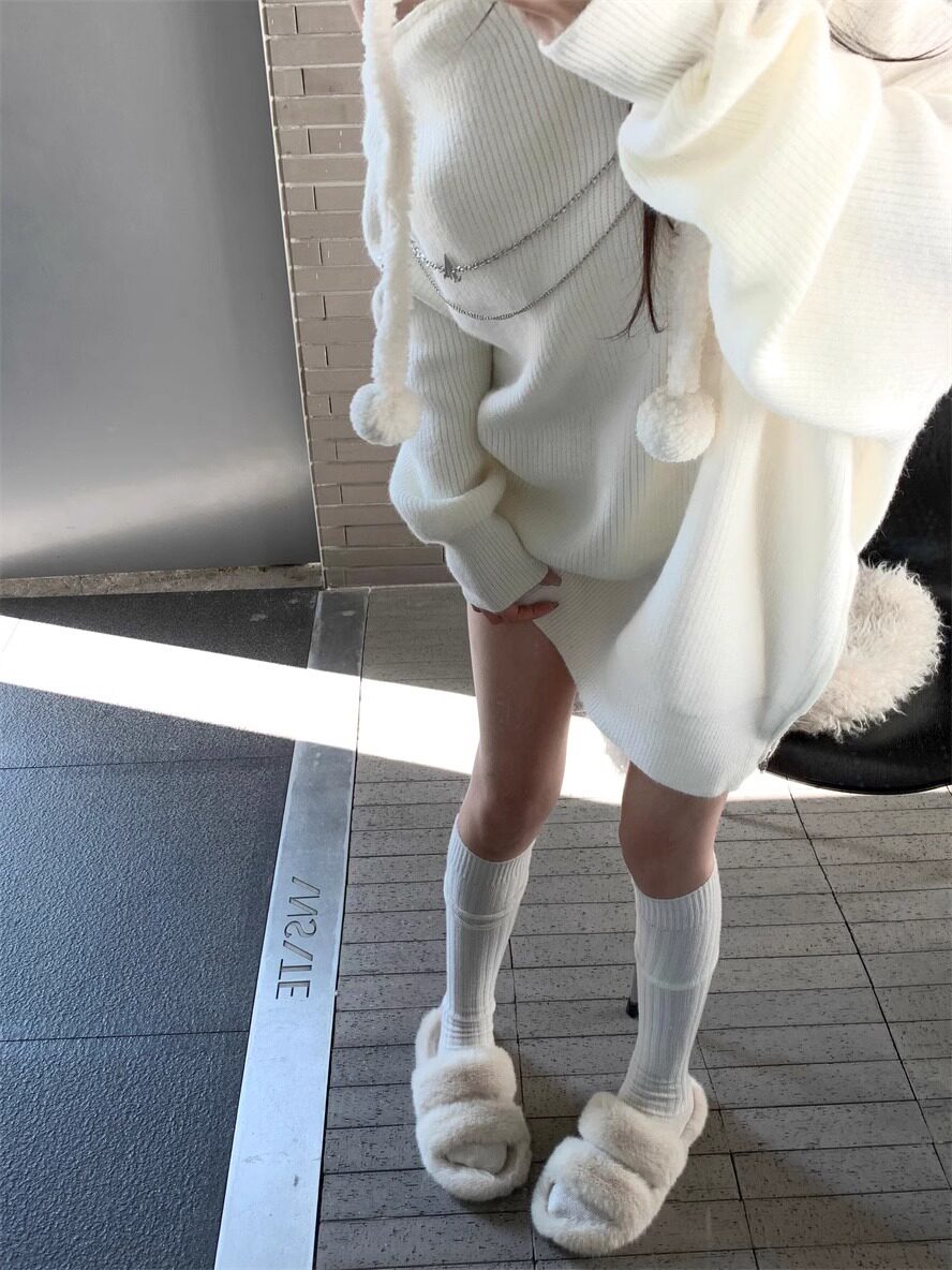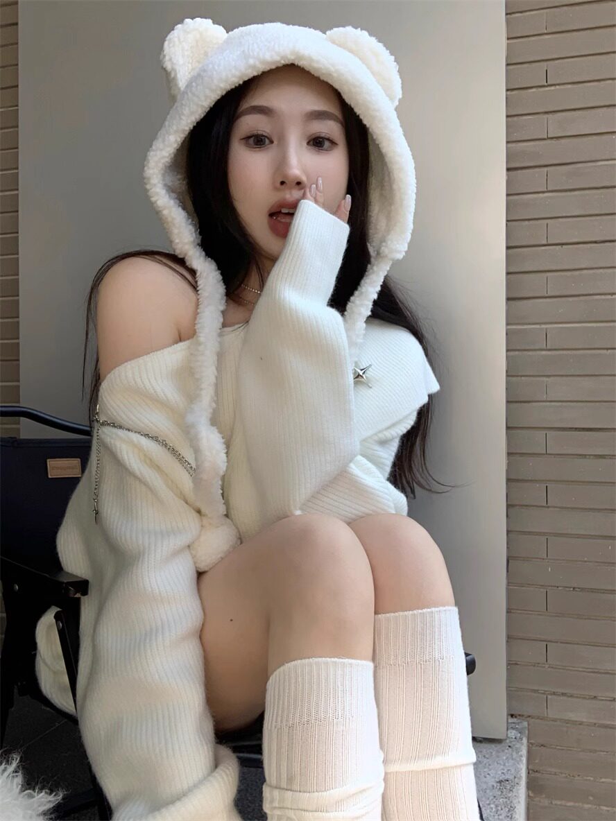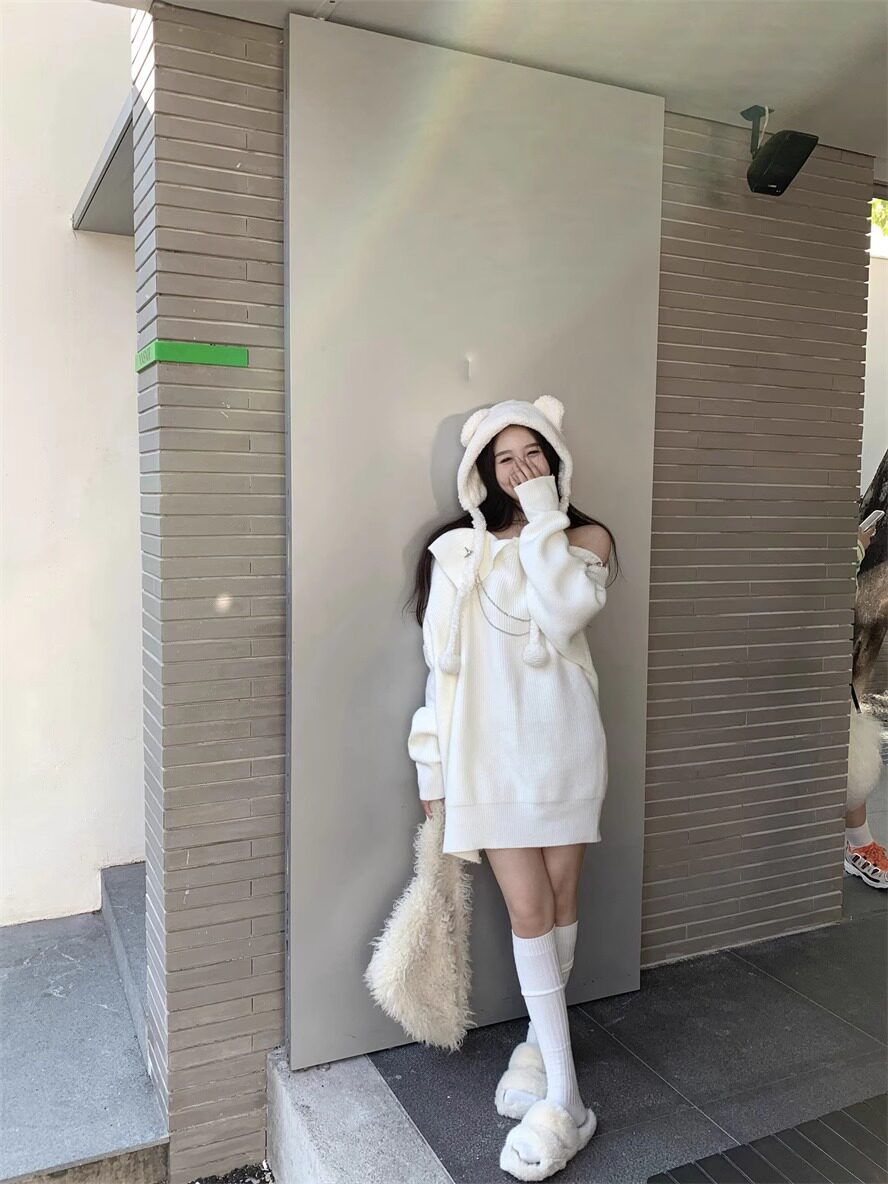 純欲風甜美設計感拉鍊露肩鏈條胸針中長款毛衣女秋冬慵懶針織上衣