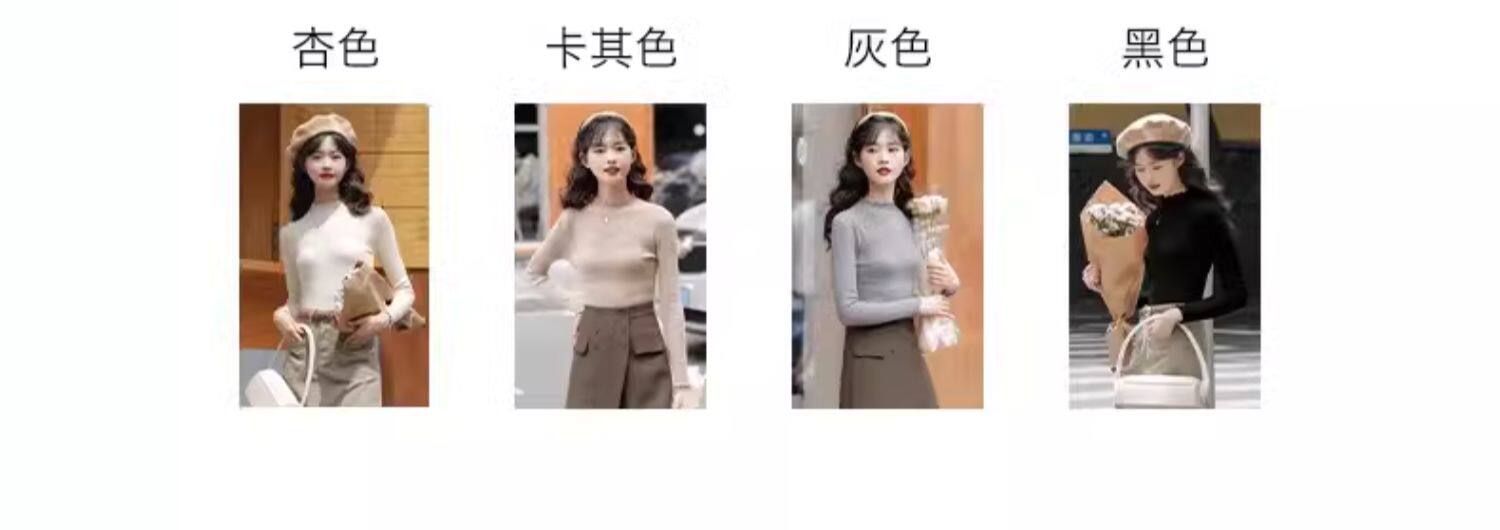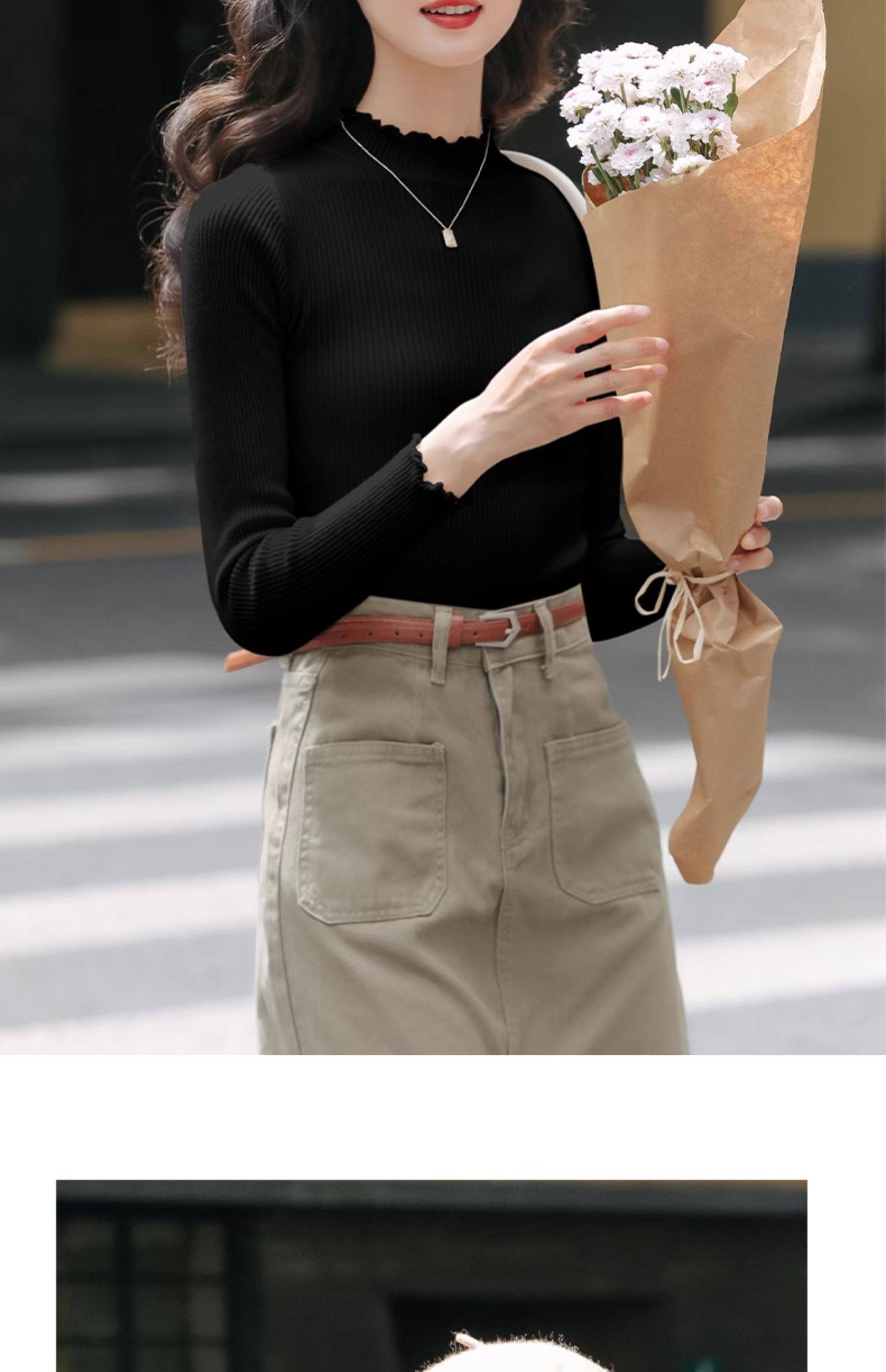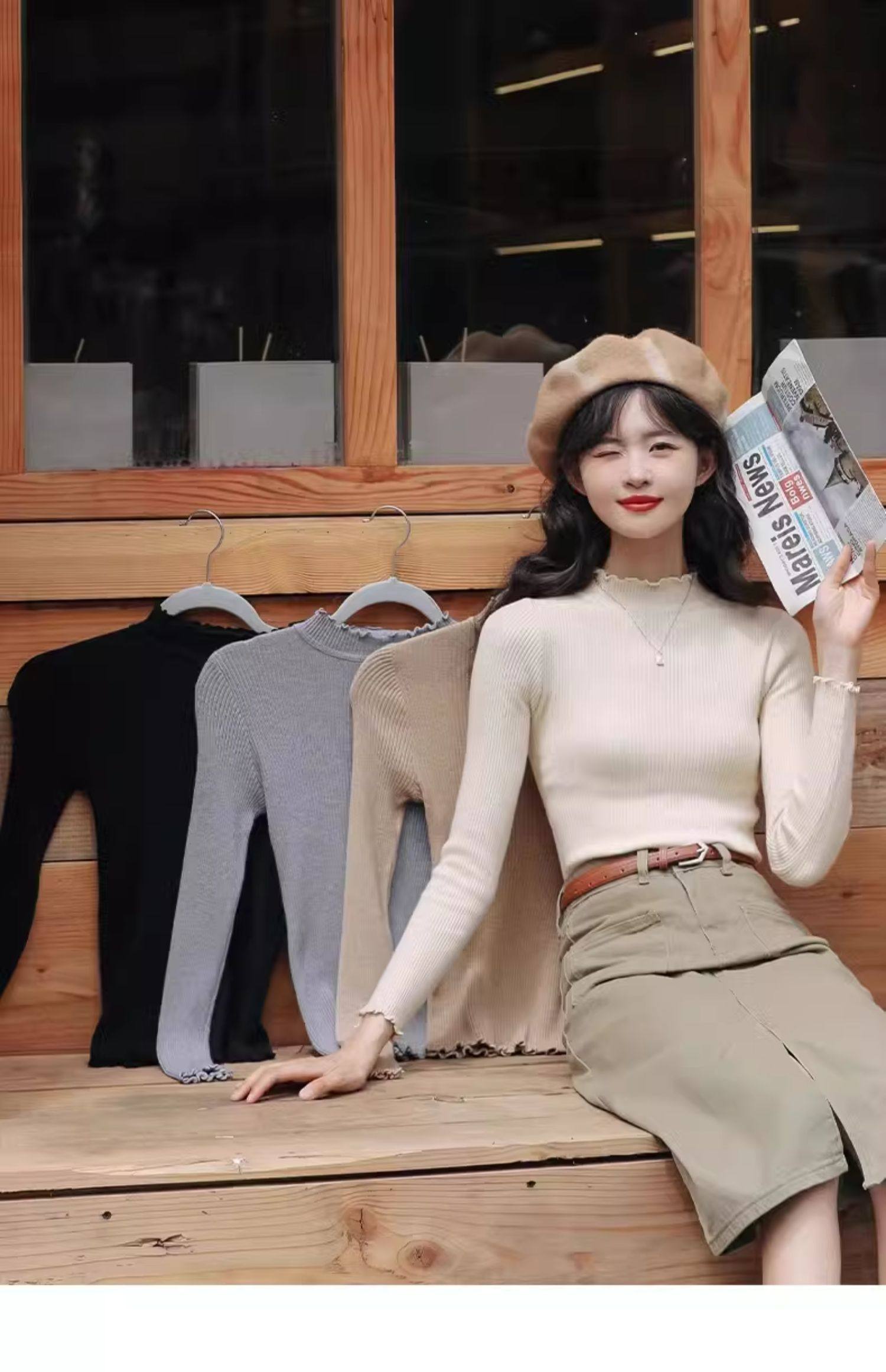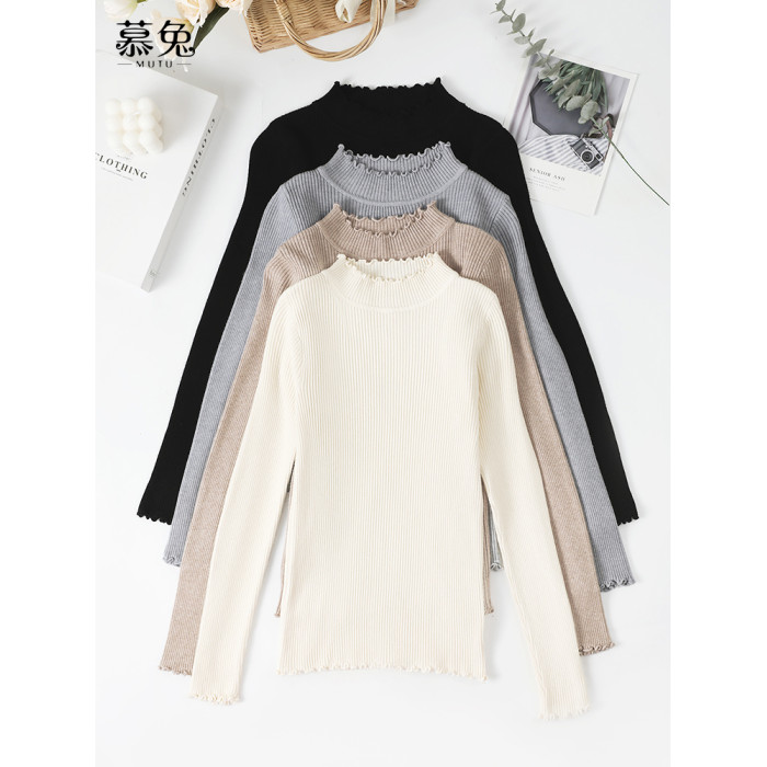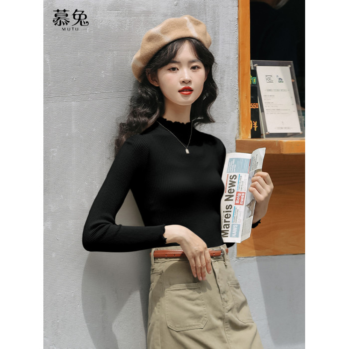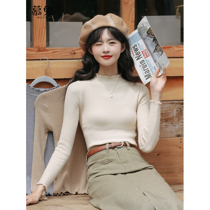 慕兔半高領內搭針織打底衫女2025秋季新款洋氣木耳邊修身長袖上衣