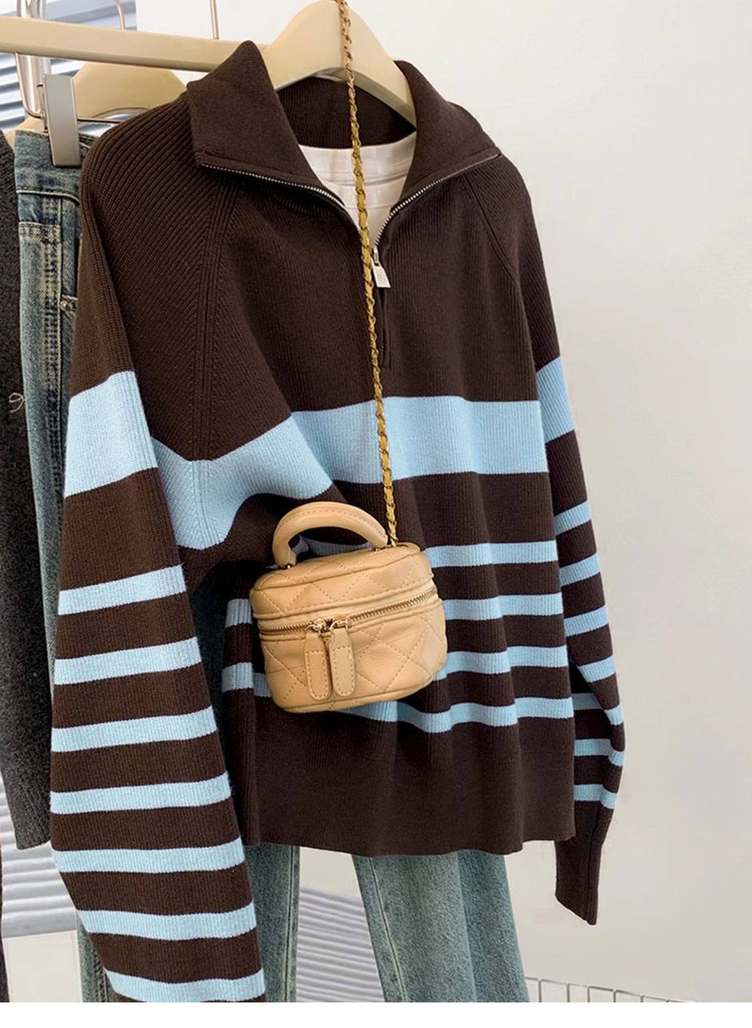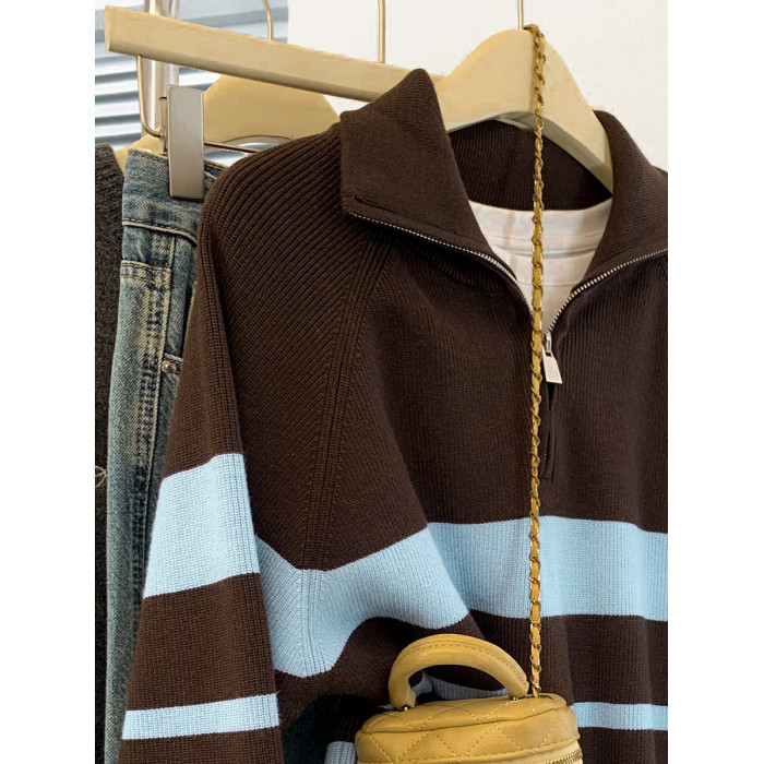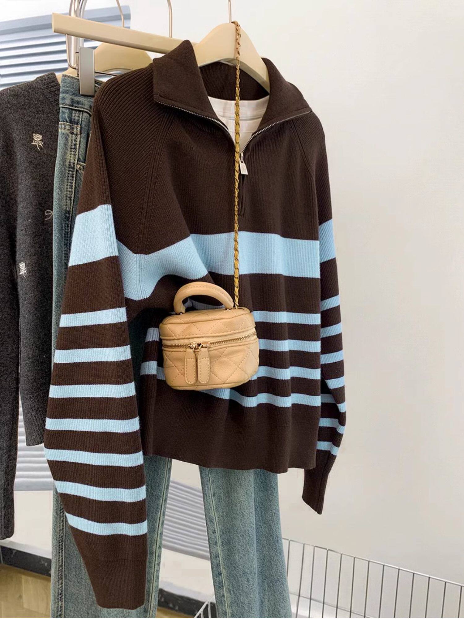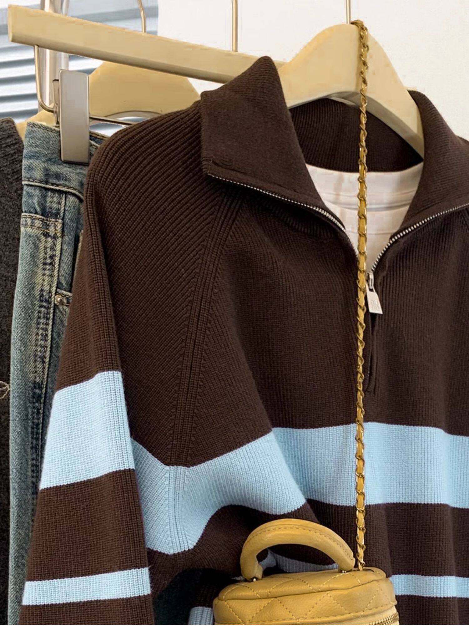 條紋半拉鍊翻領套頭毛衣外套女秋冬2025新款慵懶風外穿羊毛針織衫