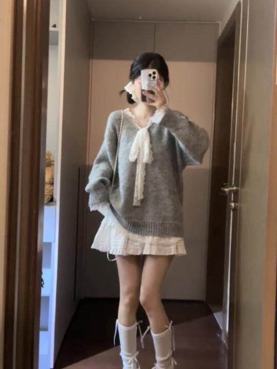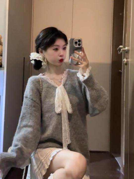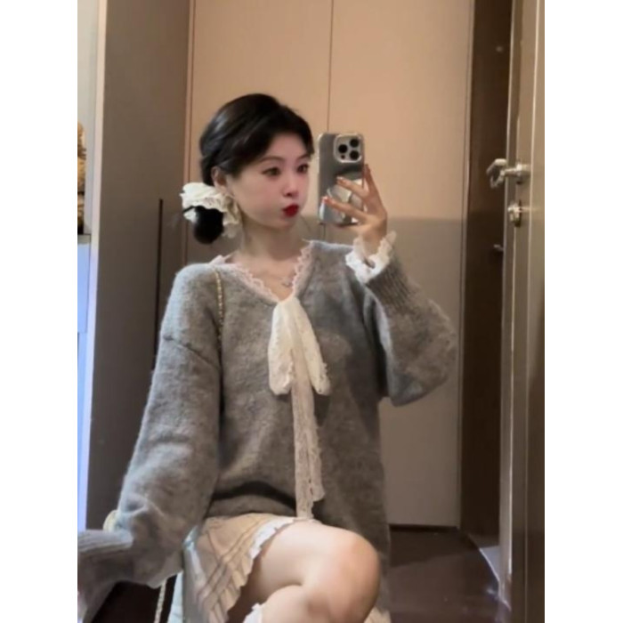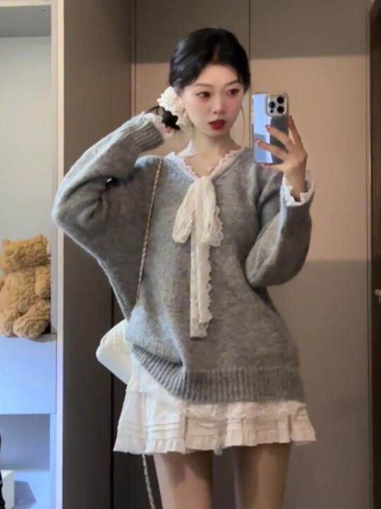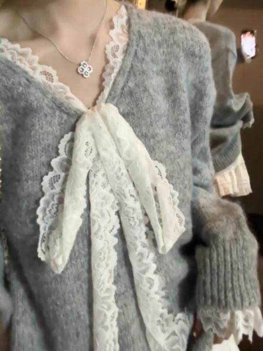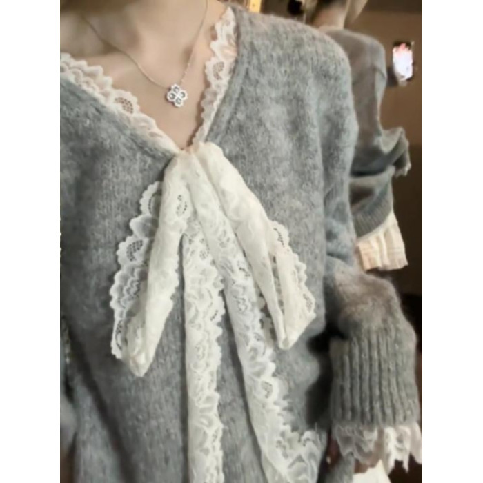灰色設計感蕾絲拼接蝴蝶結長袖毛衣針織衫女秋季休閒寬松氣質上衣