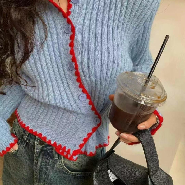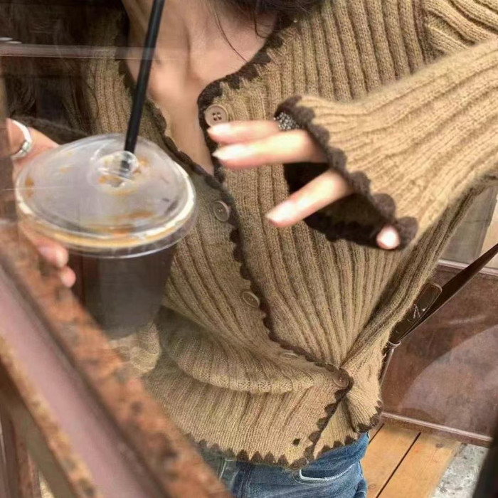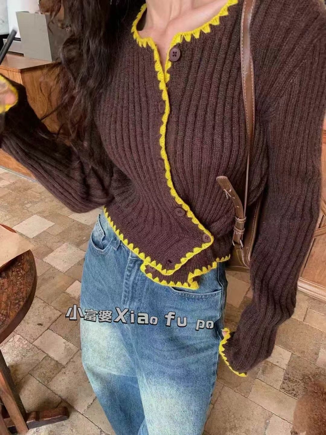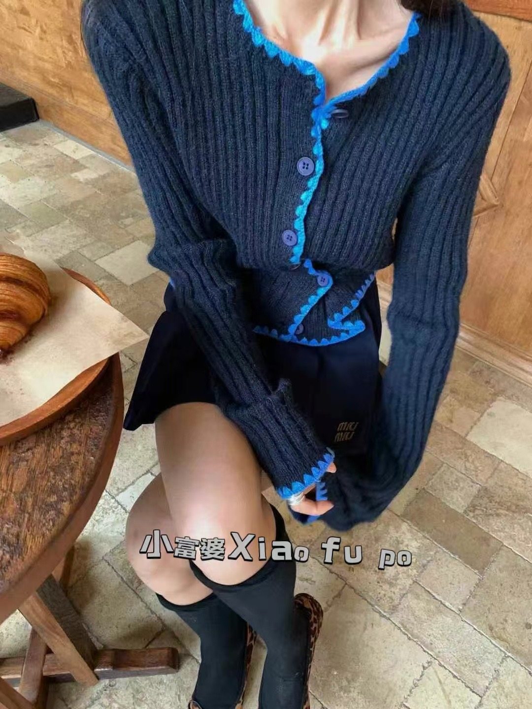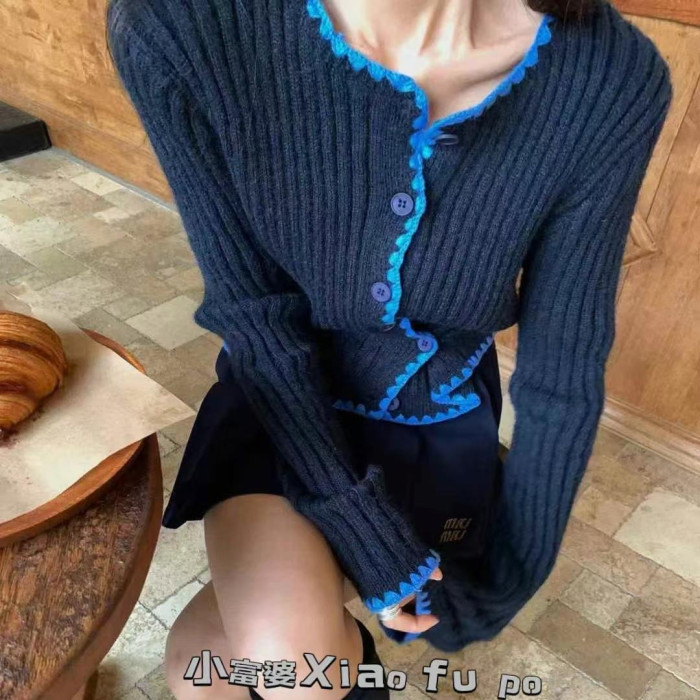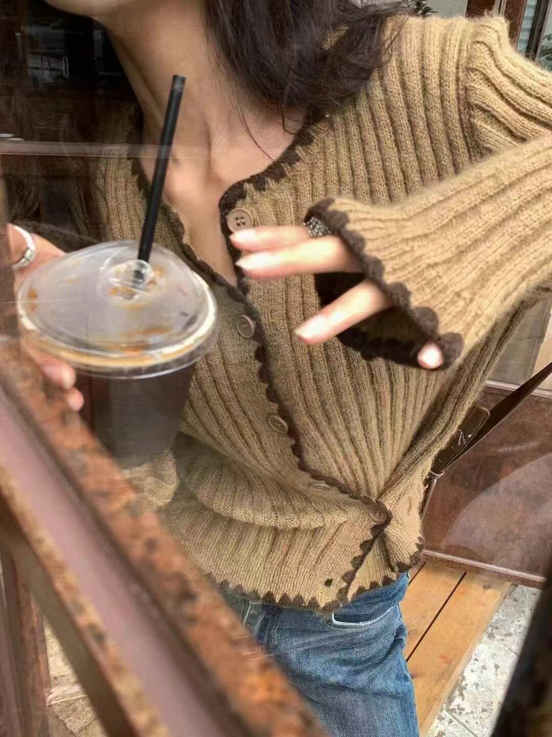 韓國東大門2025冬季新款洋氣拼色花邊不規則側釦設計感毛衣開衫女