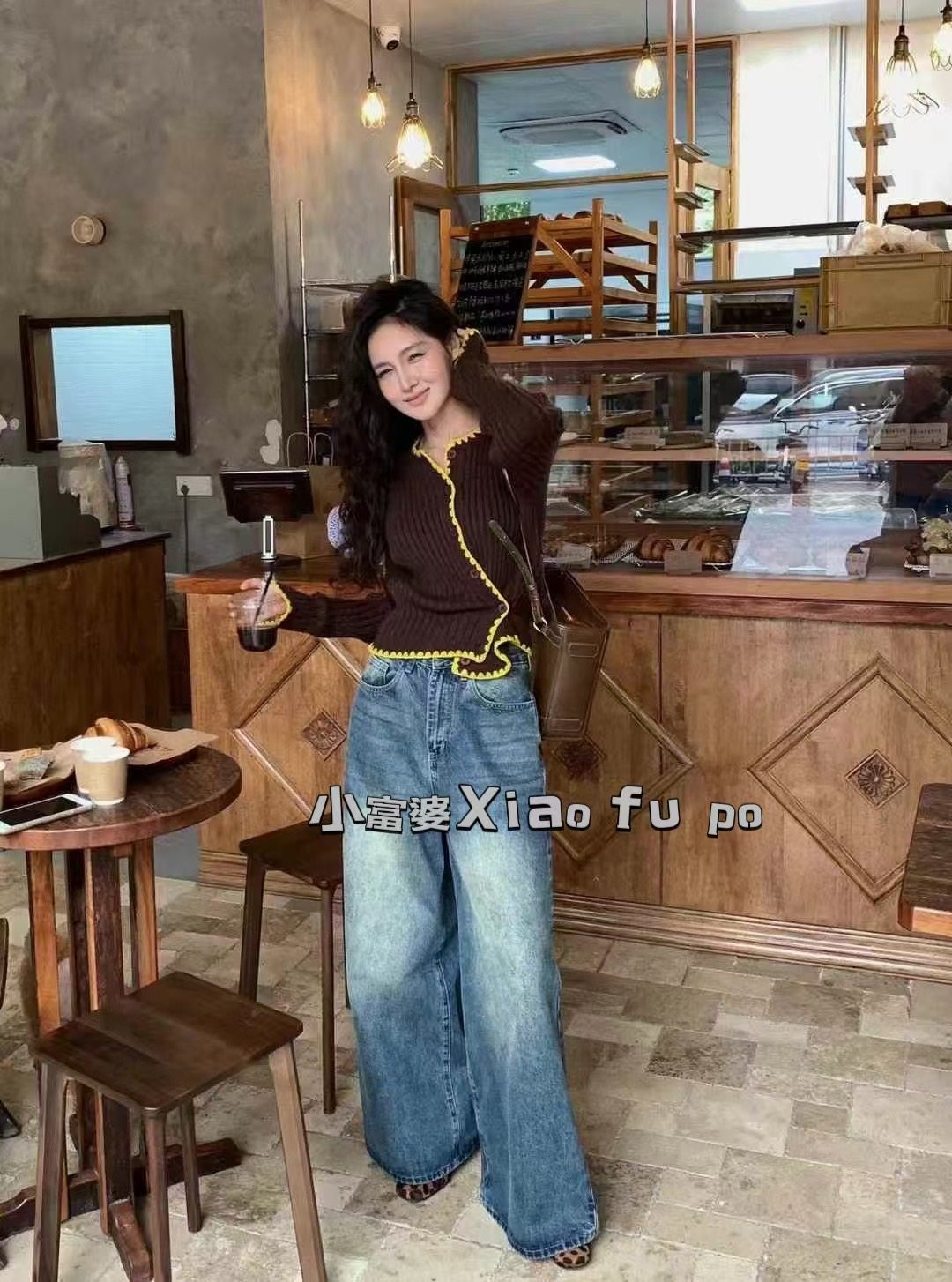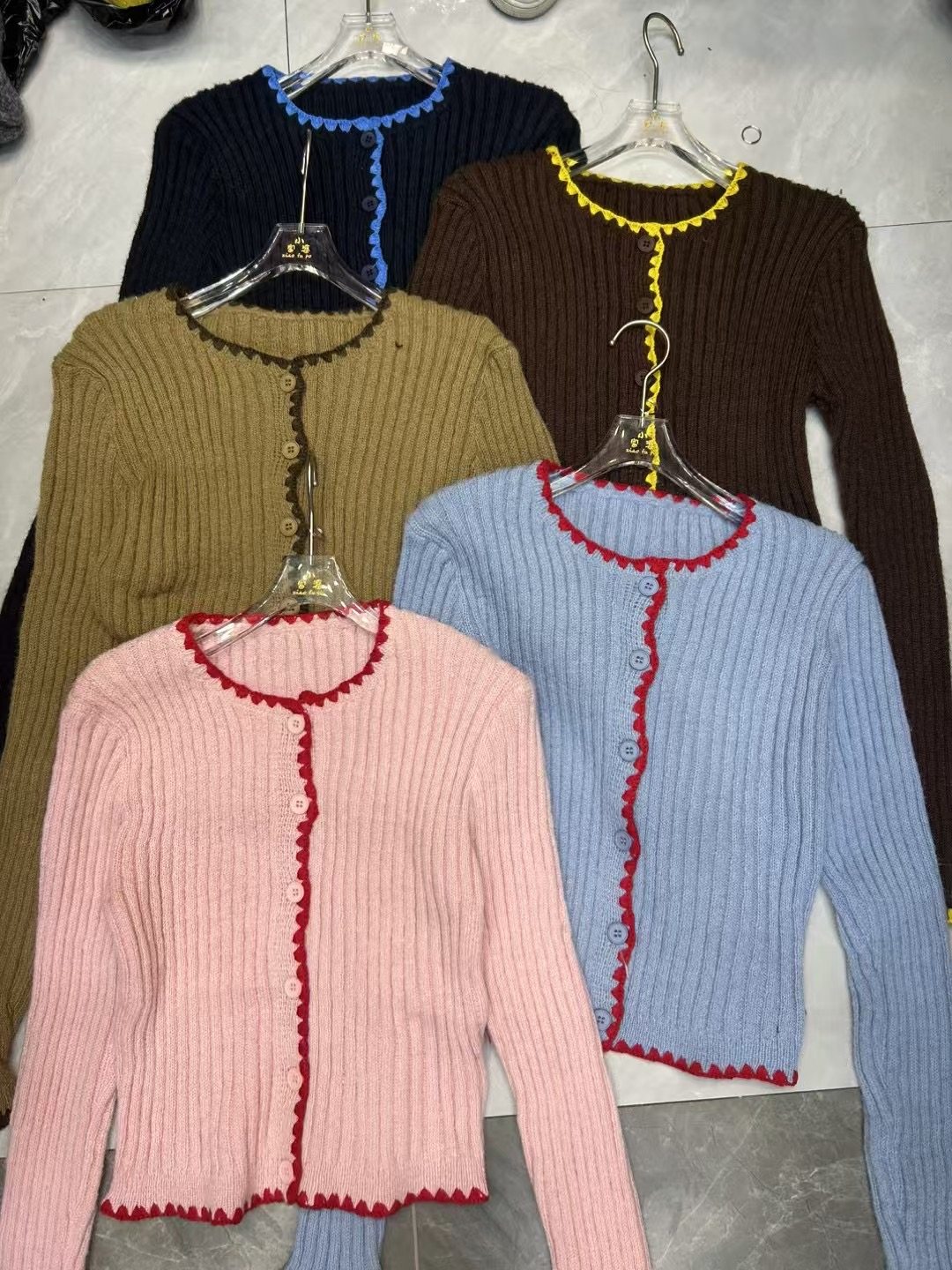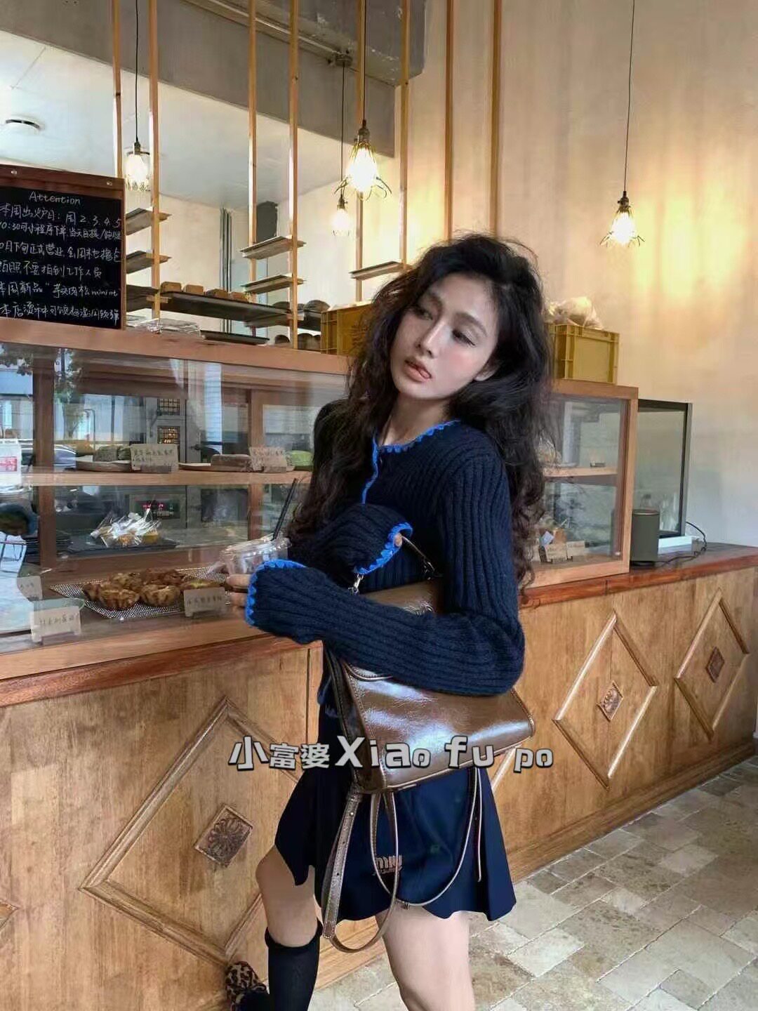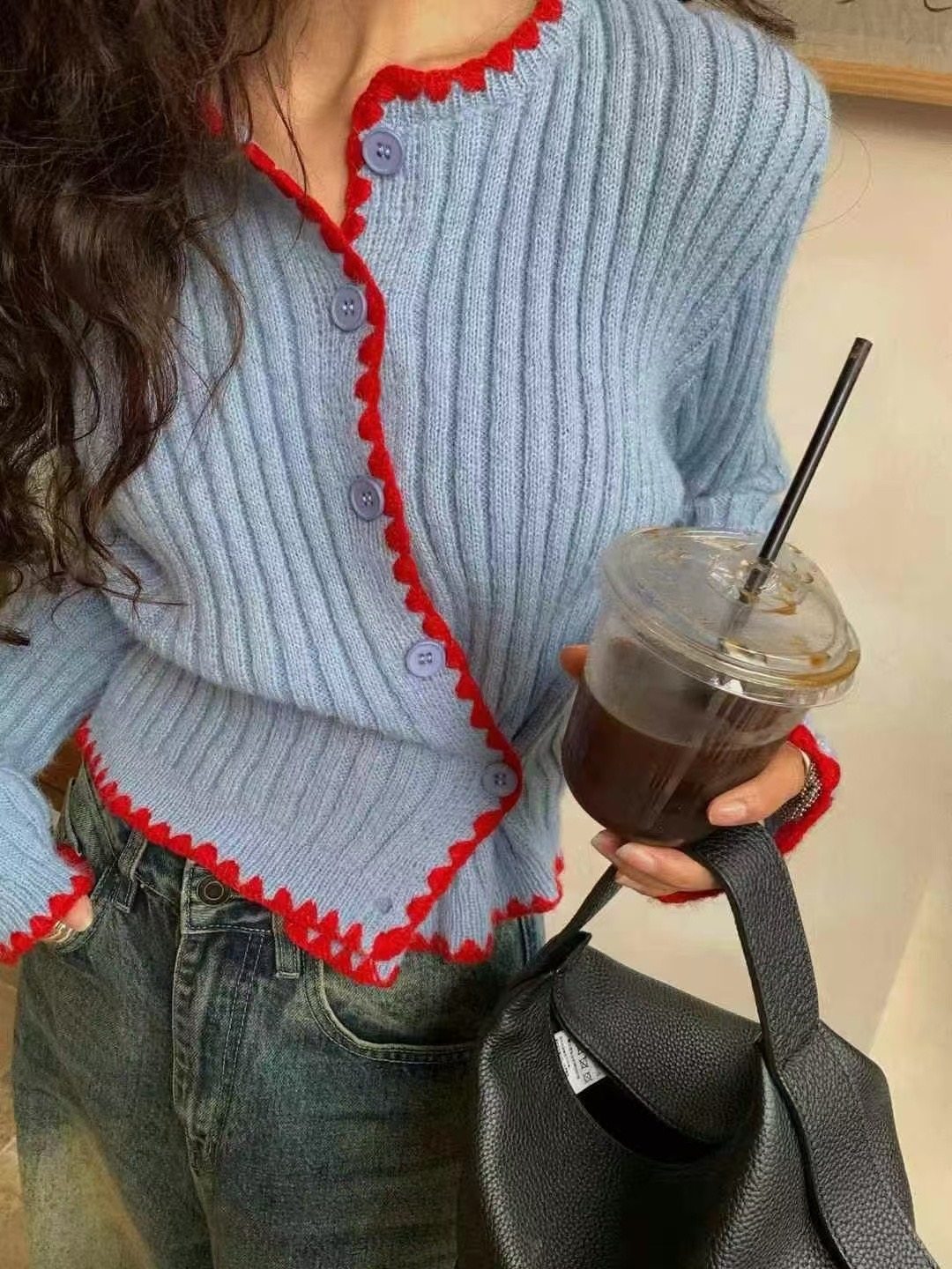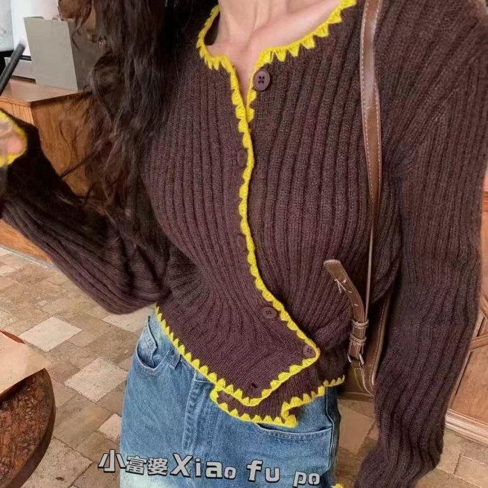 韓國東大門2025冬季新款洋氣拼色花邊不規則側釦設計感毛衣開衫女