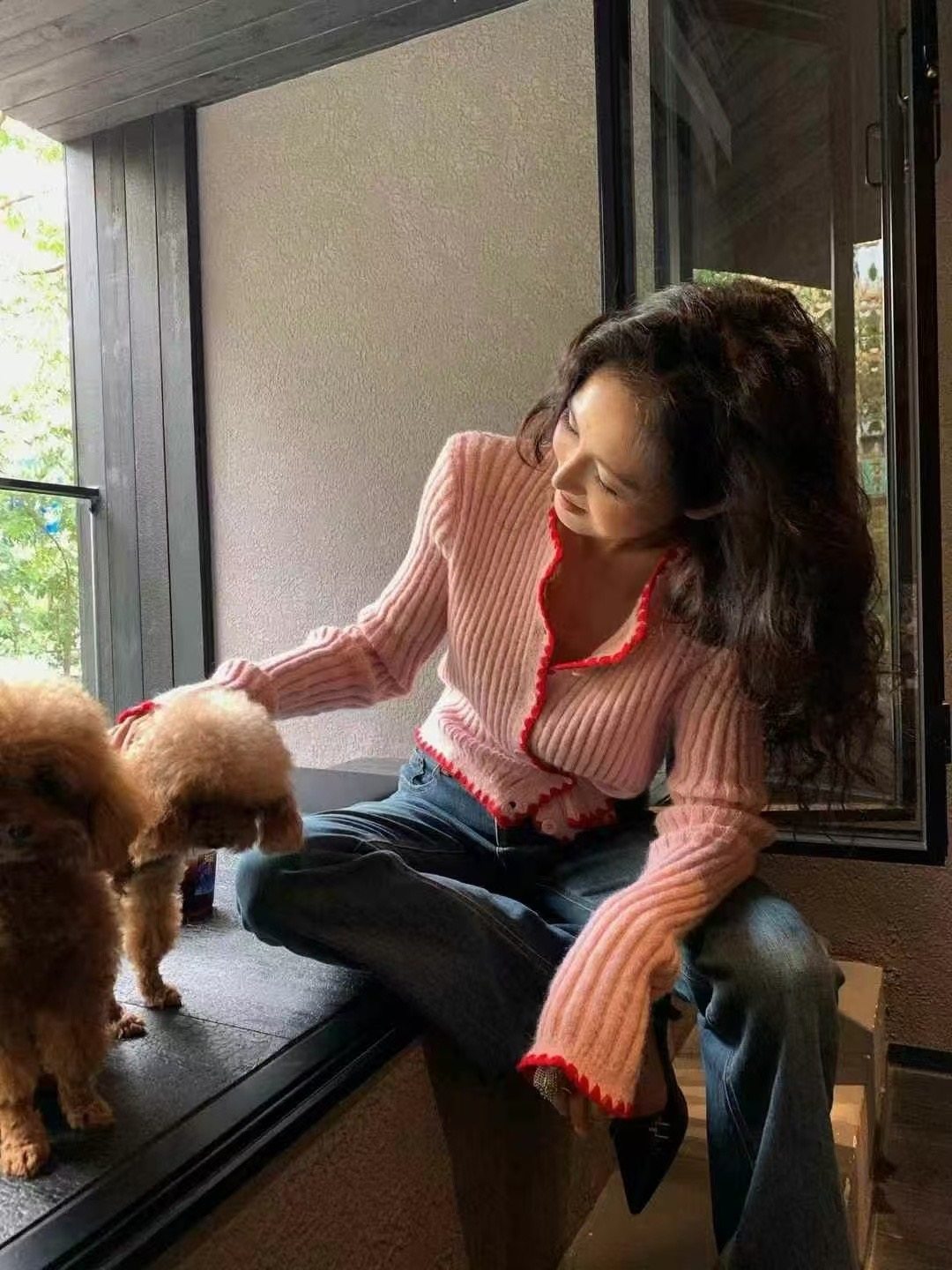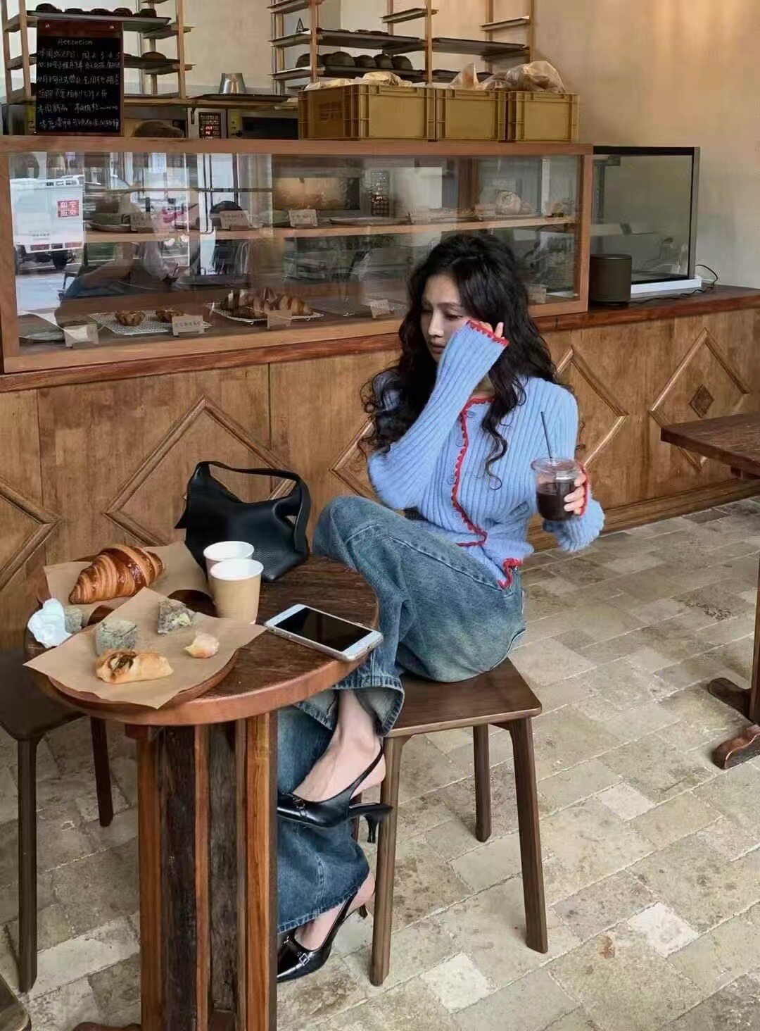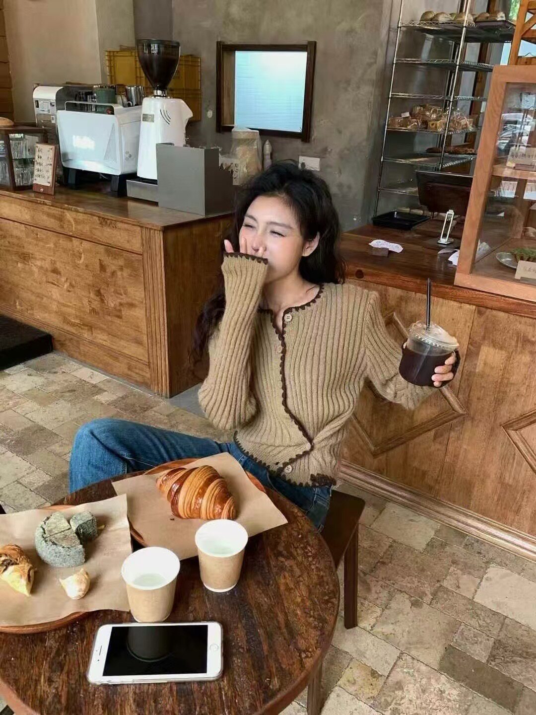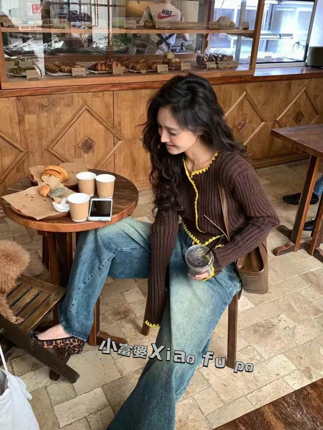 韓國東大門2025冬季新款洋氣拼色花邊不規則側釦設計感毛衣開衫女