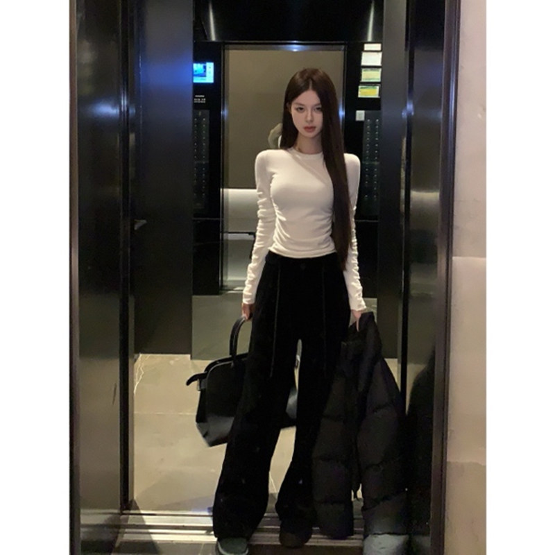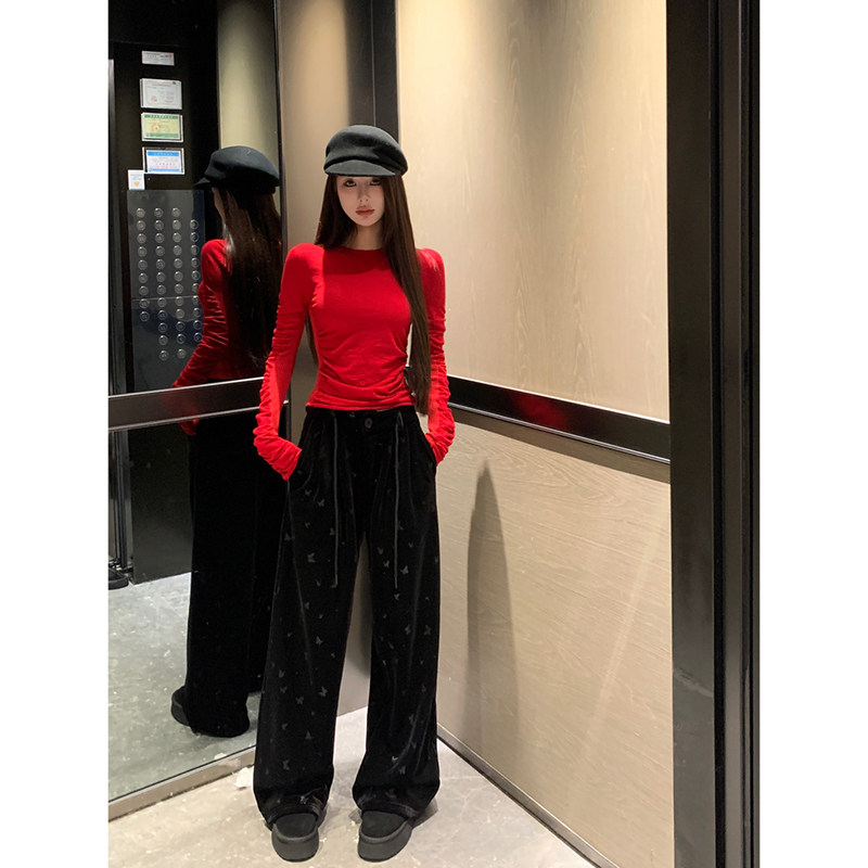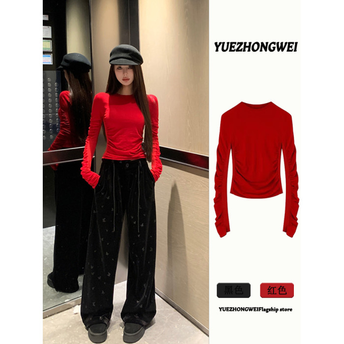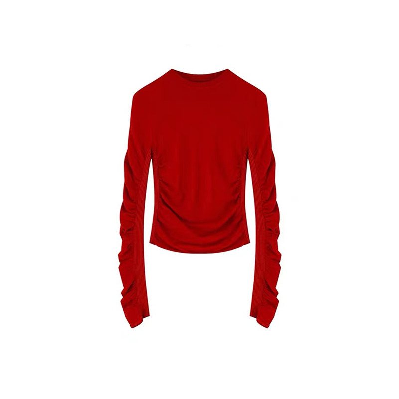 聖誕節過年新年戰袍紅色褶皺毛衣女秋冬季修身內搭針織打底衫上衣