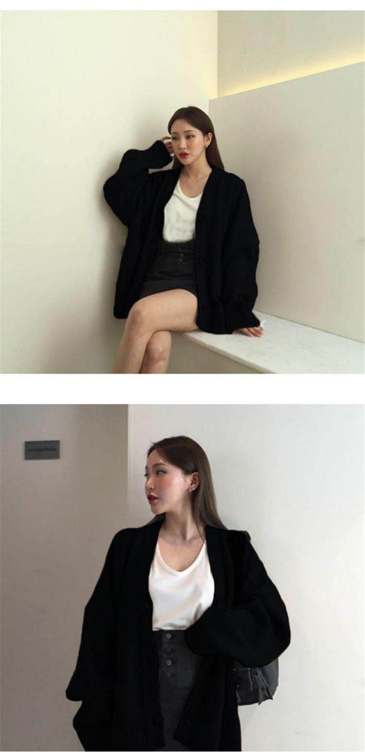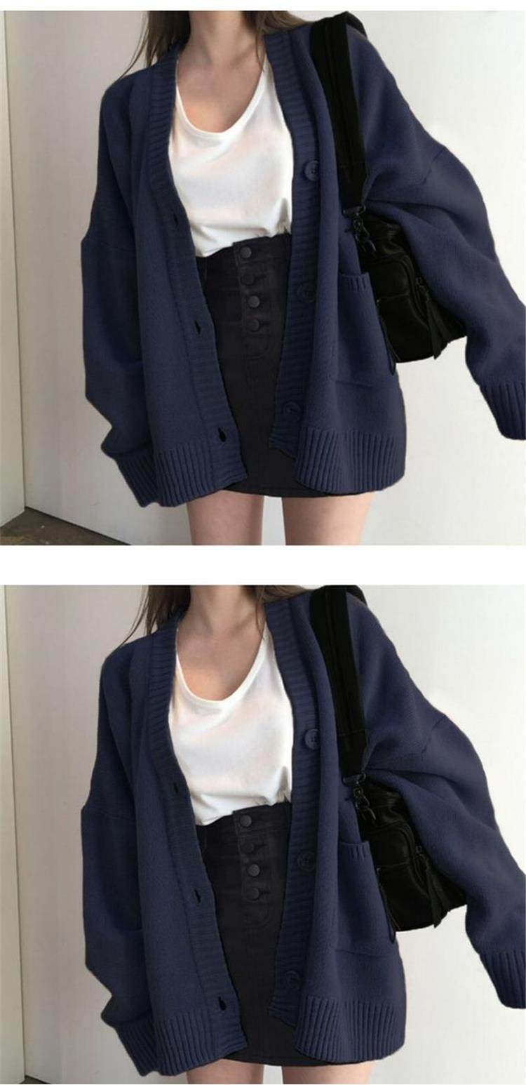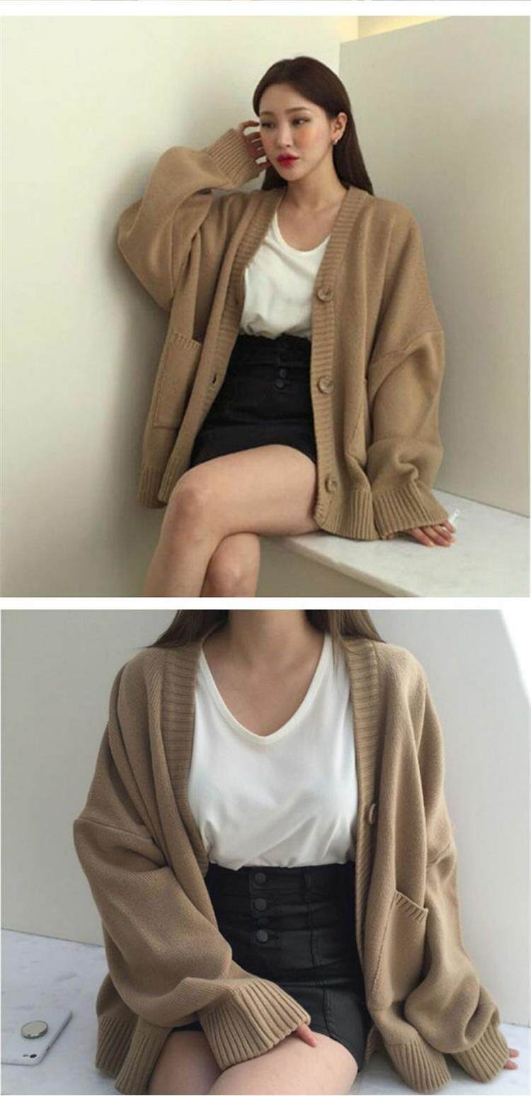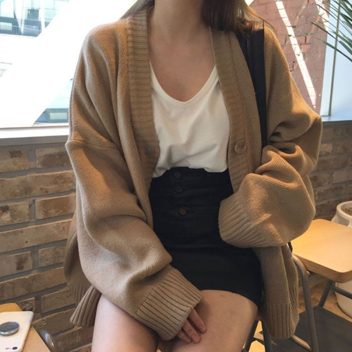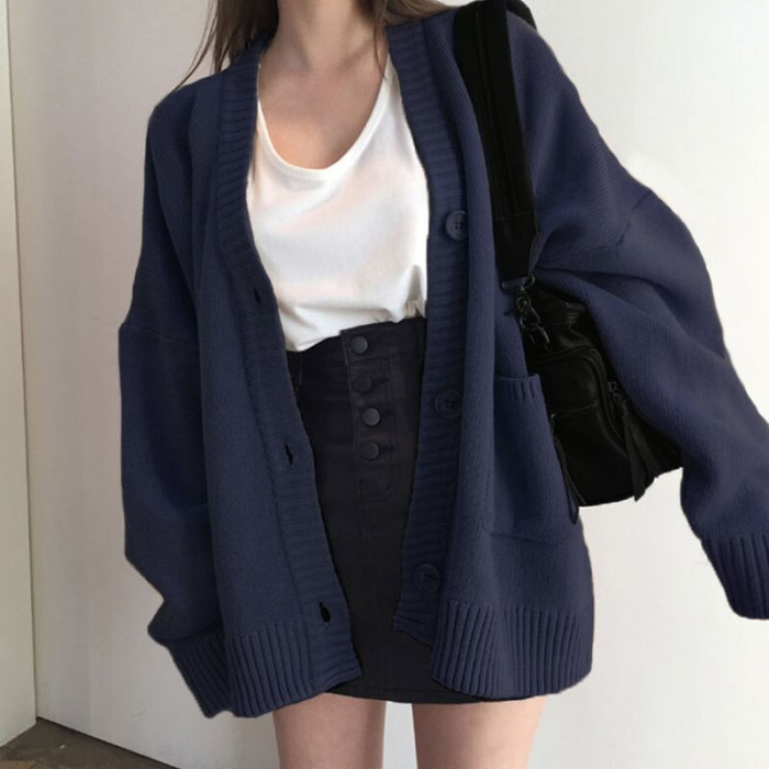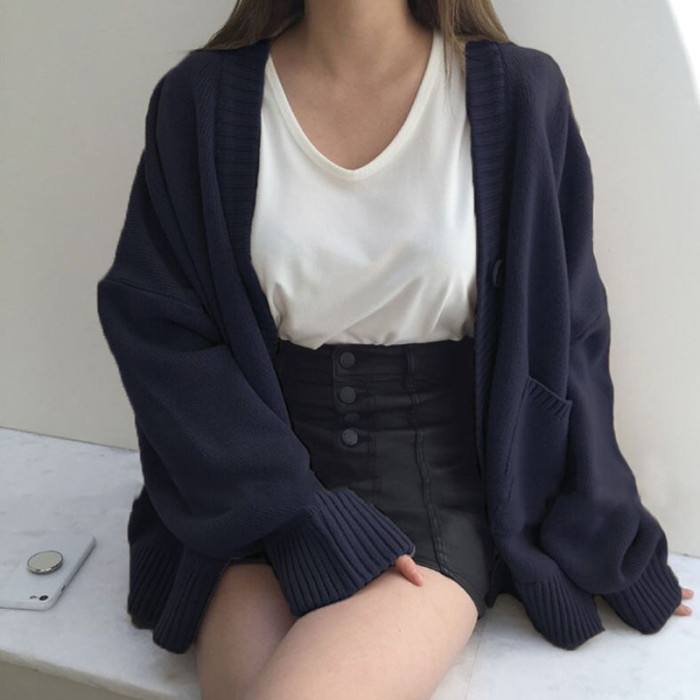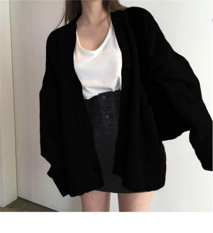 韓國秋冬V領藏青色針織開衫寬松外穿卡其色慵懶風黑色毛衣外套女