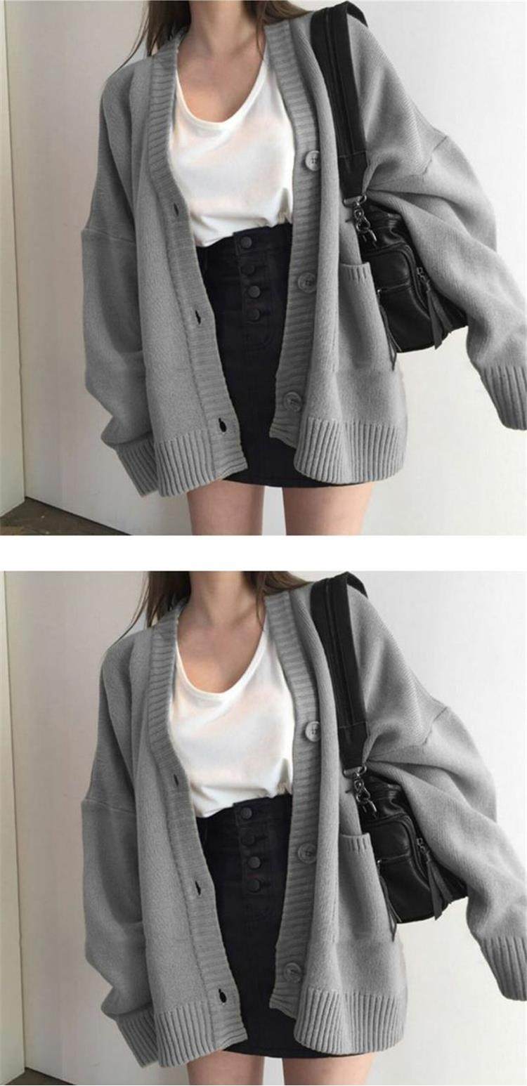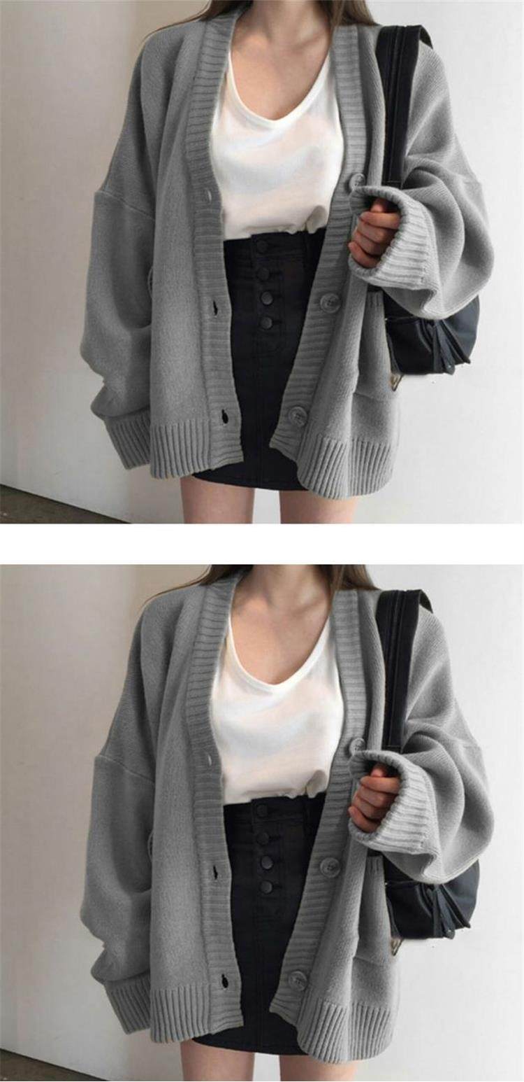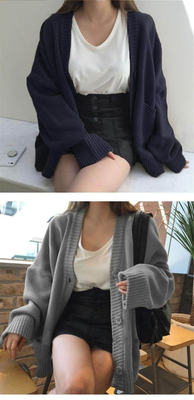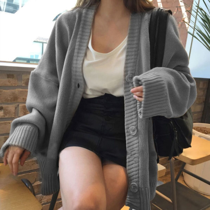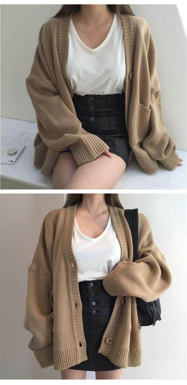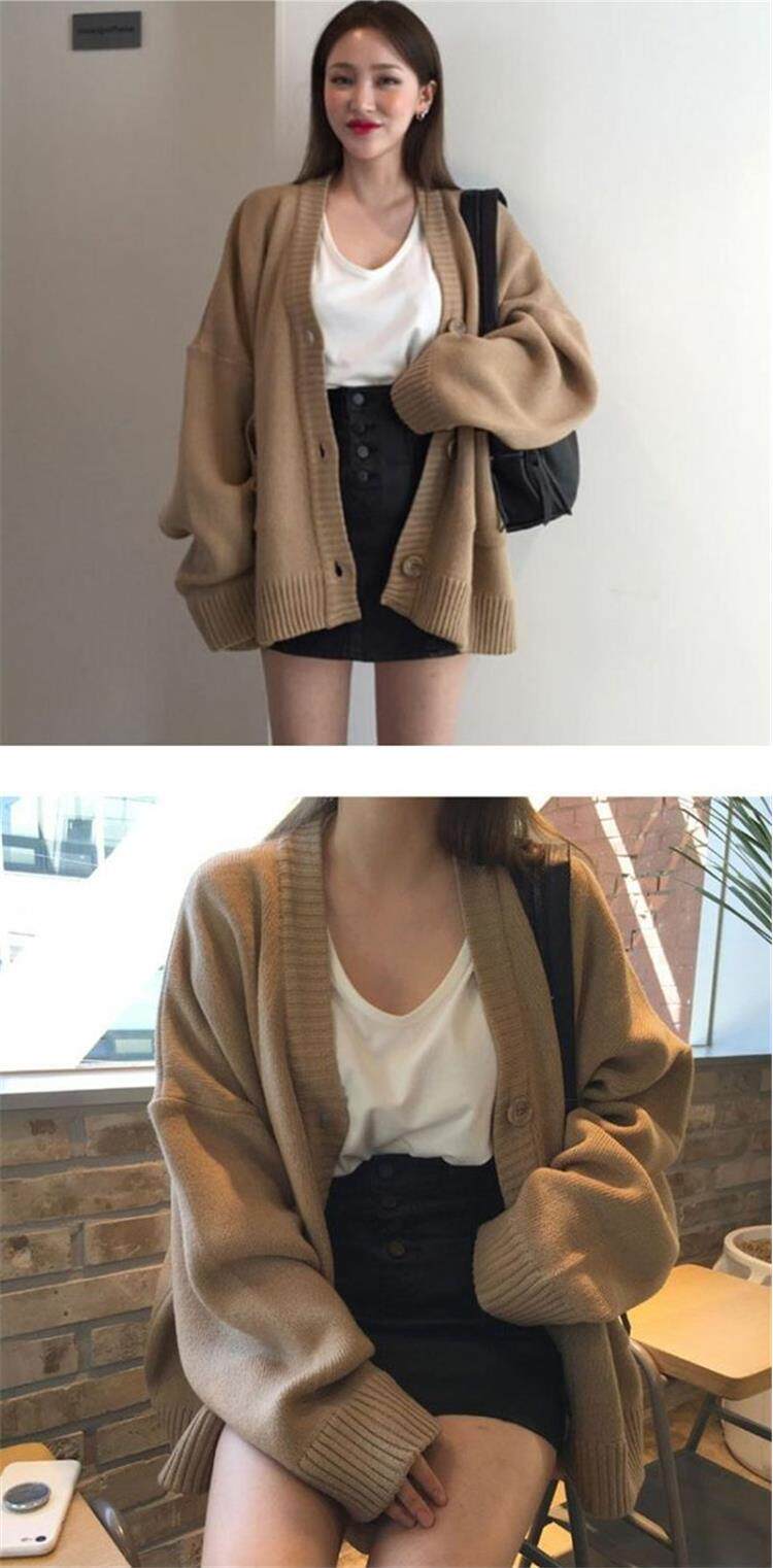 韓國秋冬V領藏青色針織開衫寬松外穿卡其色慵懶風黑色毛衣外套女