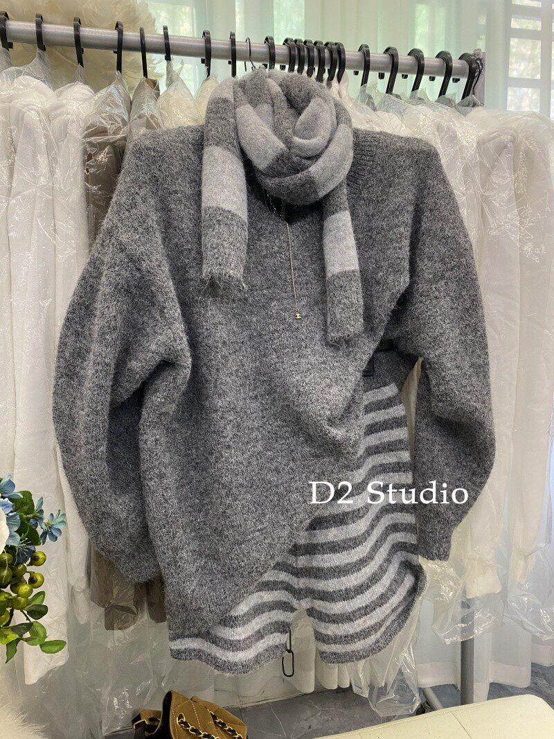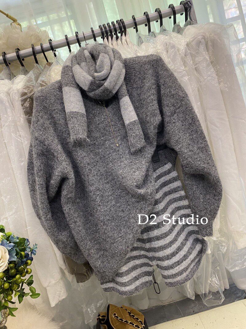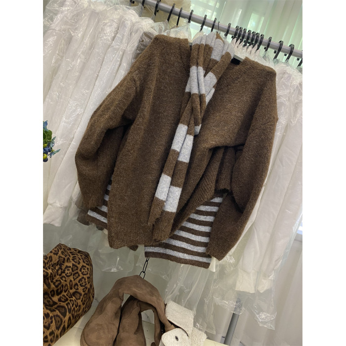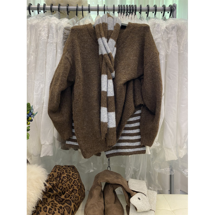 韓系新款小個子慵懶套裝女時尚寬松V領毛衣+條紋針織短褲配圍脖潮