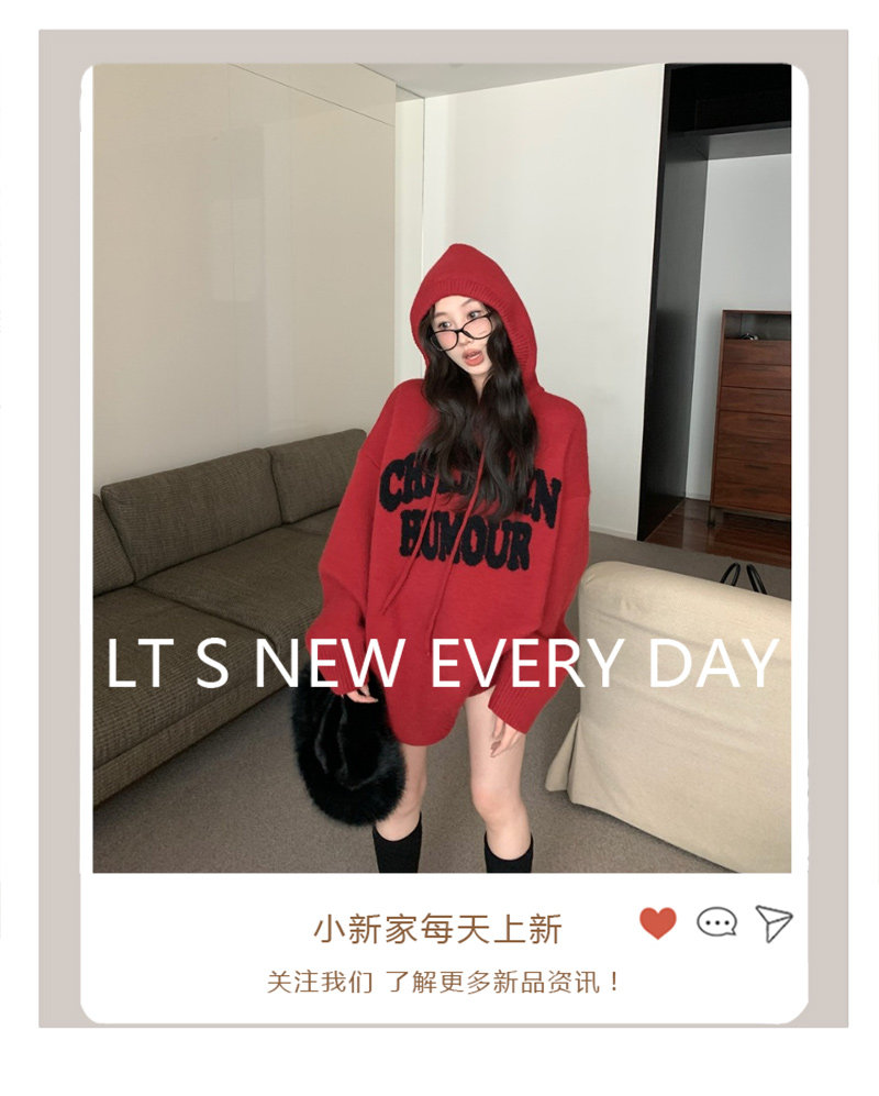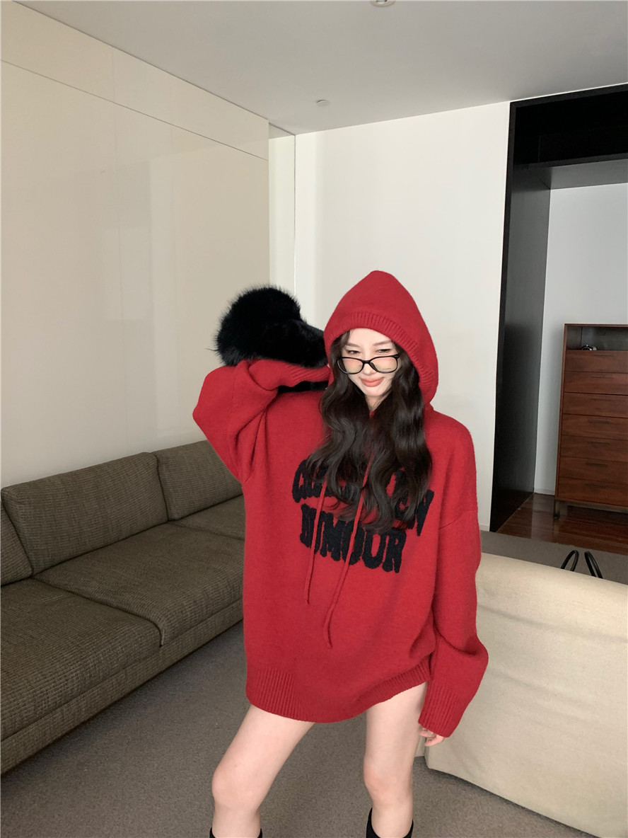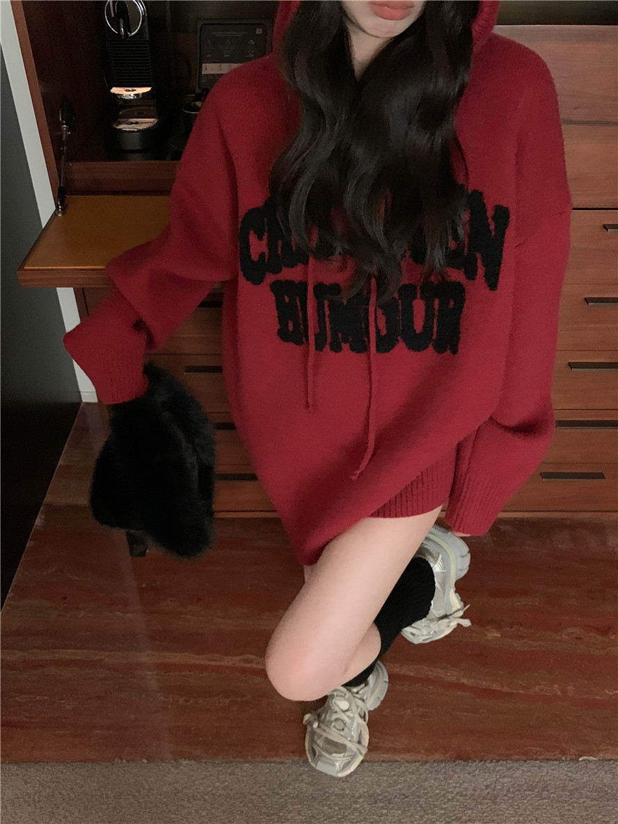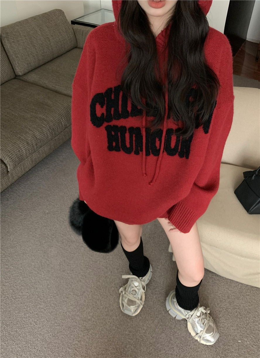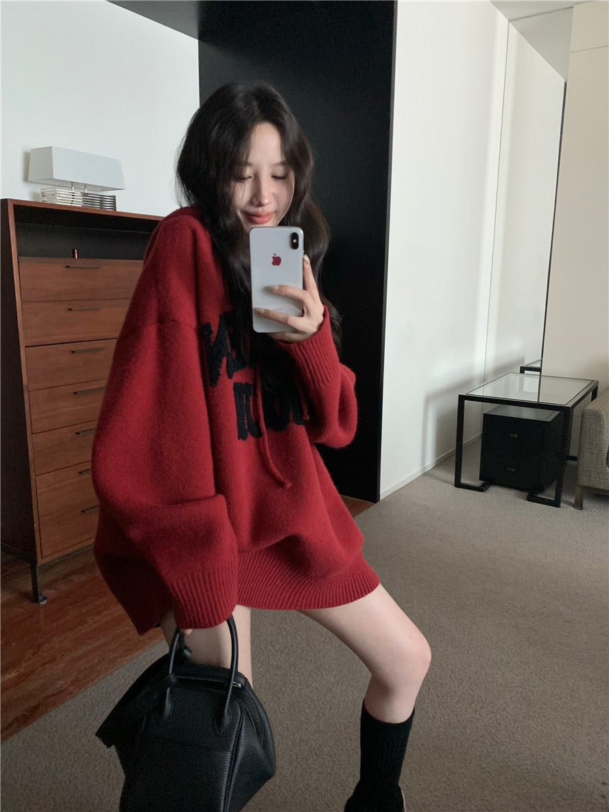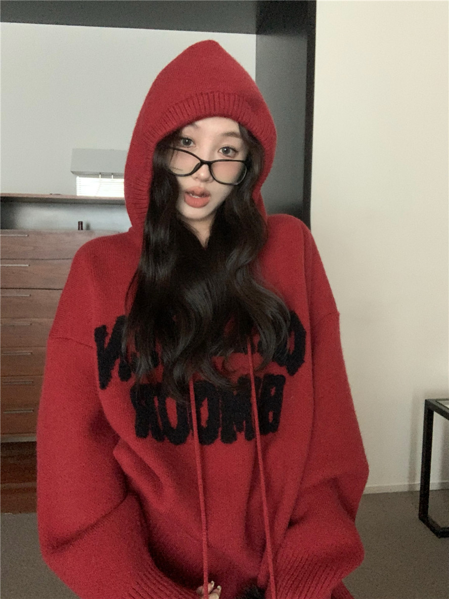 字母刺綉復古紅色連帽毛衣女春秋冬加厚慵懶風寬松安可拉針織衣服