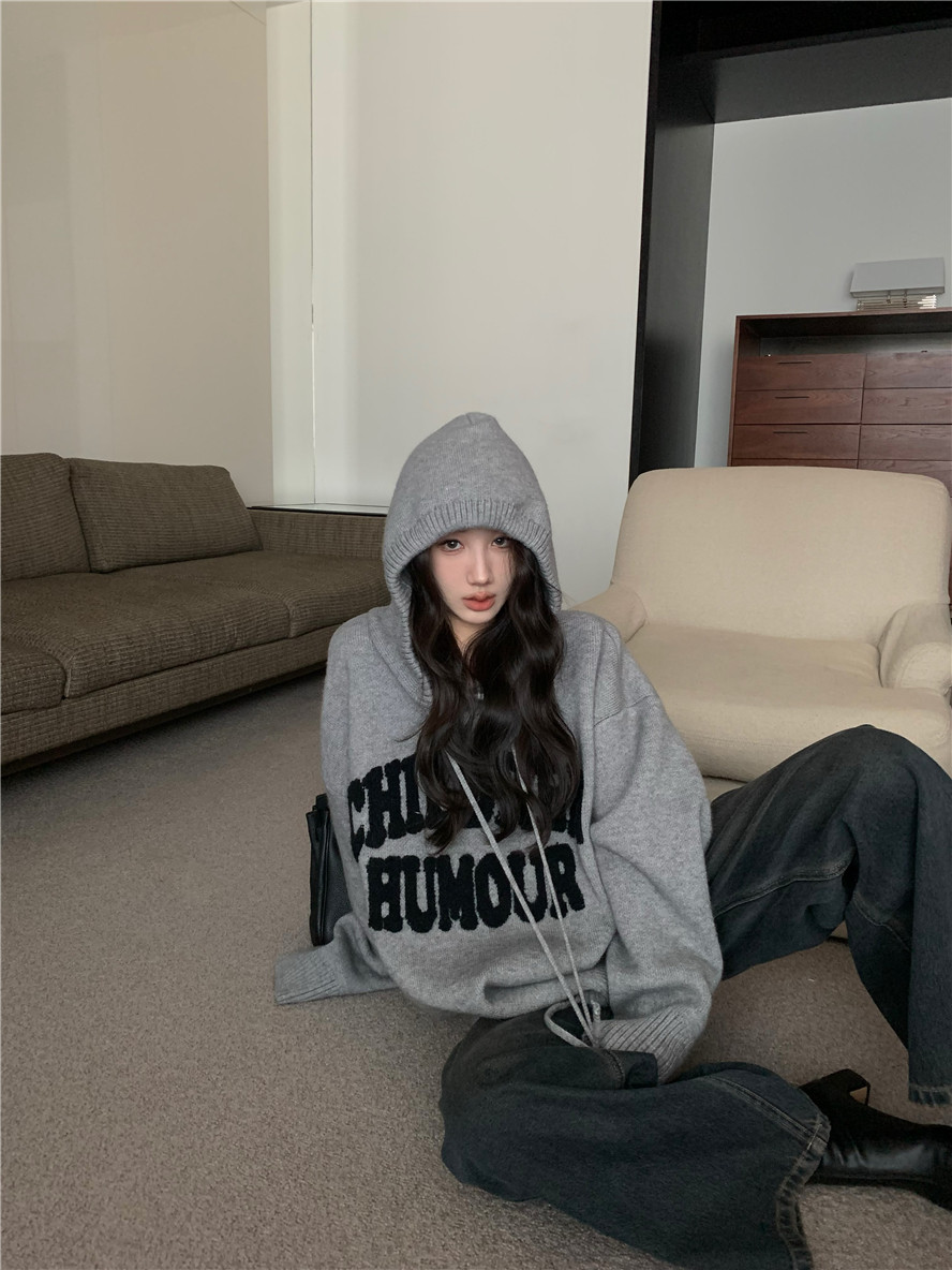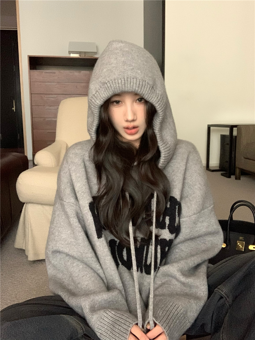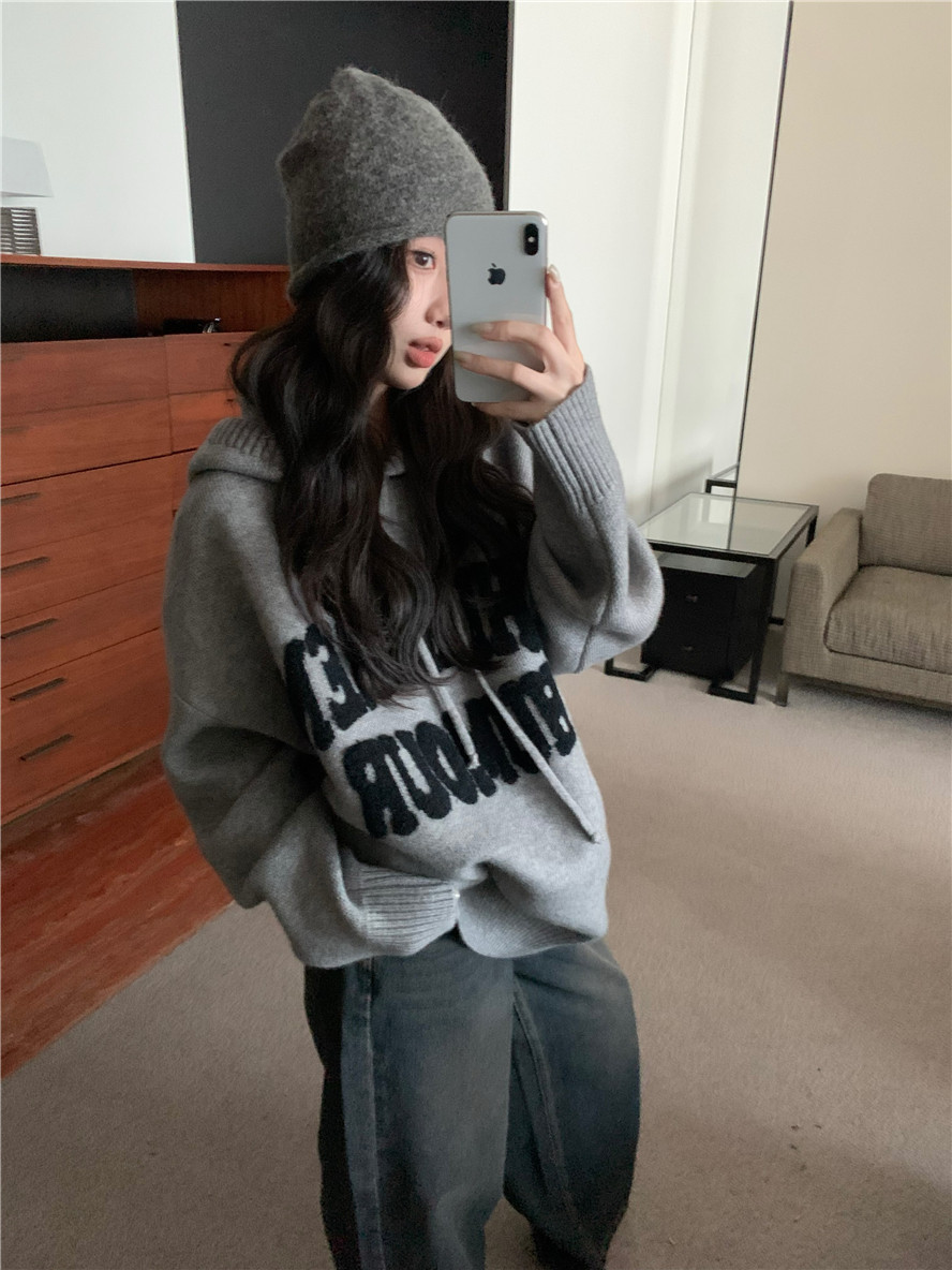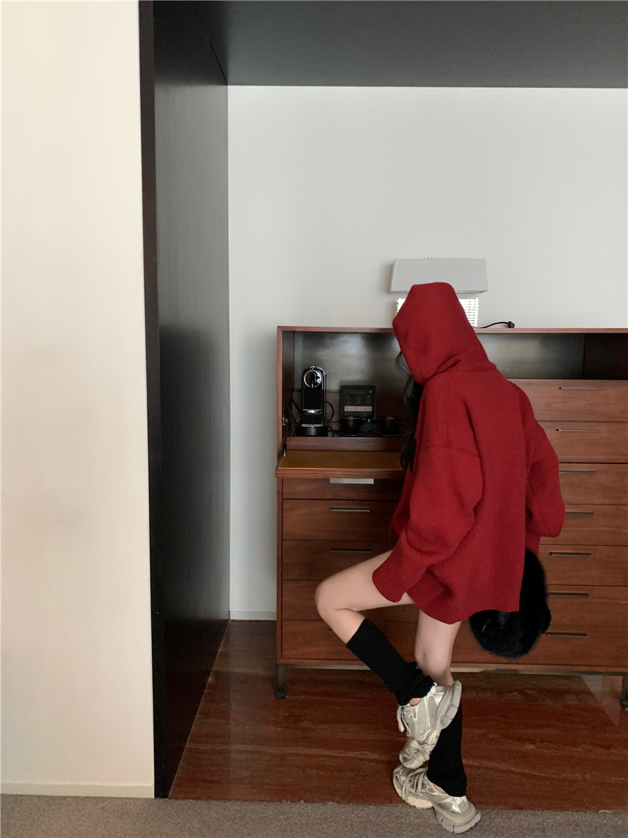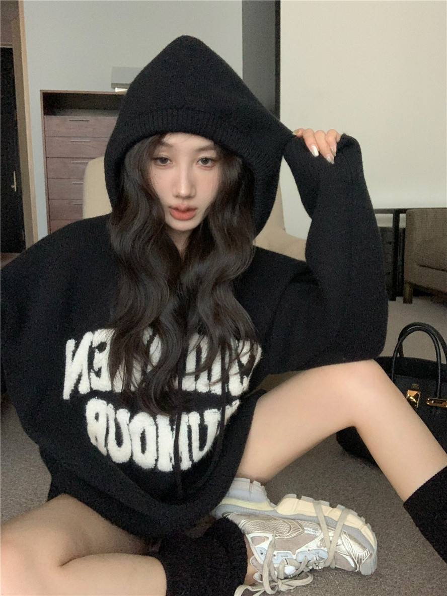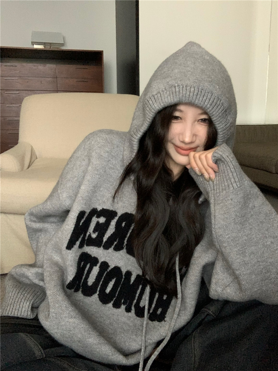 字母刺綉復古紅色連帽毛衣女春秋冬加厚慵懶風寬松安可拉針織衣服