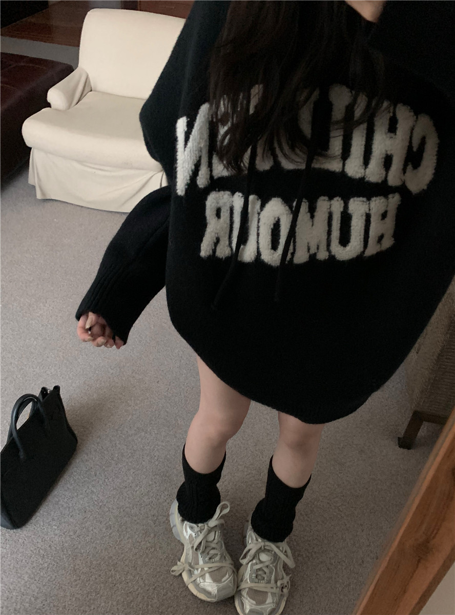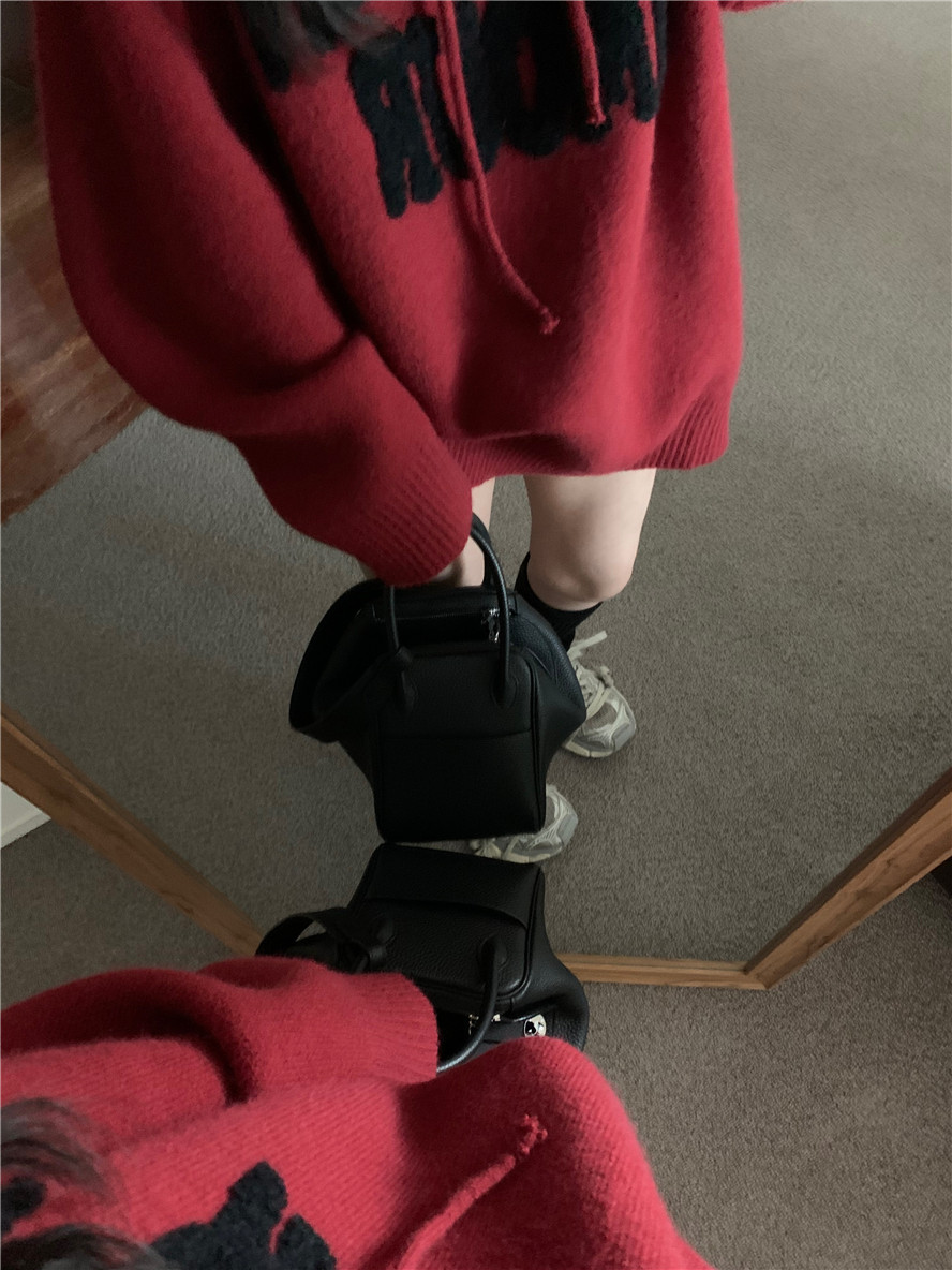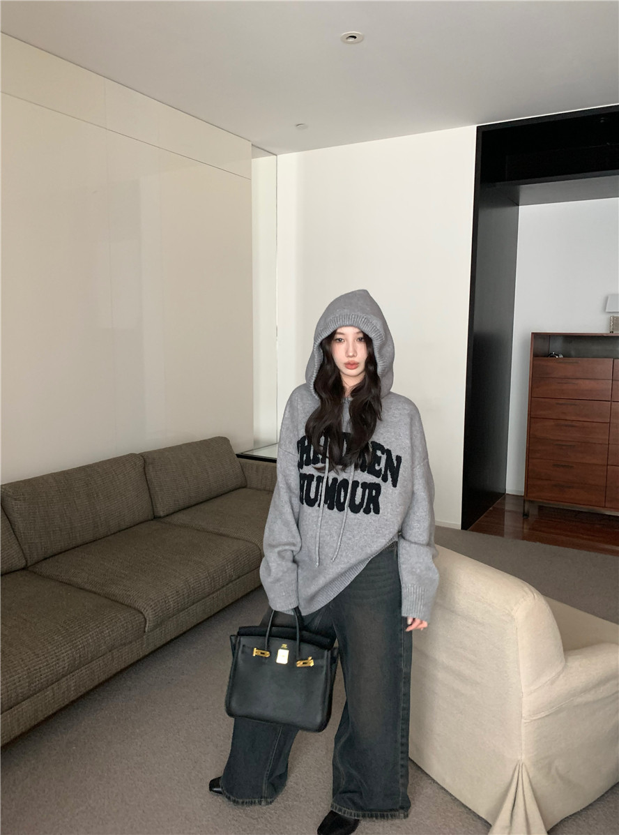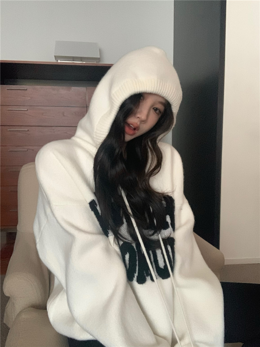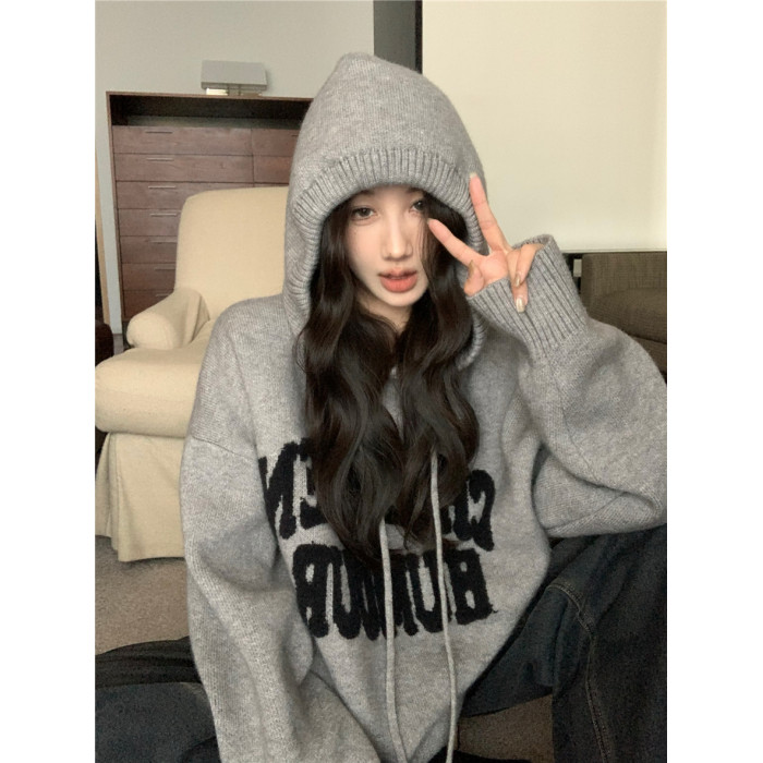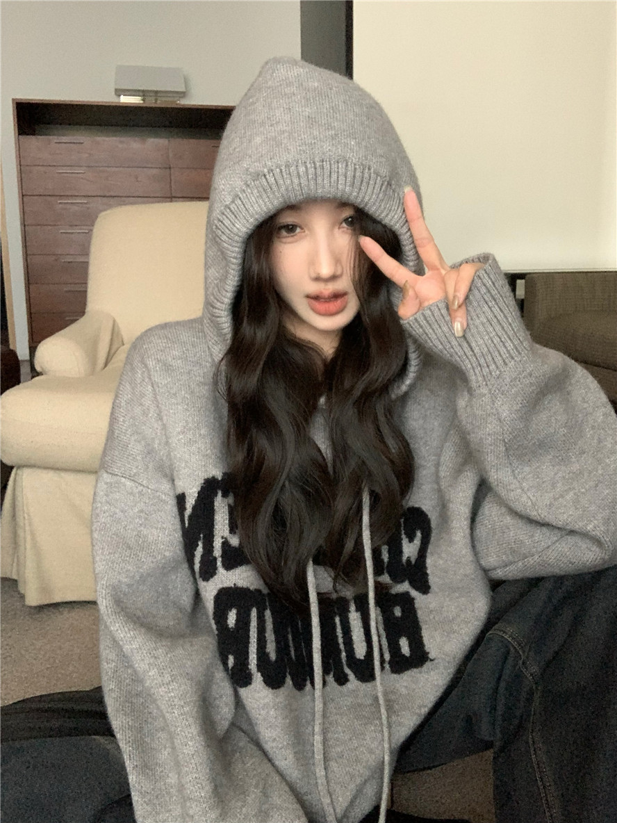 字母刺綉復古紅色連帽毛衣女春秋冬加厚慵懶風寬松安可拉針織衣服