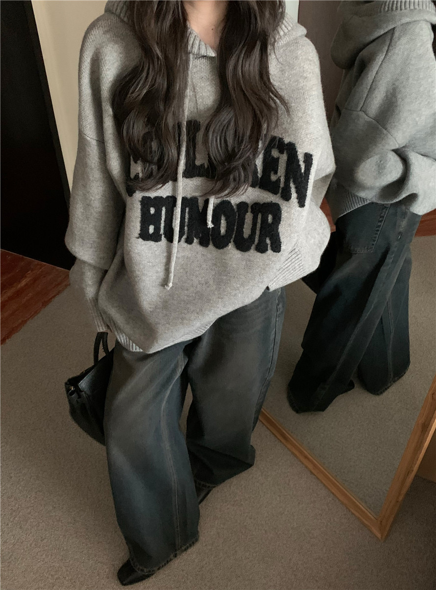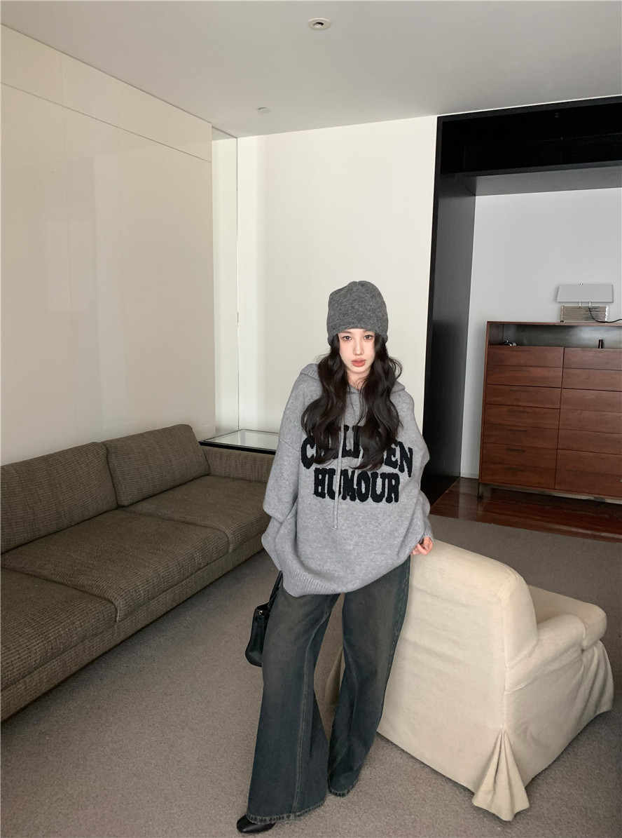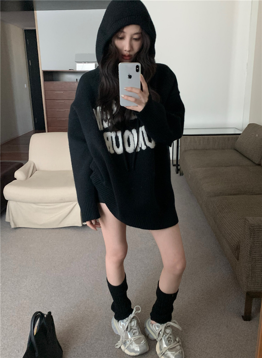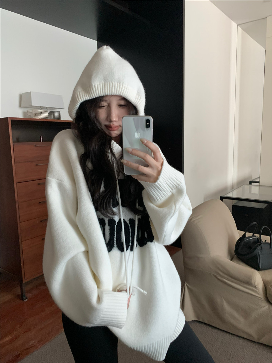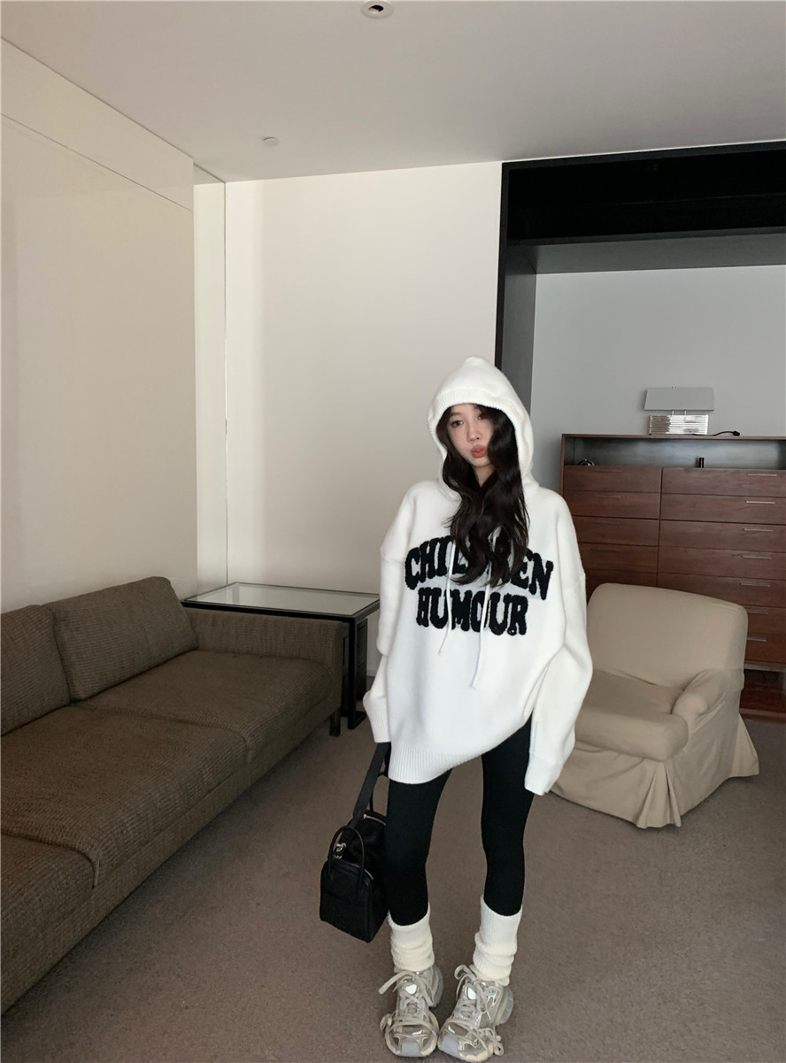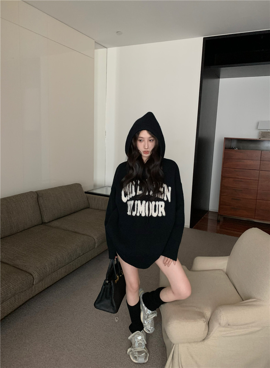 字母刺綉復古紅色連帽毛衣女春秋冬加厚慵懶風寬松安可拉針織衣服