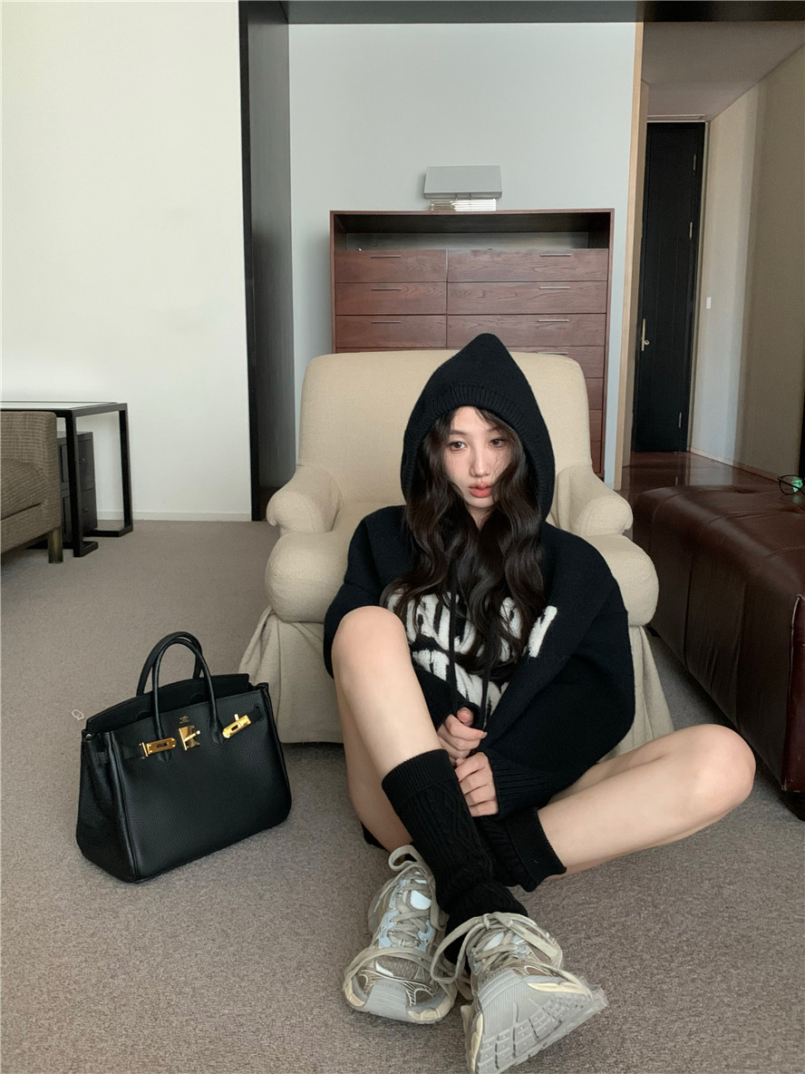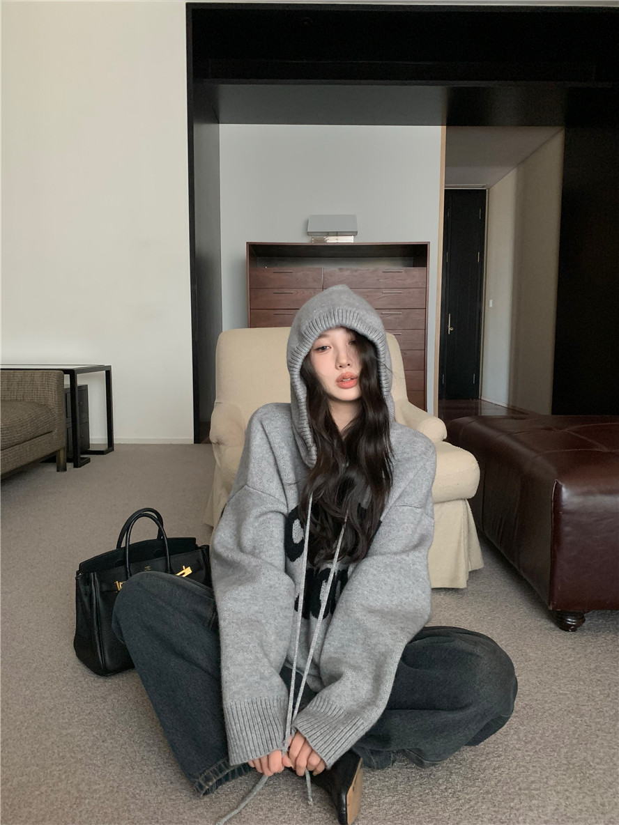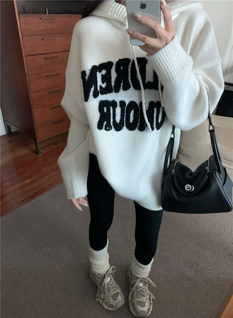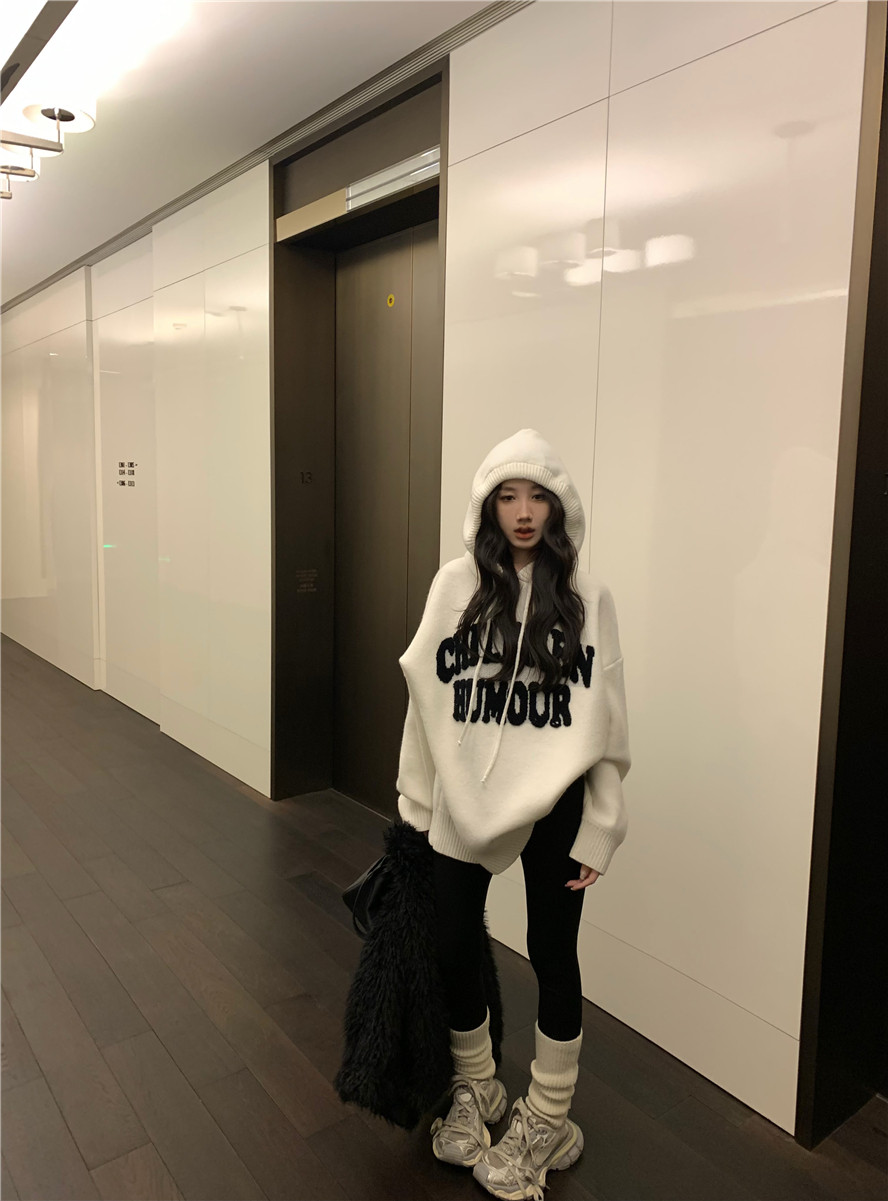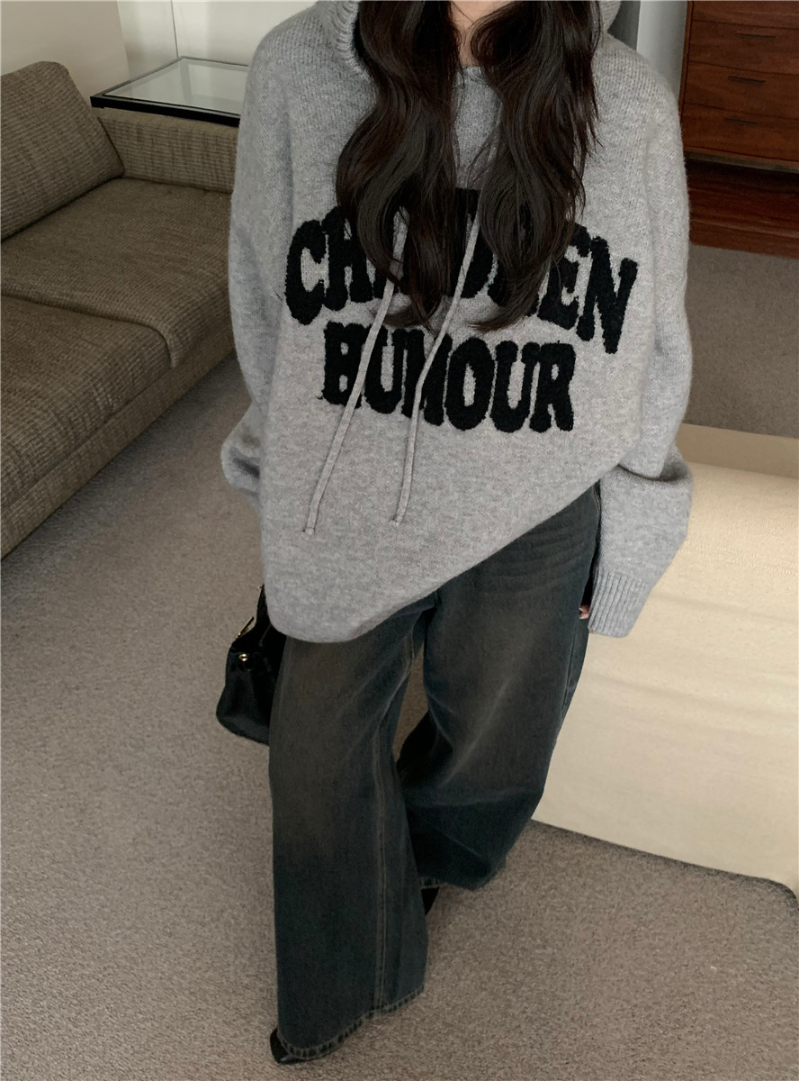 字母刺綉復古紅色連帽毛衣女春秋冬加厚慵懶風寬松安可拉針織衣服