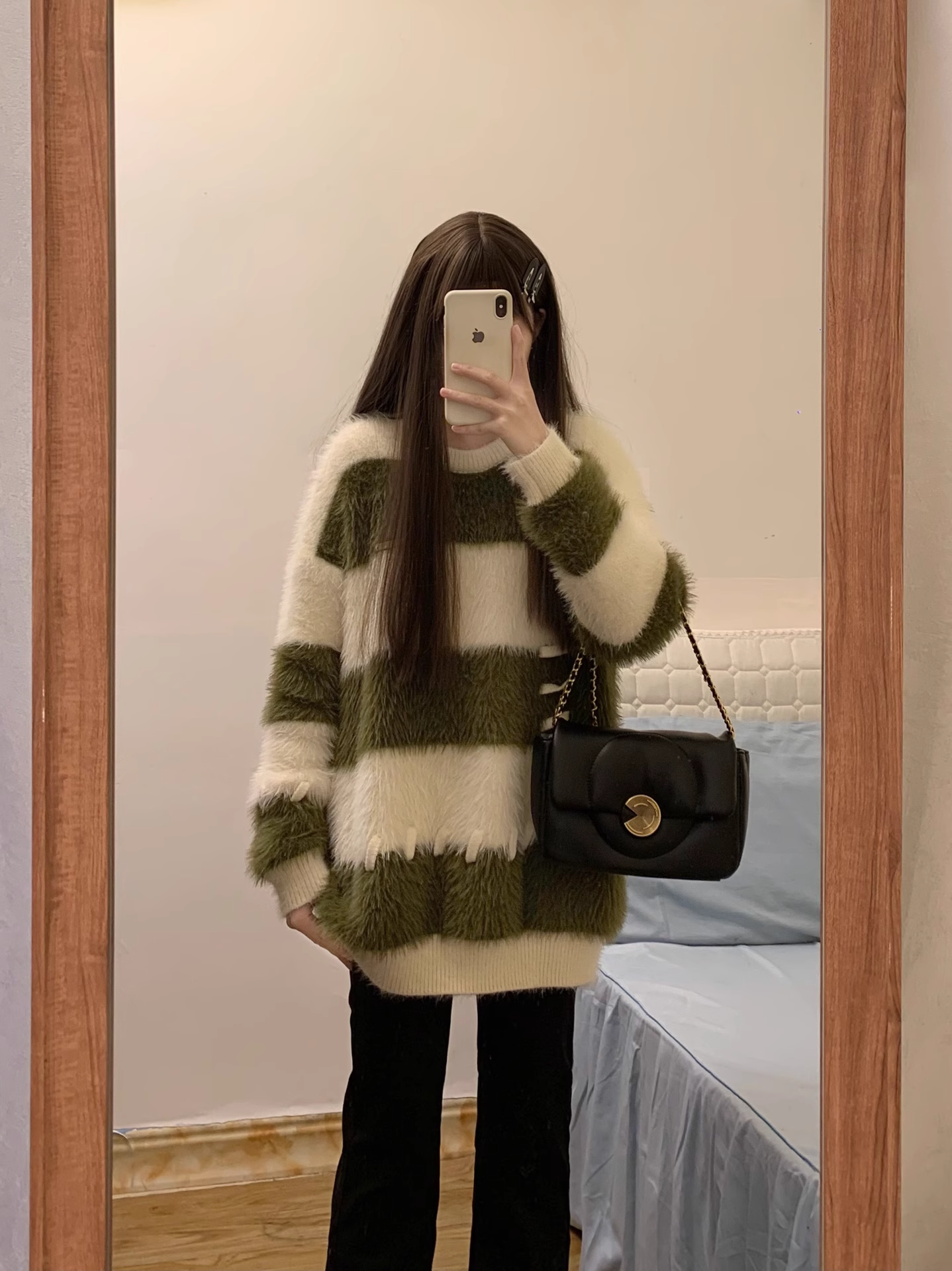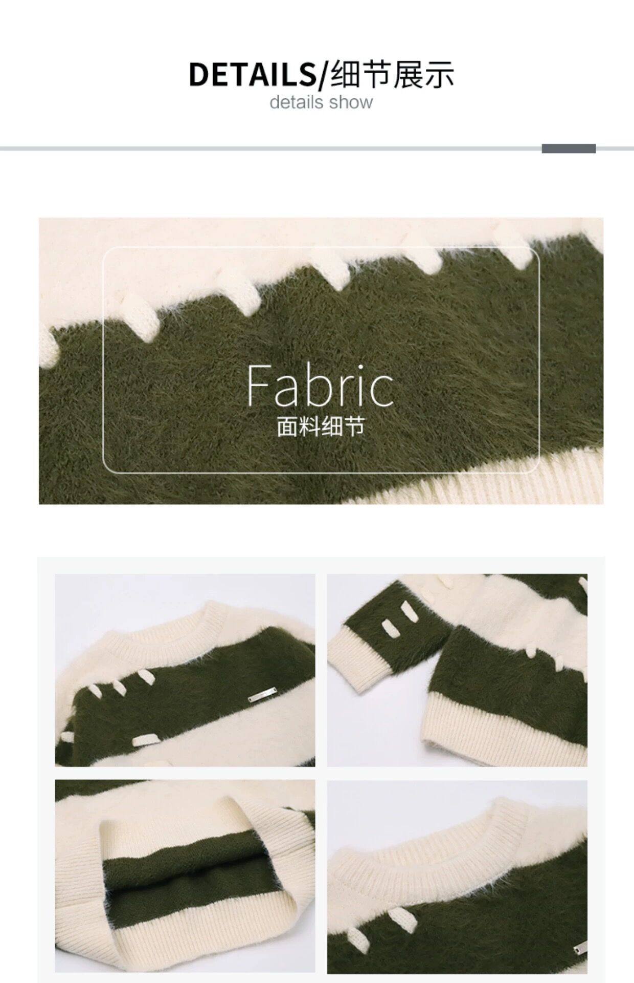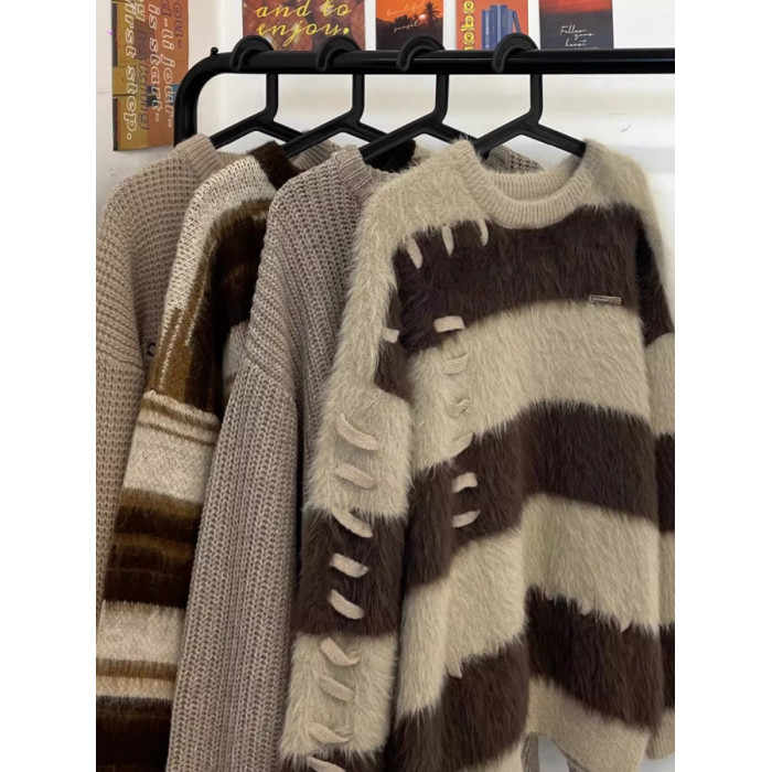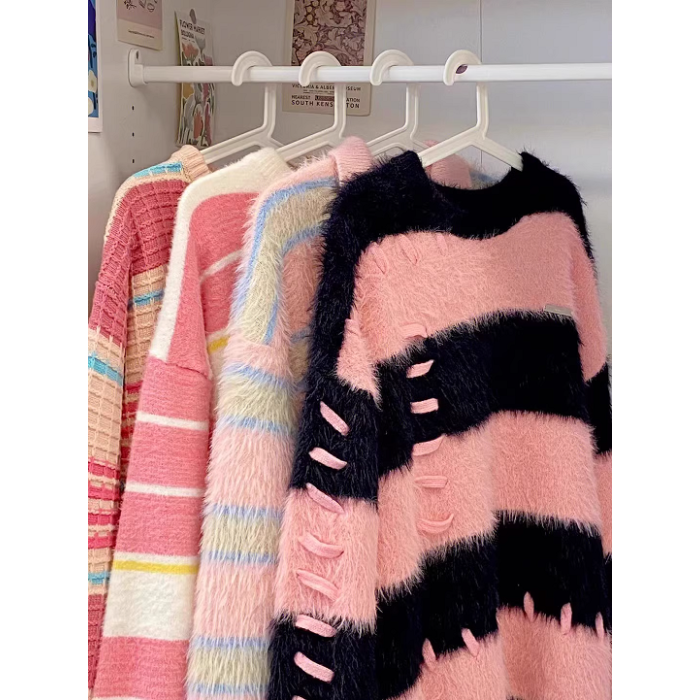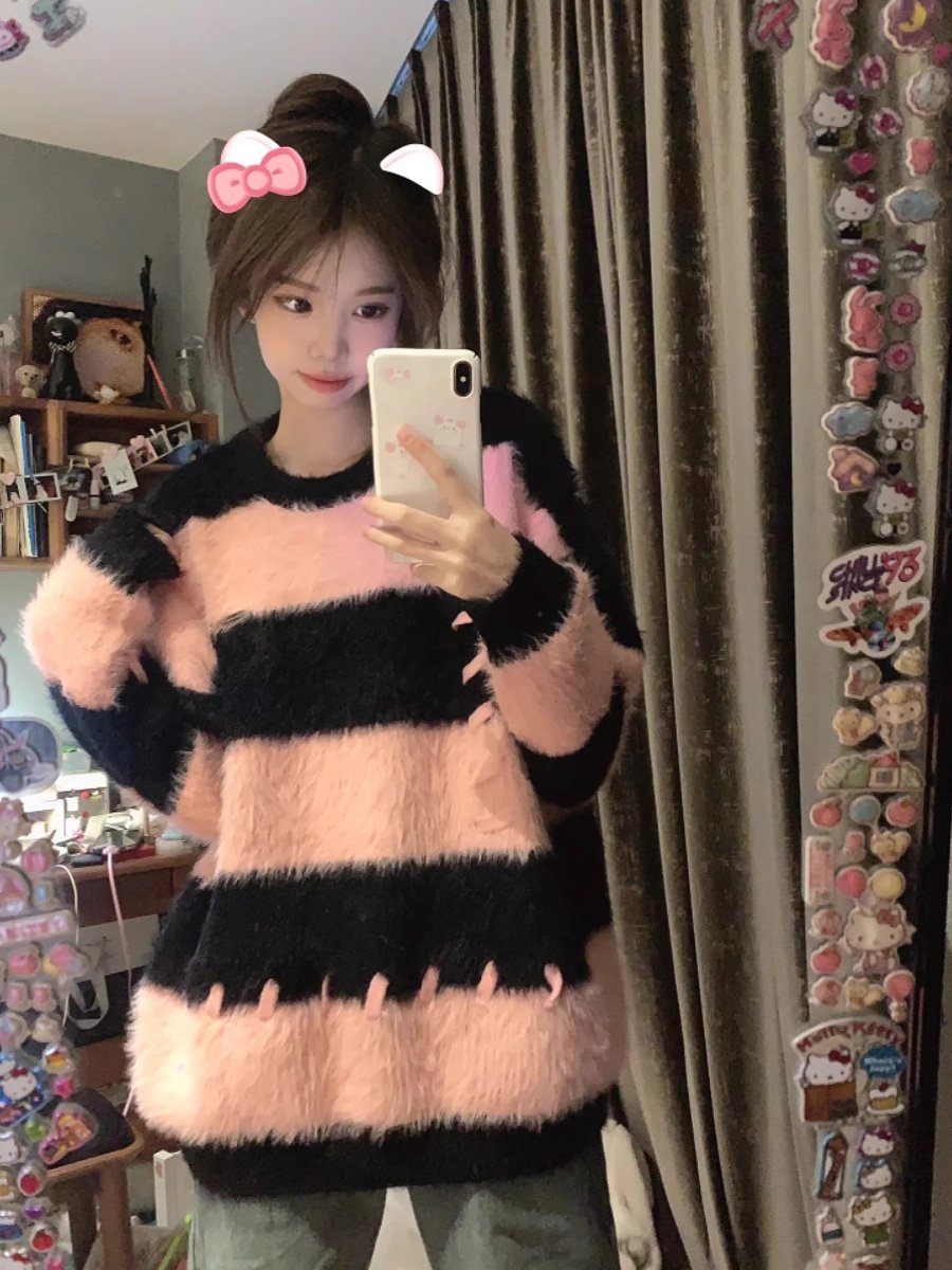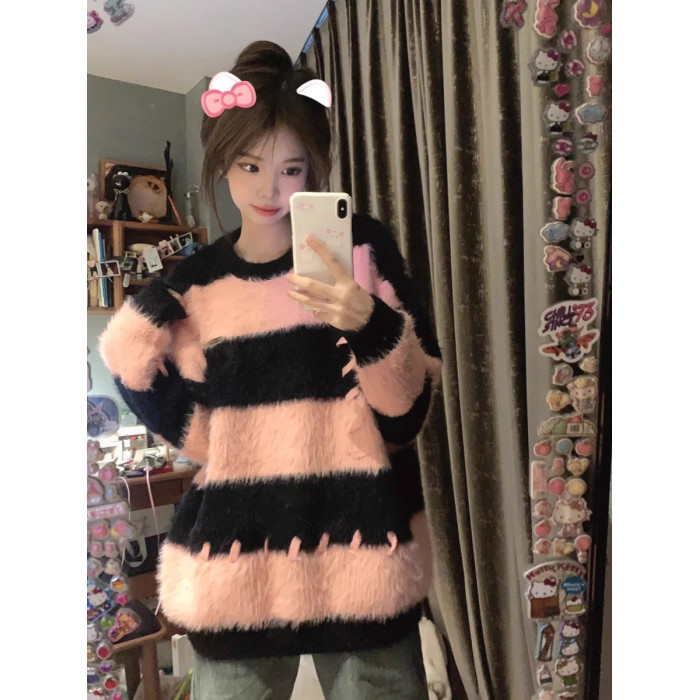 軟糯水貂絨條紋撞色毛衣女秋冬季寬松設計感小衆慵懶風針織衫上衣