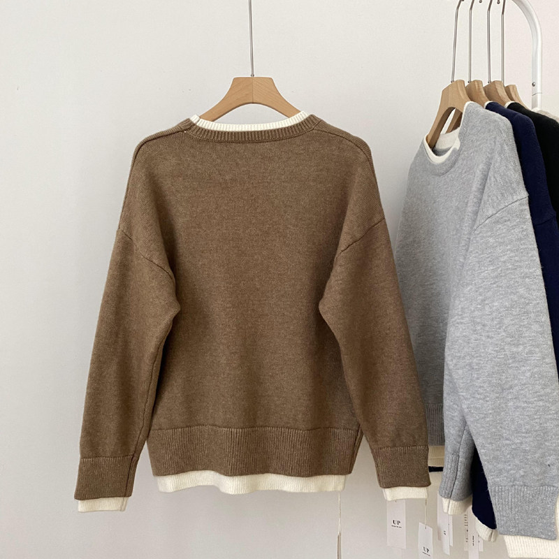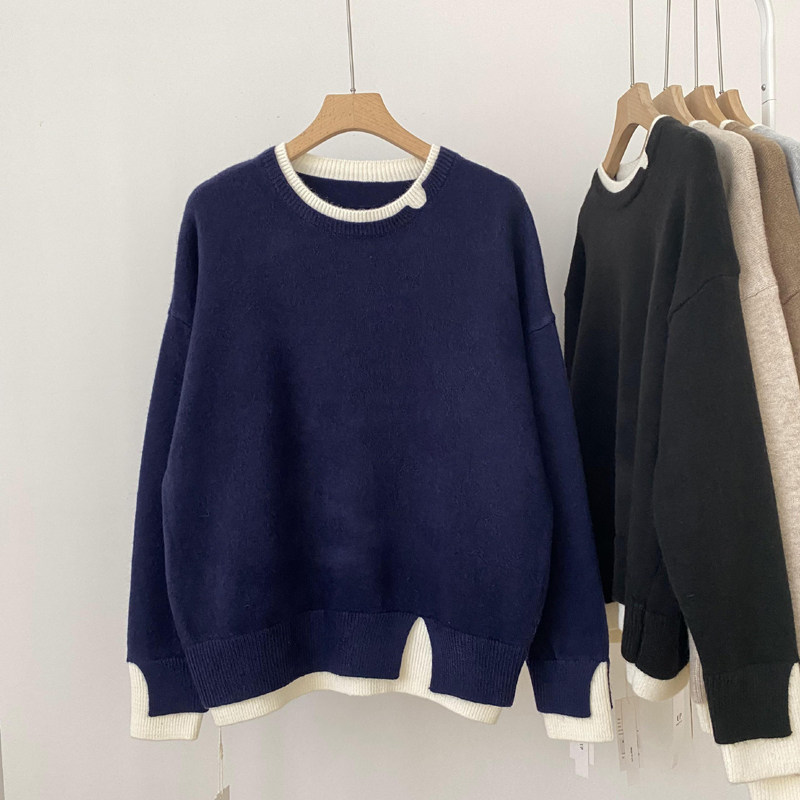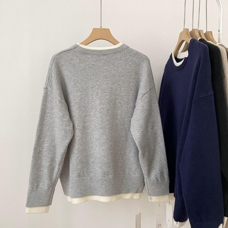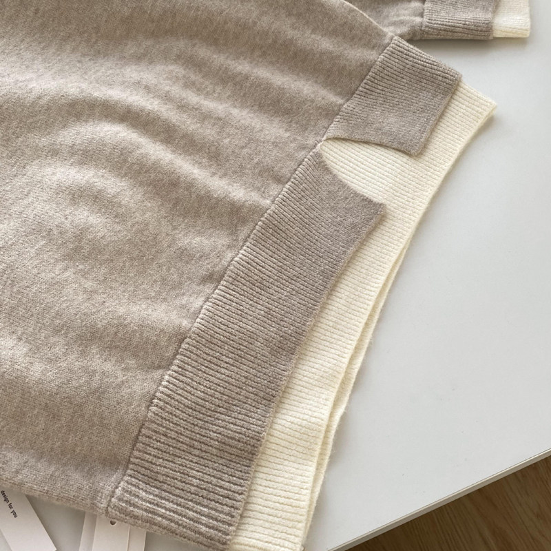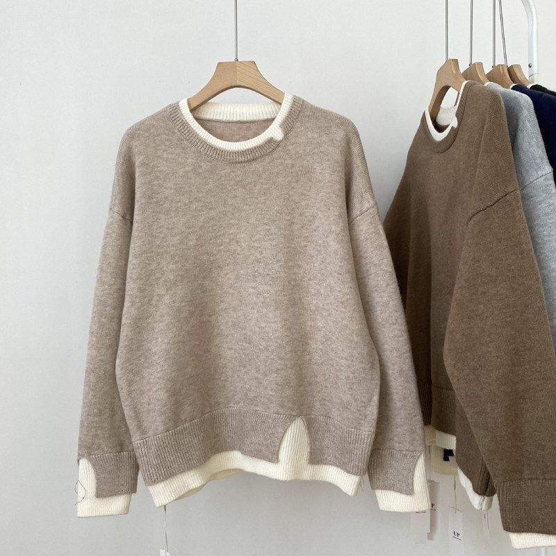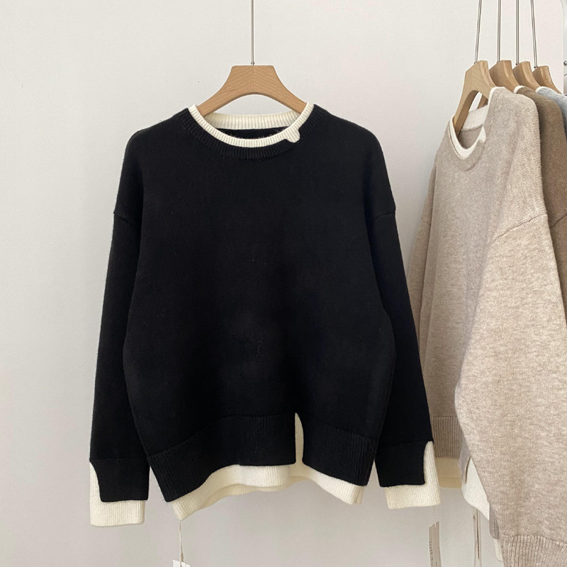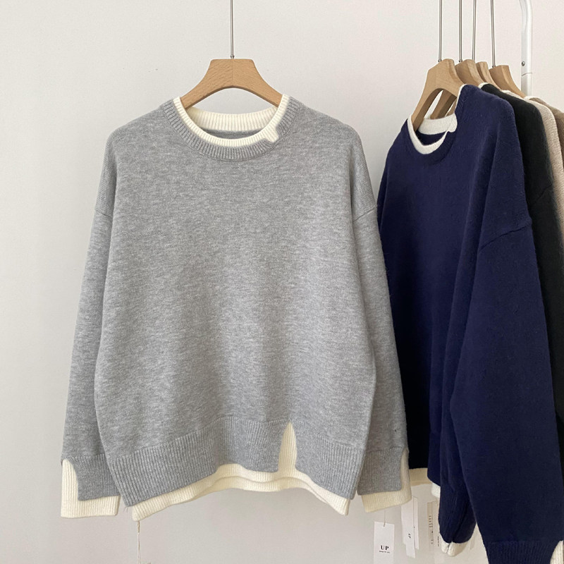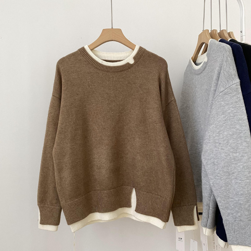 圓領針織衫外套女秋冬季新款寬松顯瘦假兩件開叉拼接套頭減齡毛衣