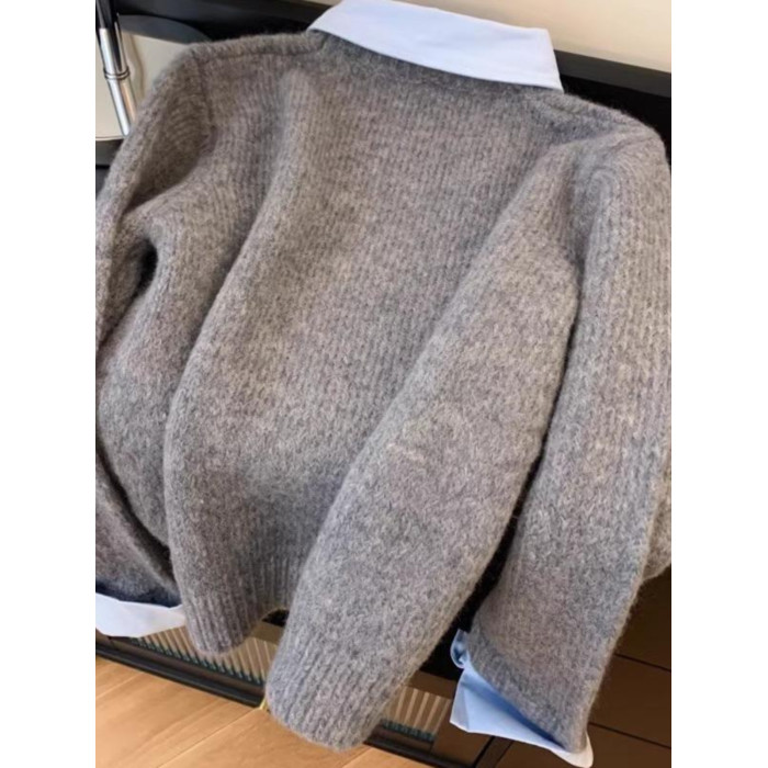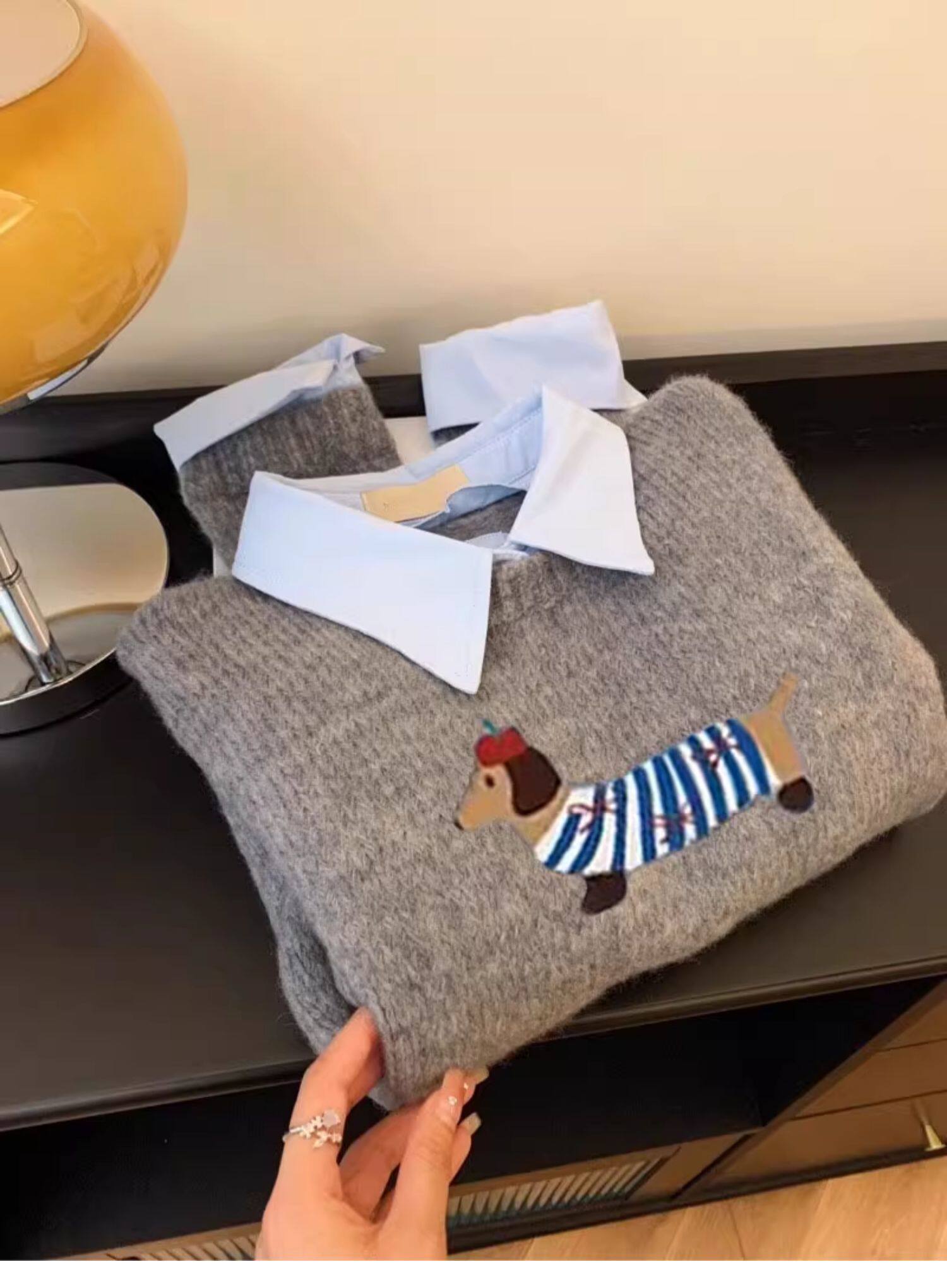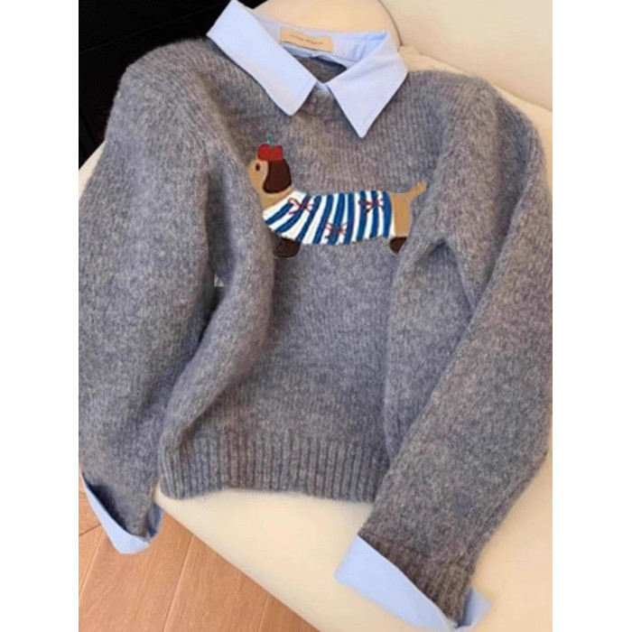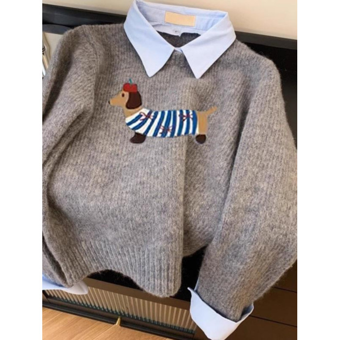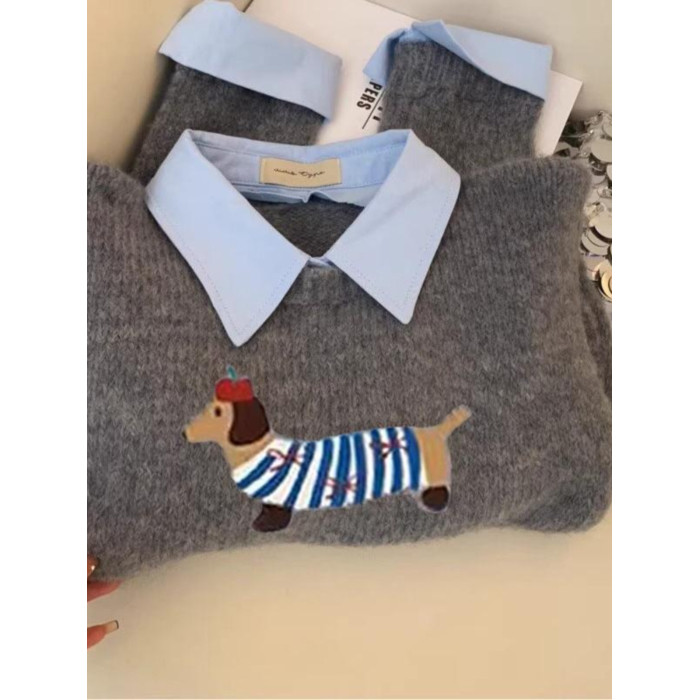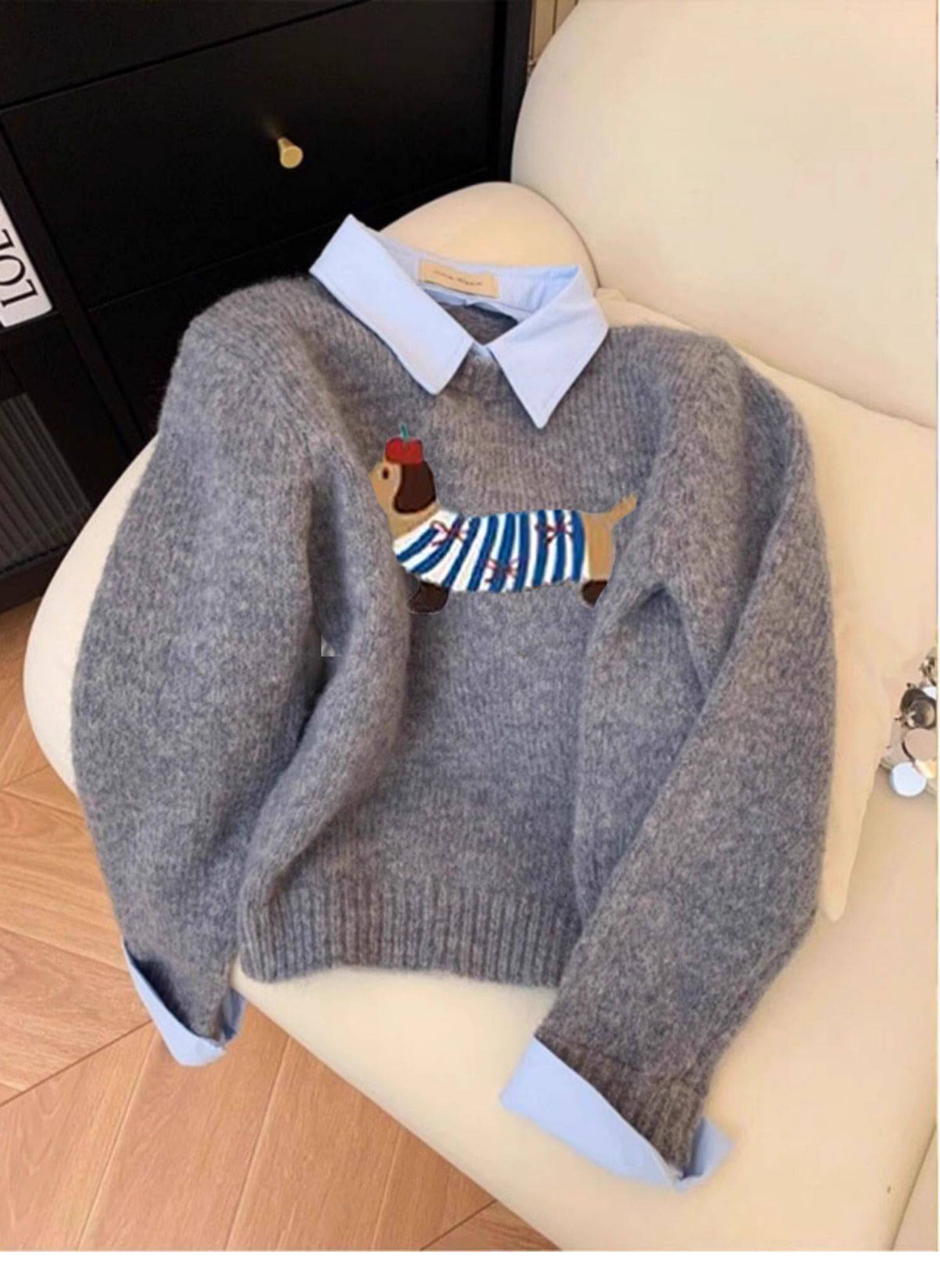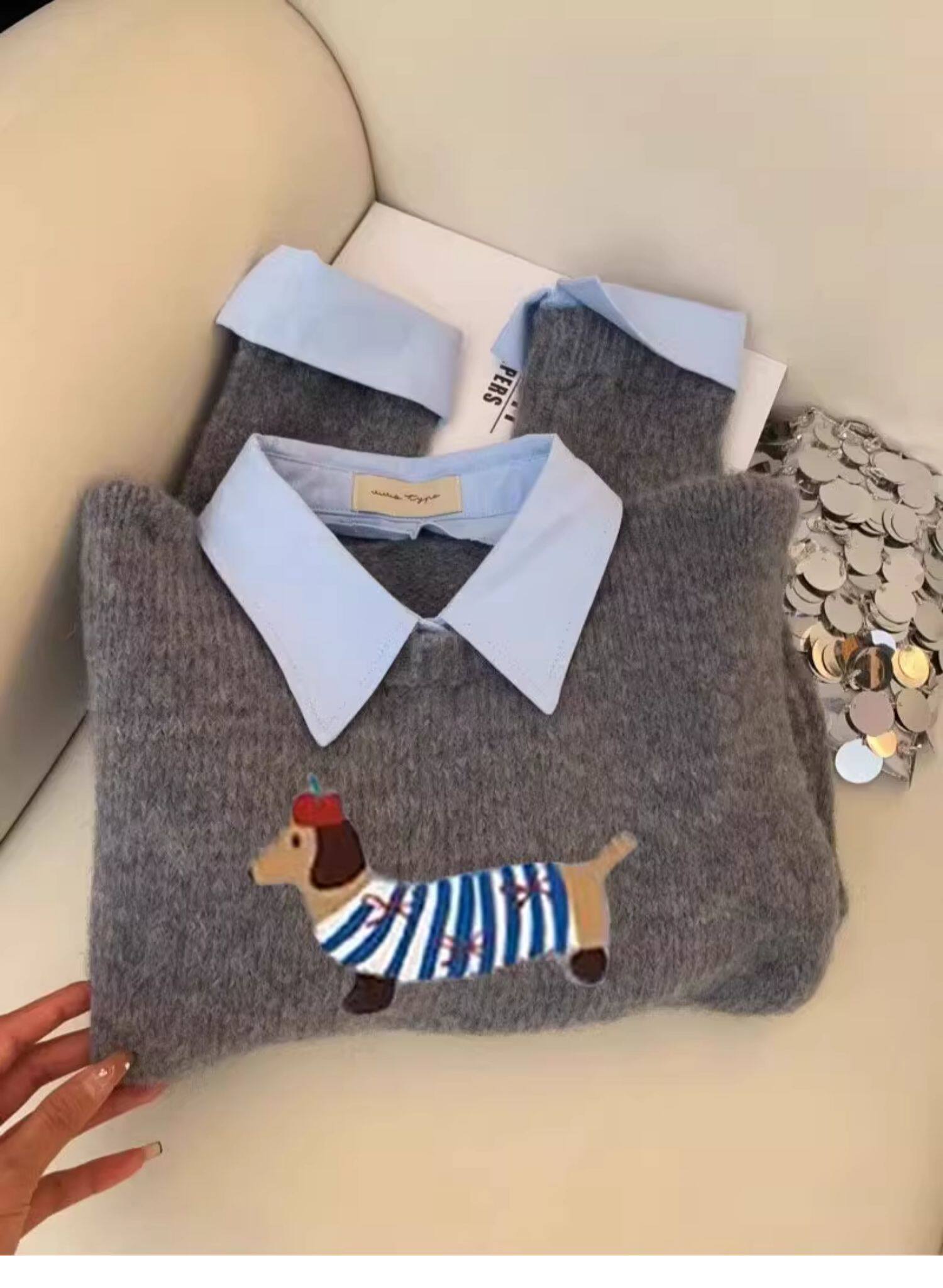 設計感小狗卡通軟糯灰色假兩件襯衫領針織衫女上衣2025秋新款毛衣