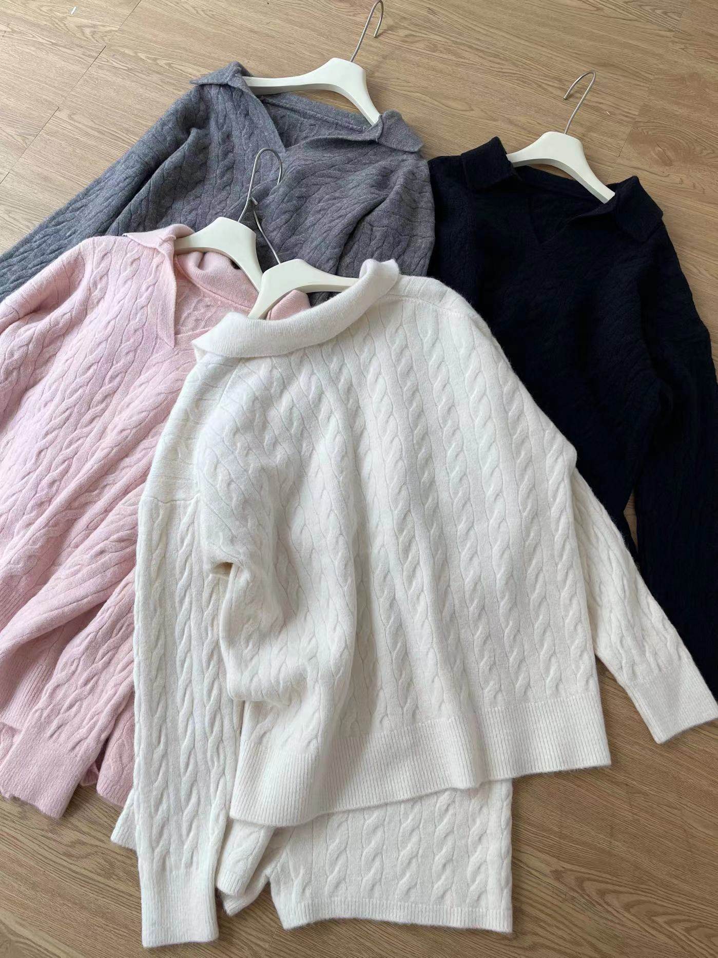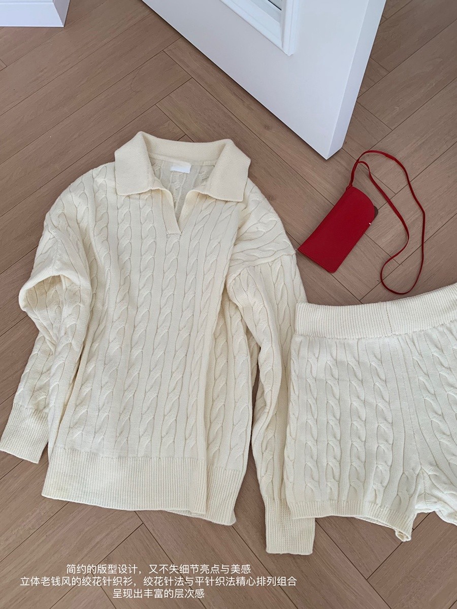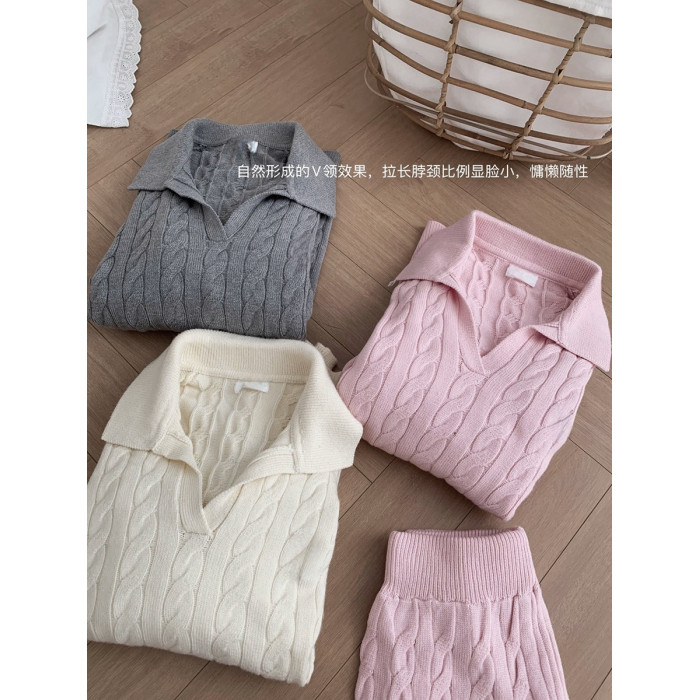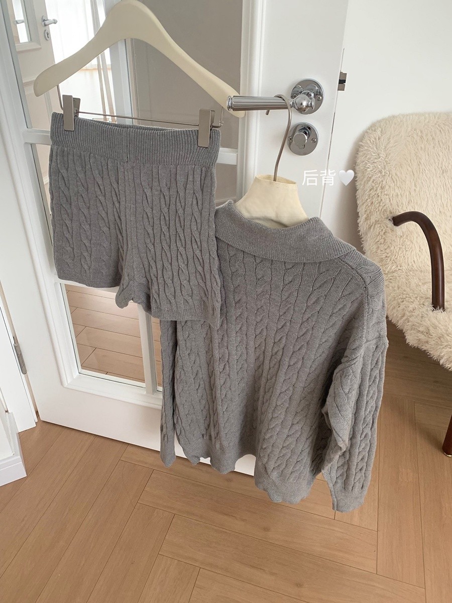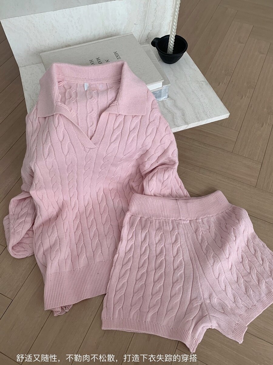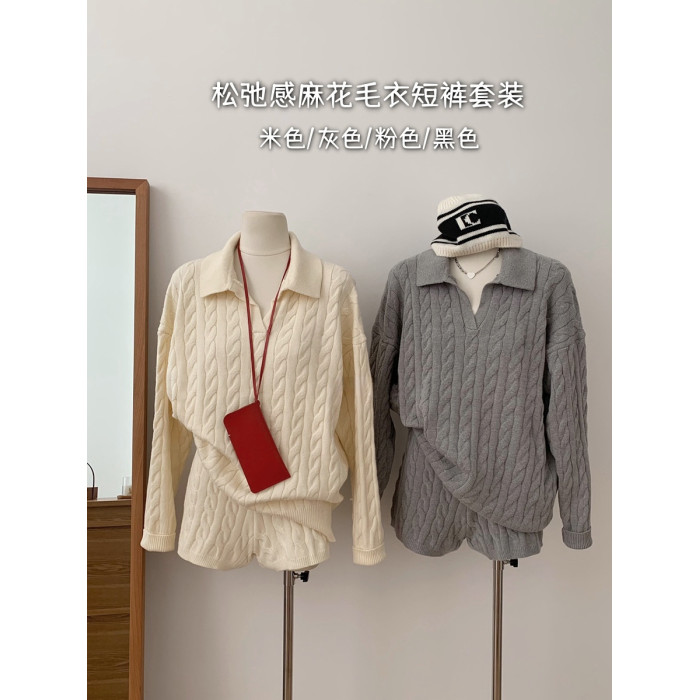 阿肉Ree 慵懶風毛衣套裝女秋冬麻花v領寬松針織上衣+短褲兩件套
