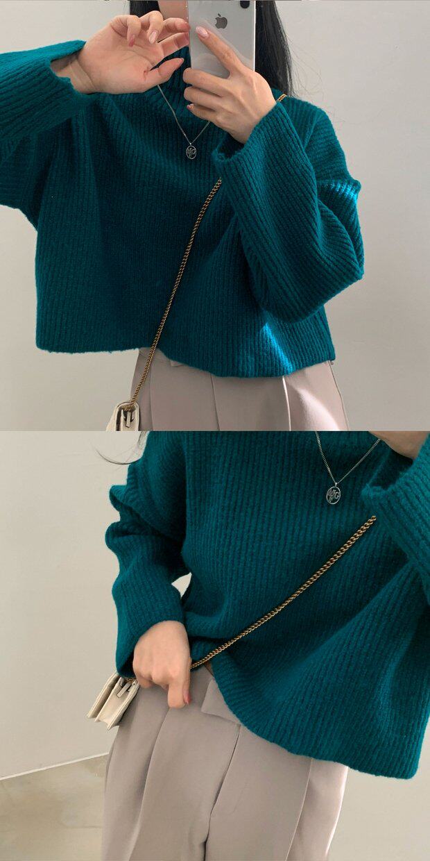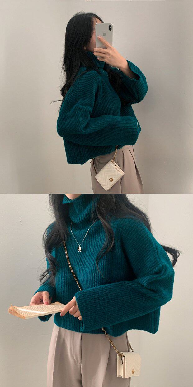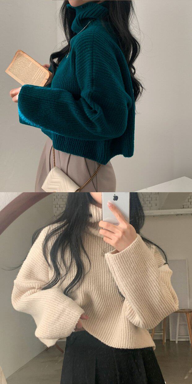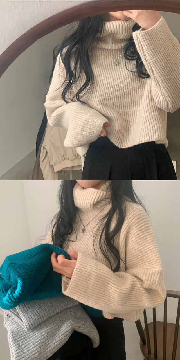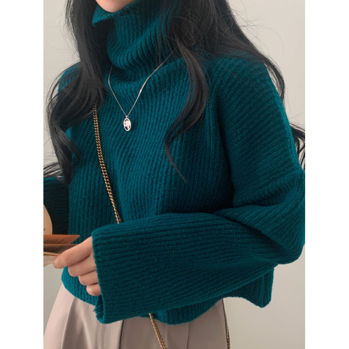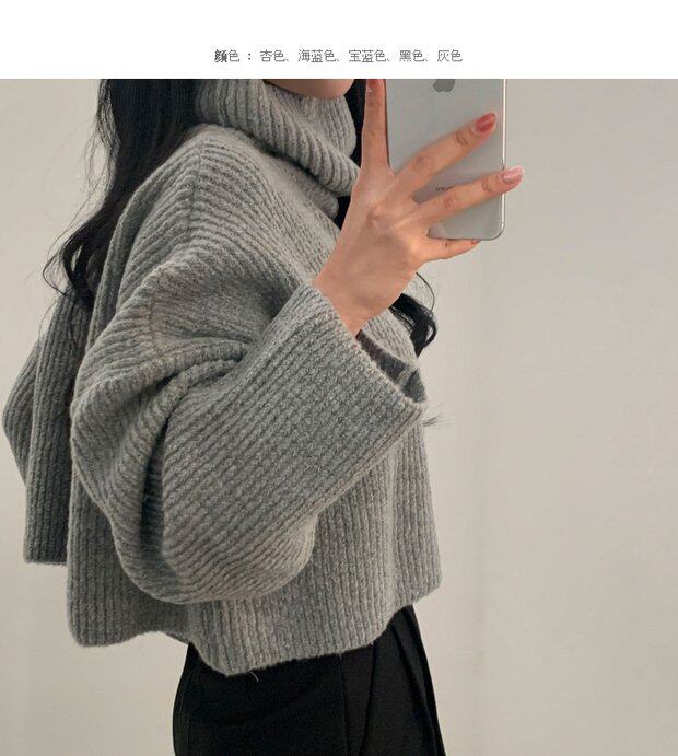 韓國chic秋冬加厚高領毛衣女慵懶風純色百搭寬松長袖短款針織衫潮