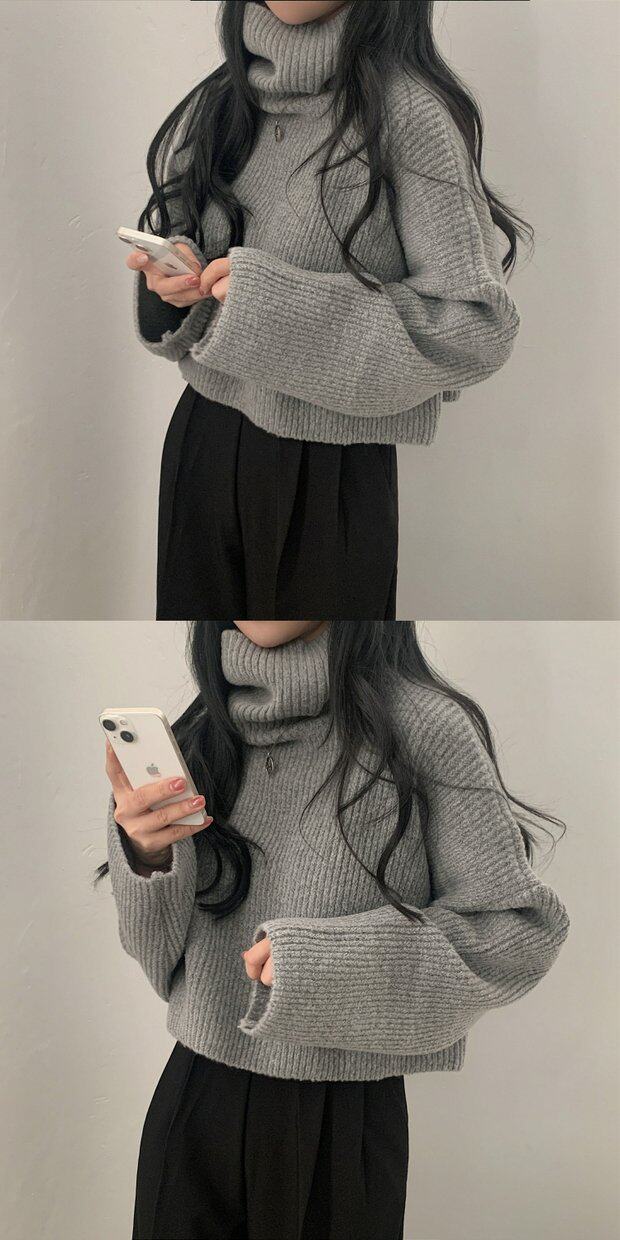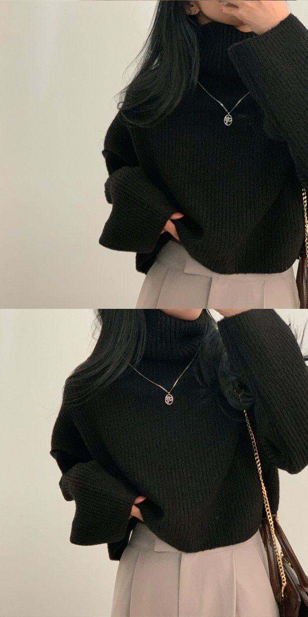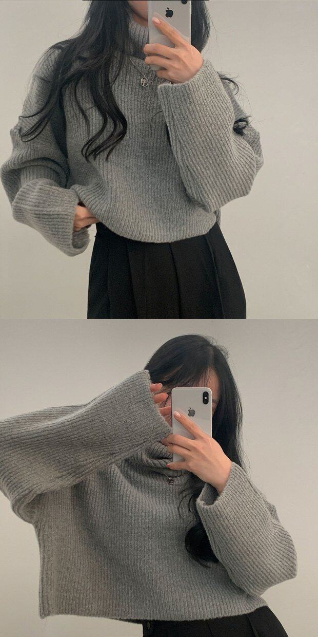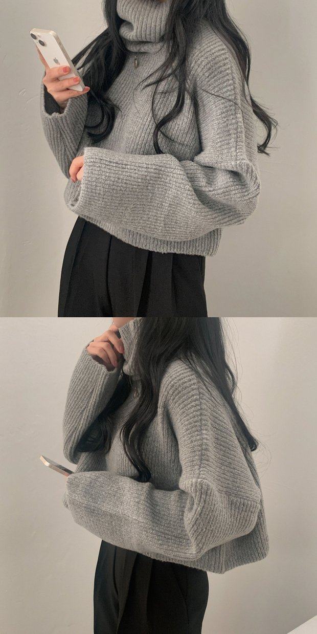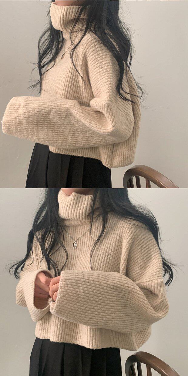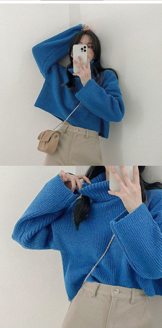 韓國chic秋冬加厚高領毛衣女慵懶風純色百搭寬松長袖短款針織衫潮