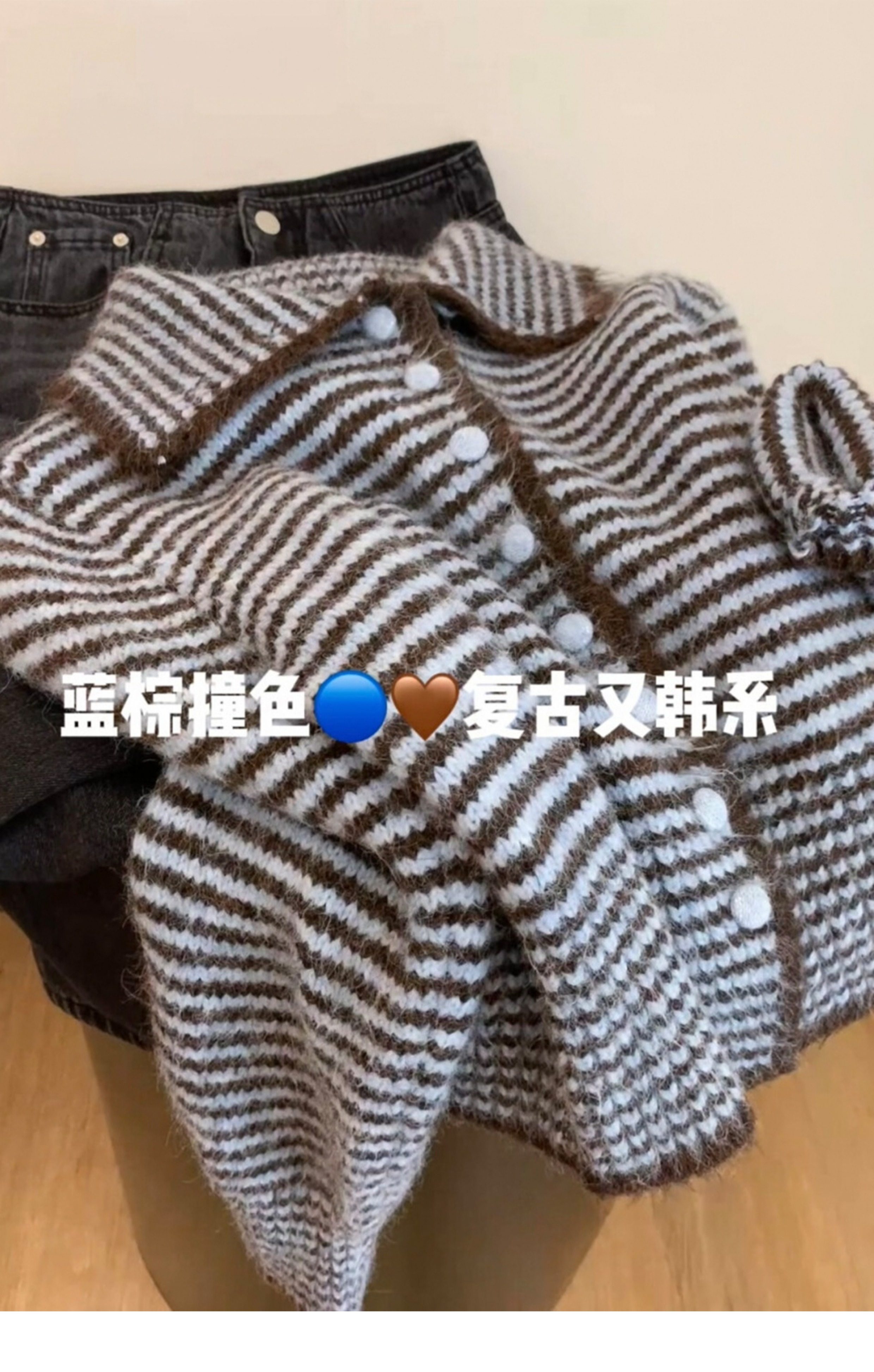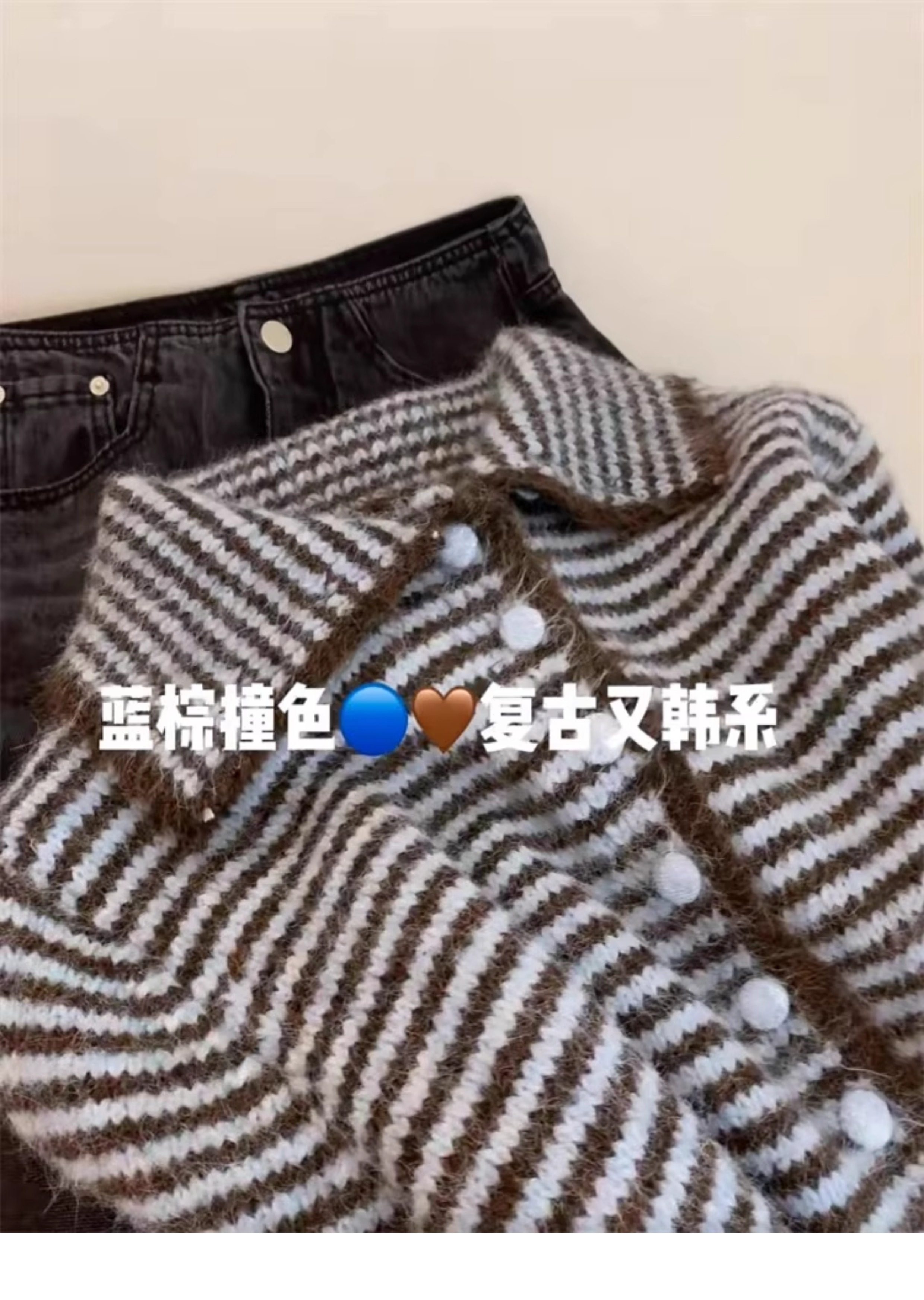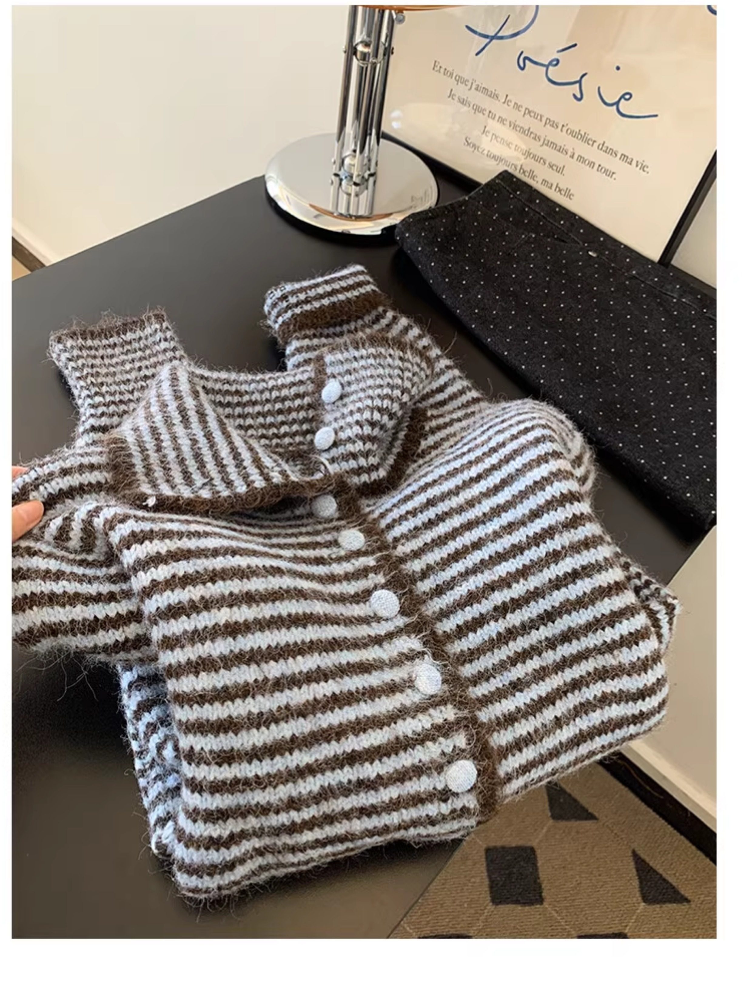 2025秋冬撞色條紋短款外套女新款軟糯慵懶內搭高領釦子毛衣