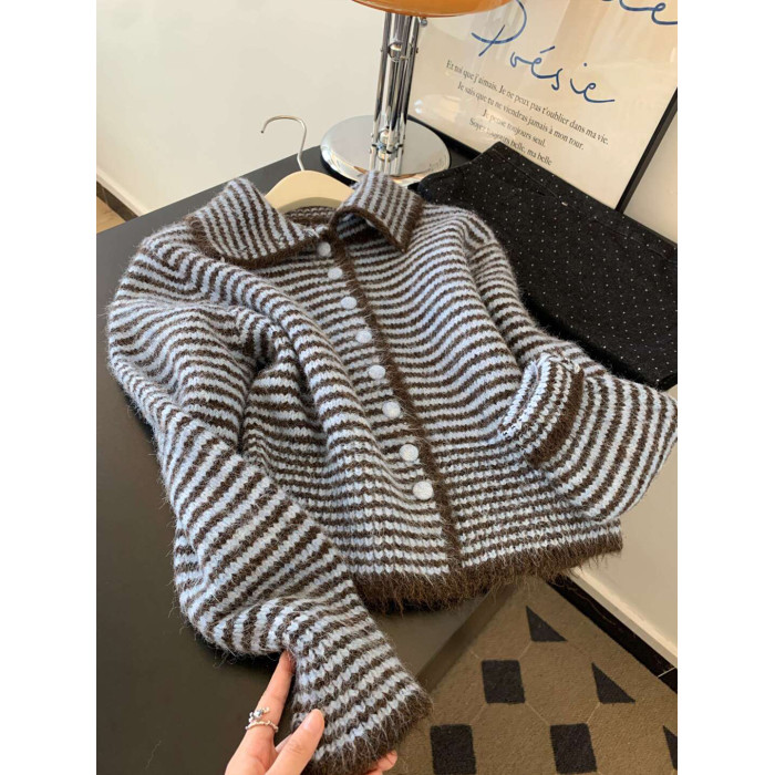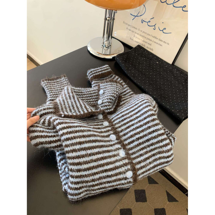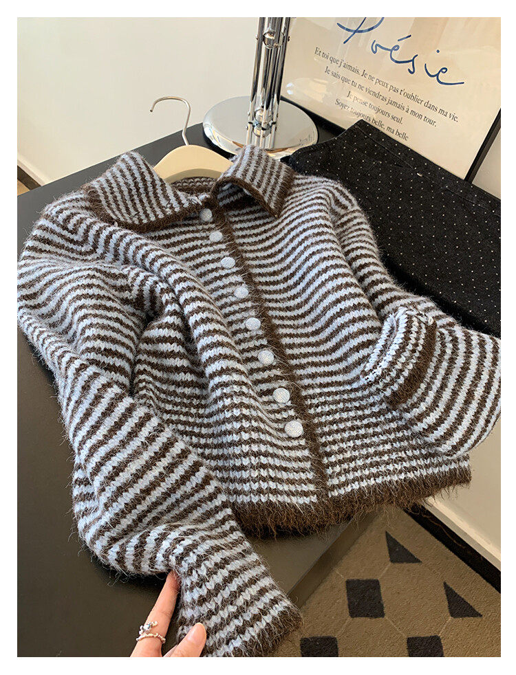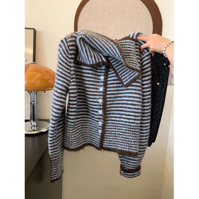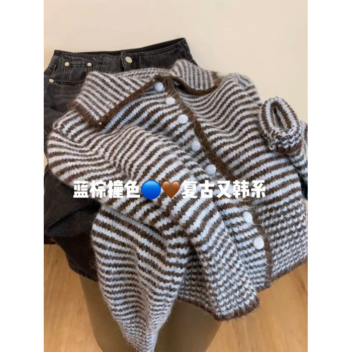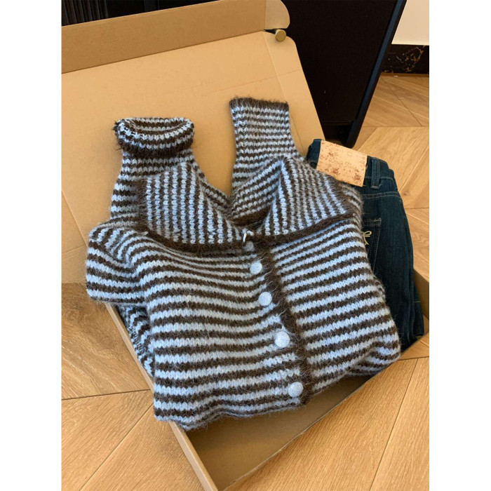 2025秋冬撞色條紋短款外套女新款軟糯慵懶內搭高領釦子毛衣