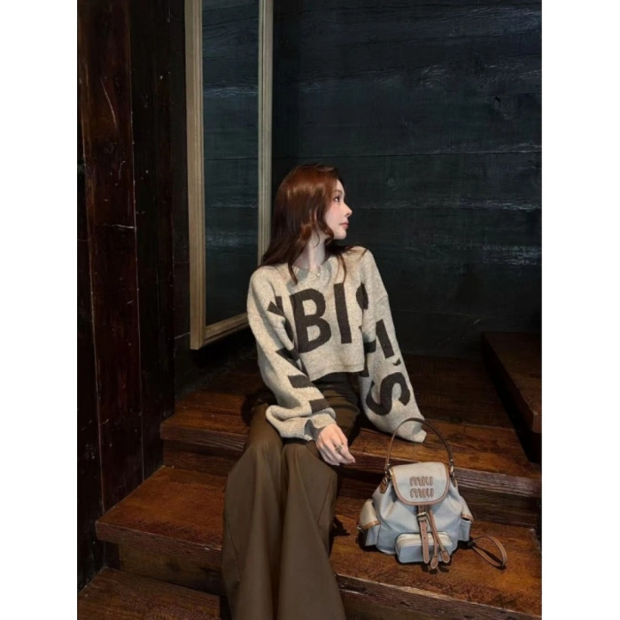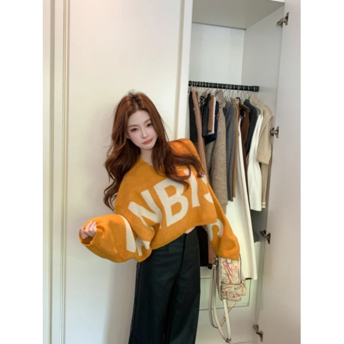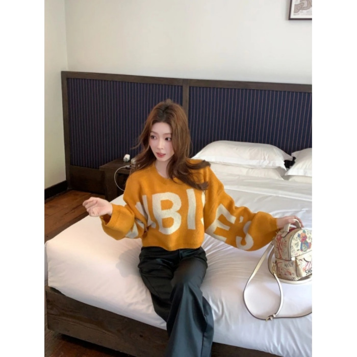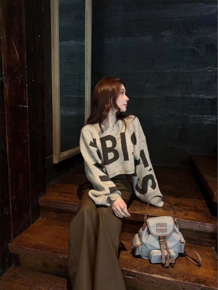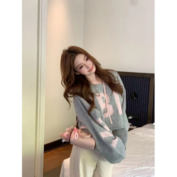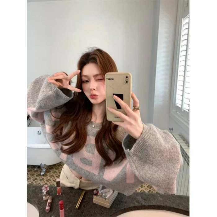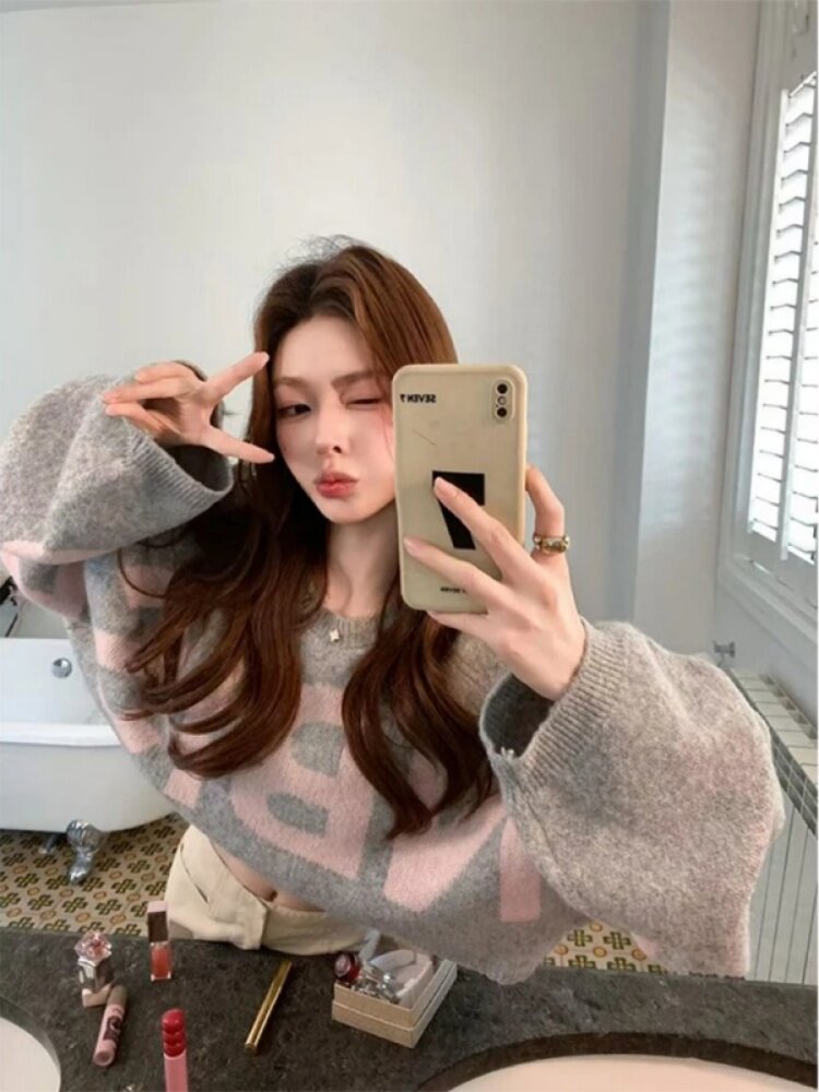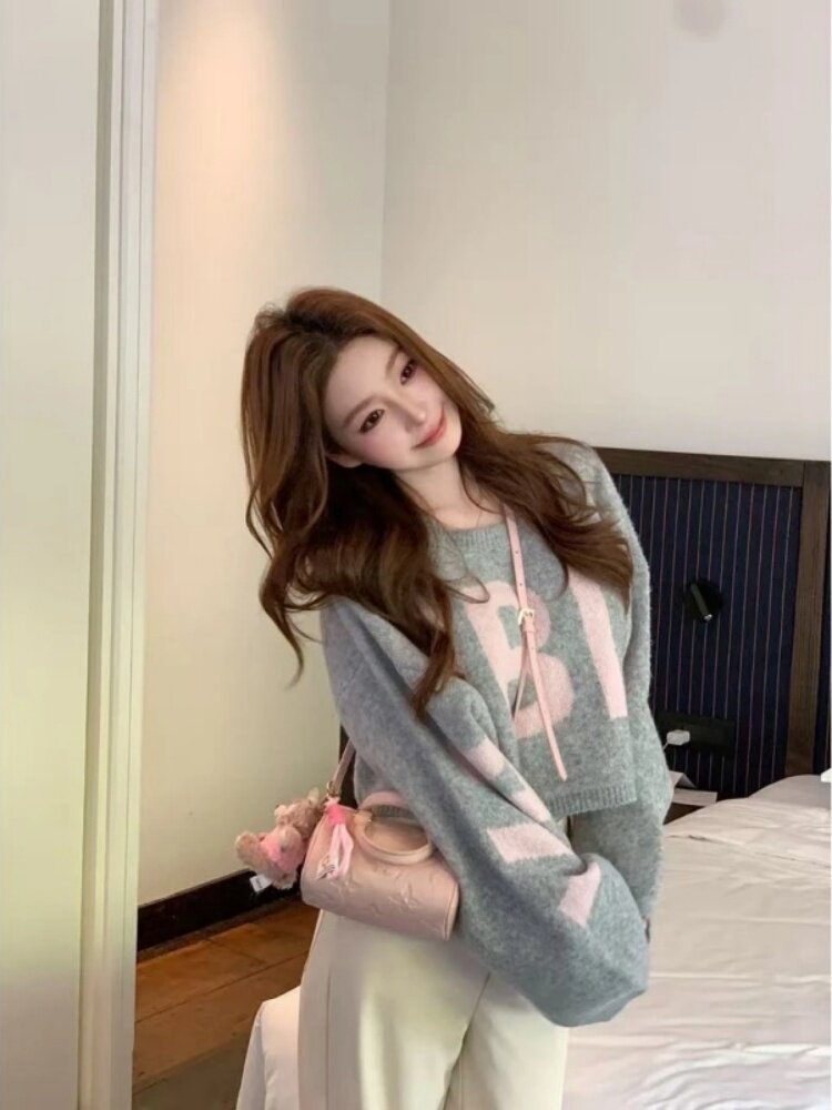 2025年春季新款休閒減齡慵嬾風圓領套頭毛衣女寬鬆顯瘦長袖針織衫