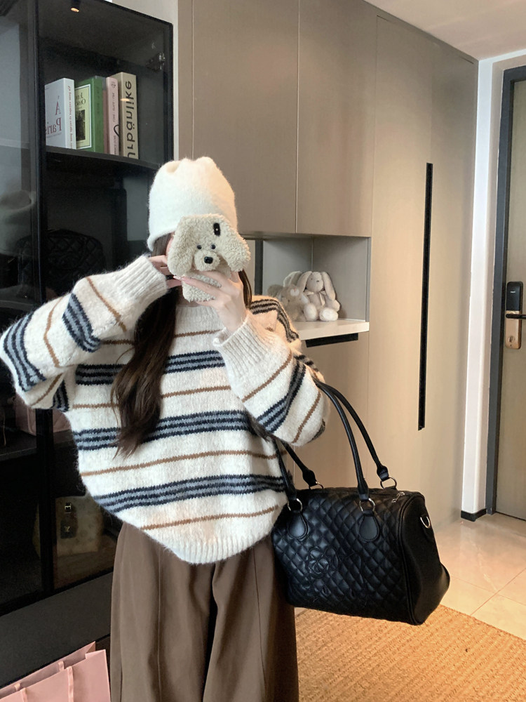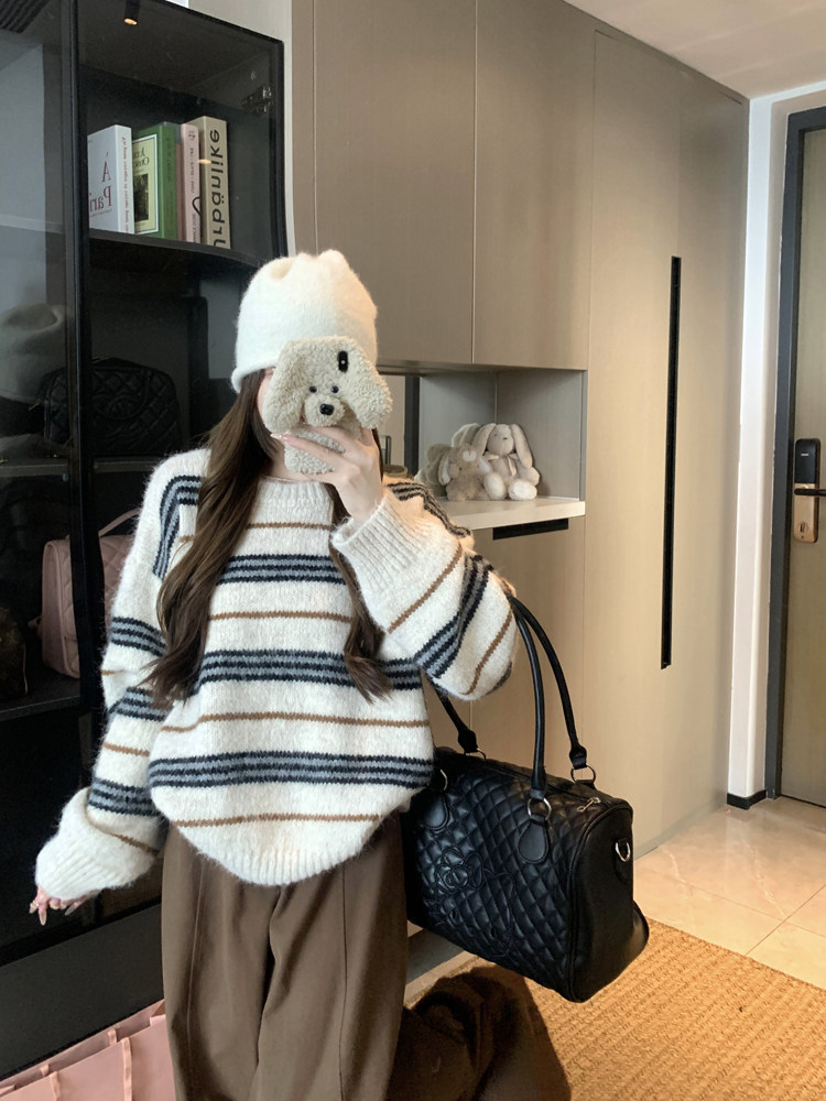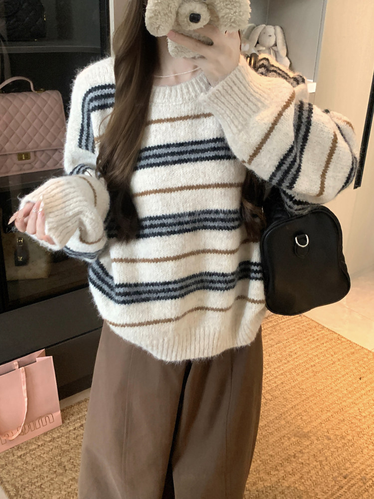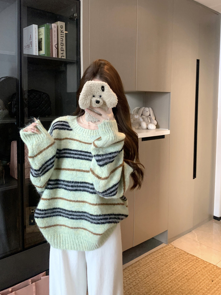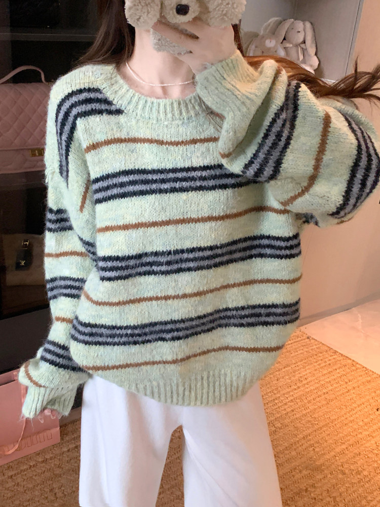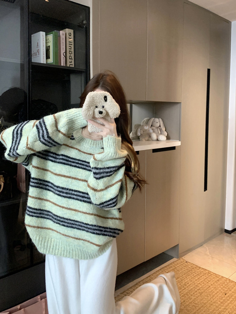 韓系少女風撞色條紋套頭毛衣女秋冬季慵嬾寬鬆休閒厚實針織衫上衣