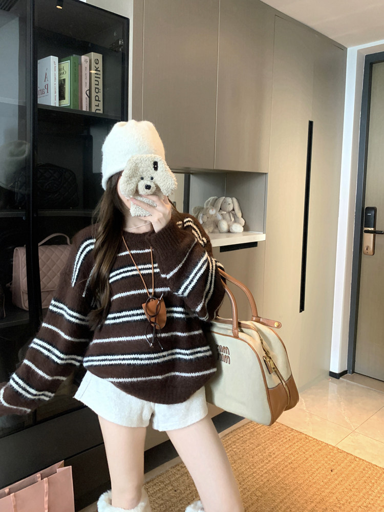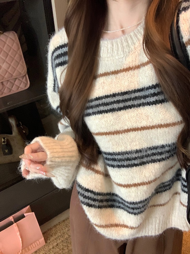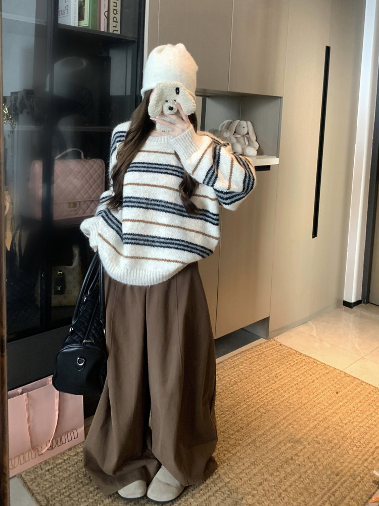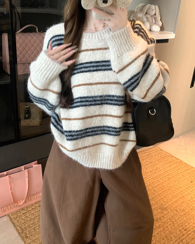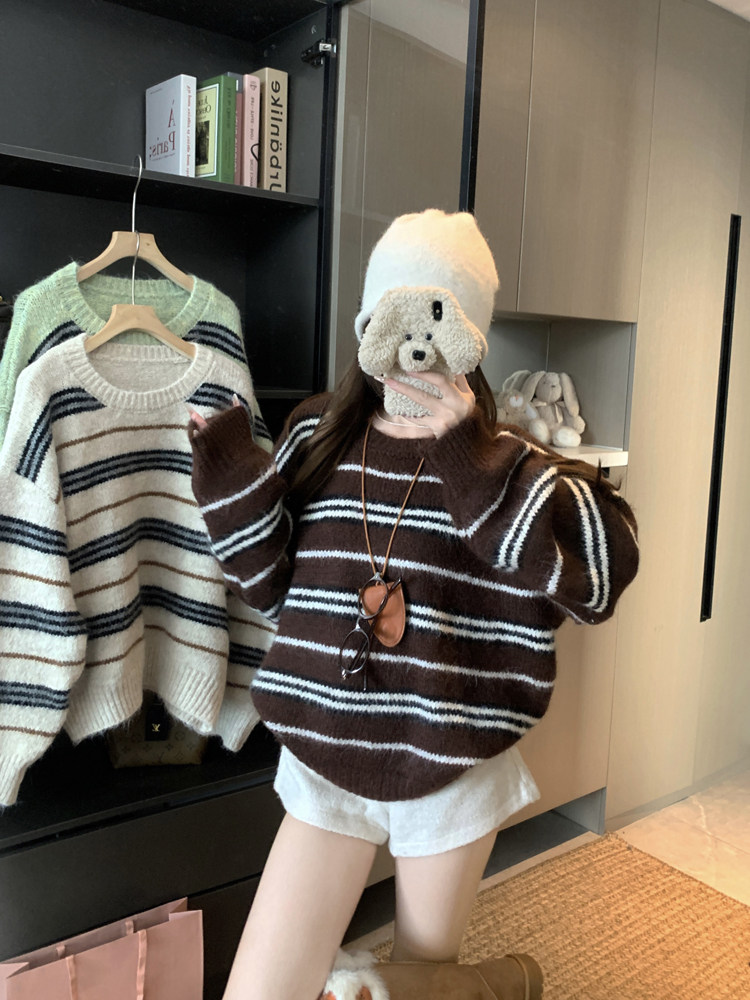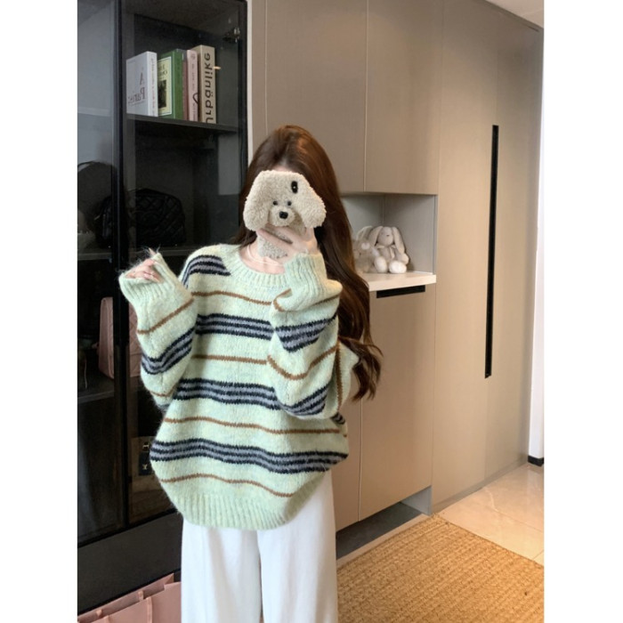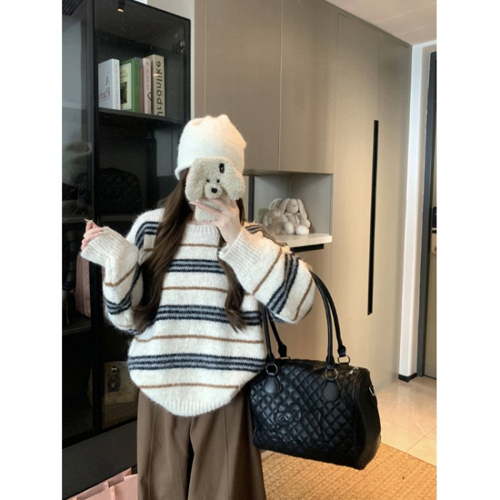 韓系少女風撞色條紋套頭毛衣女秋冬季慵嬾寬鬆休閒厚實針織衫上衣