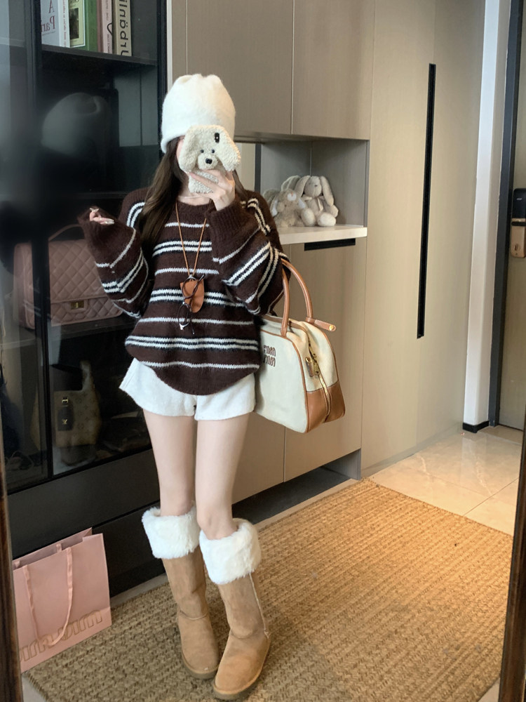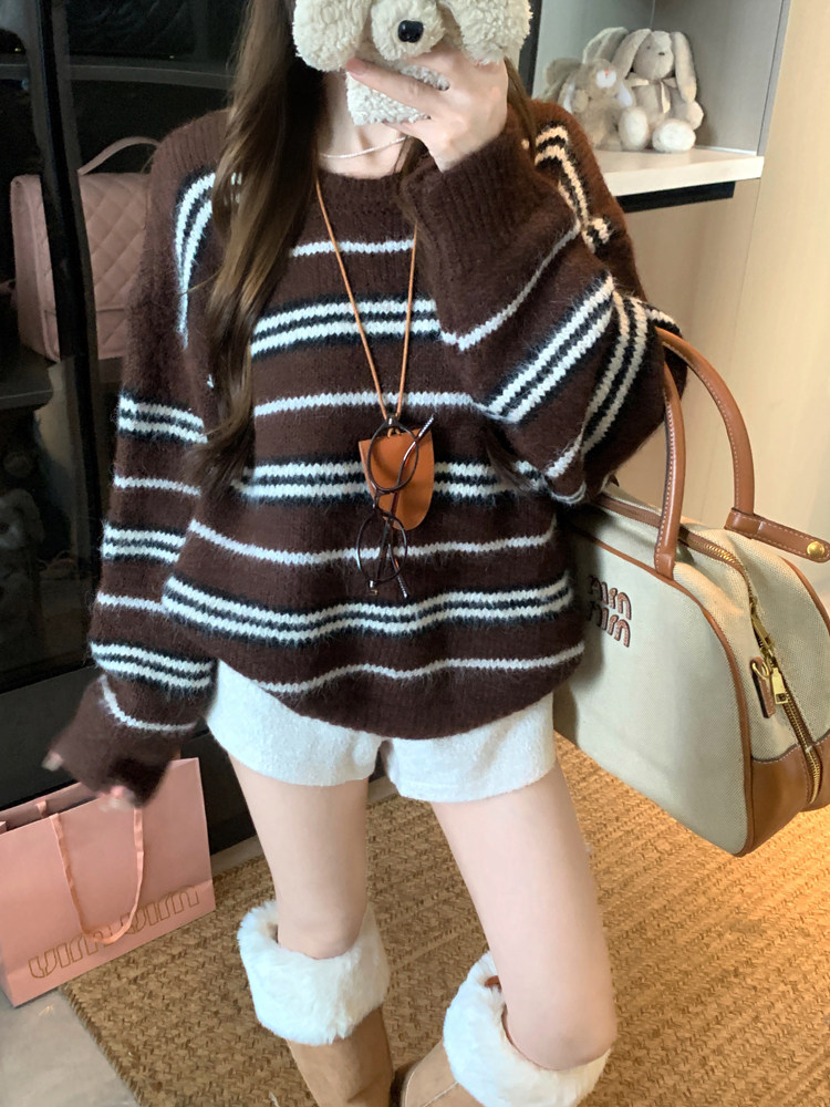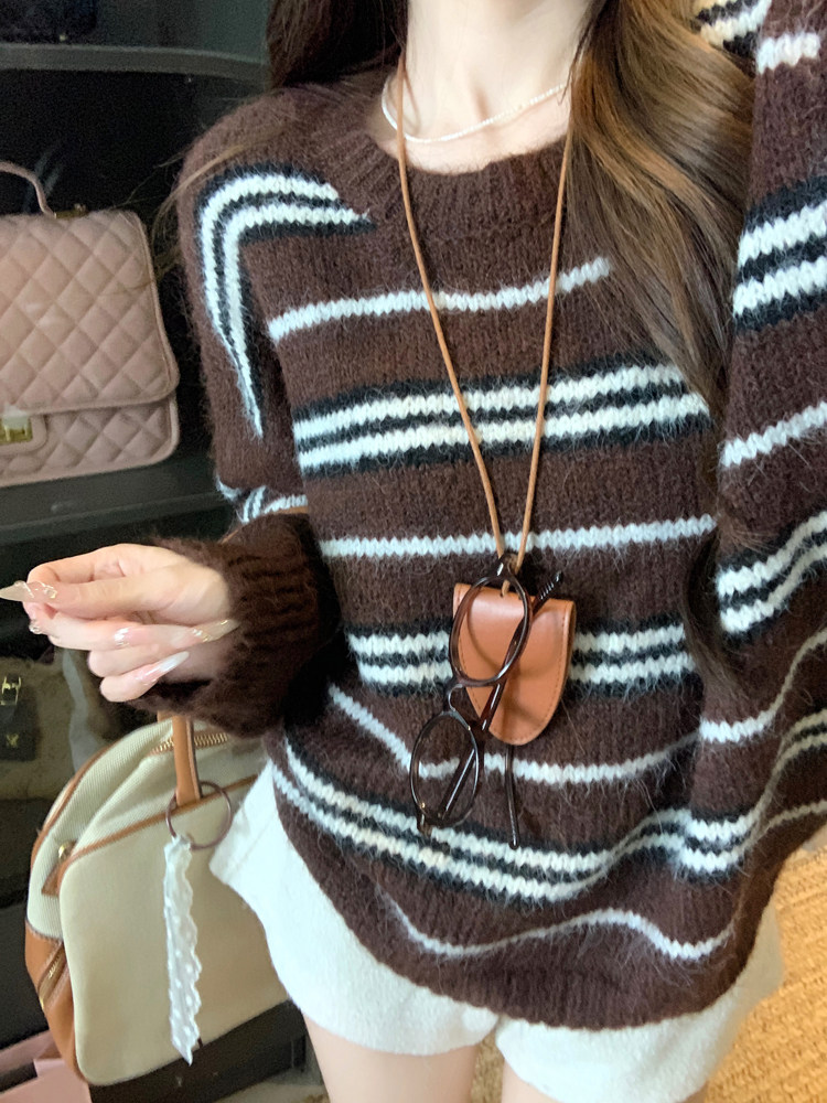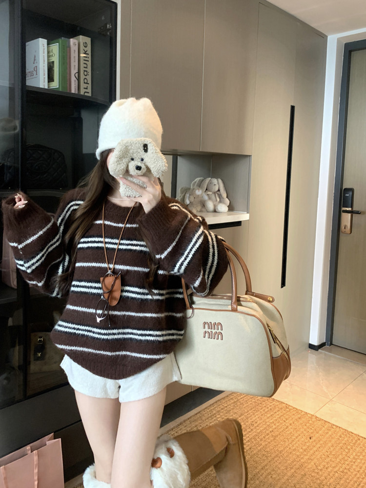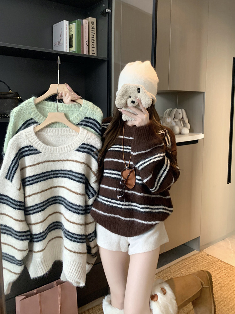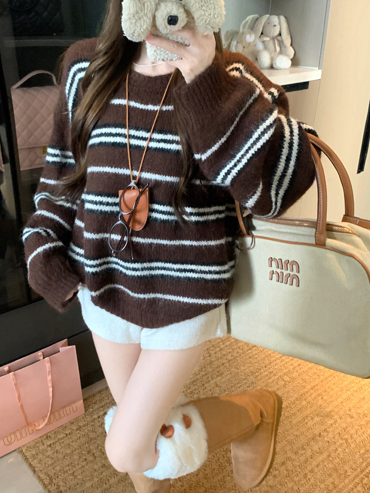 韓系少女風撞色條紋套頭毛衣女秋冬季慵嬾寬鬆休閒厚實針織衫上衣