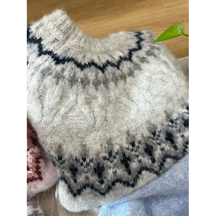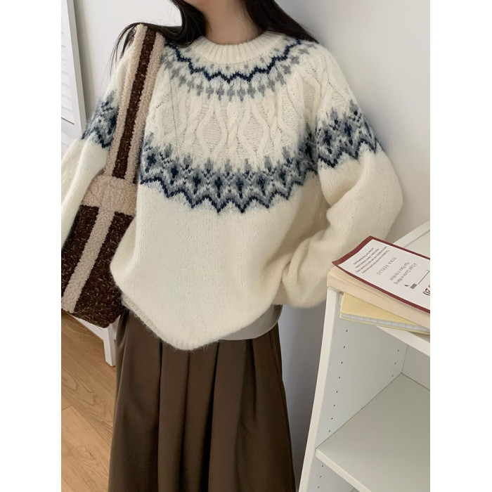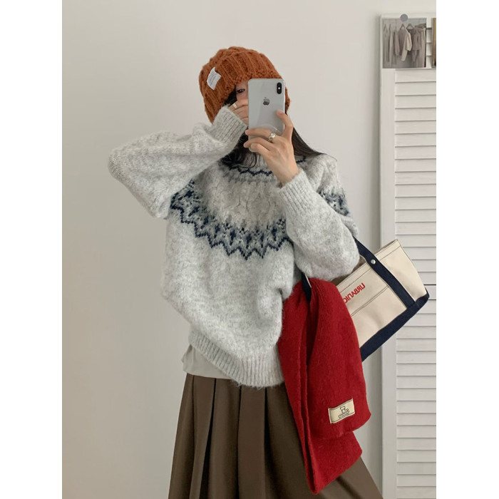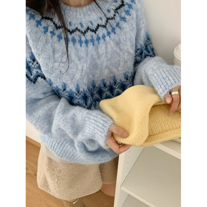 北歐風費爾島提花藍色毛衣套頭女寬松秋冬加厚慵懶內搭針織衫上衣