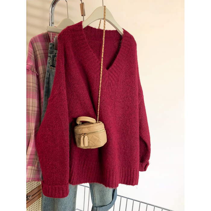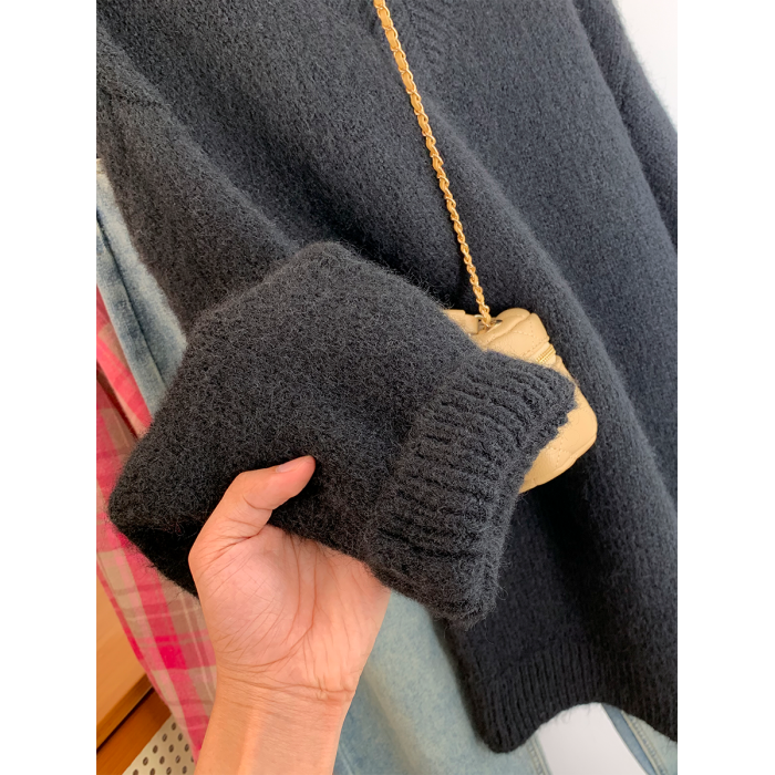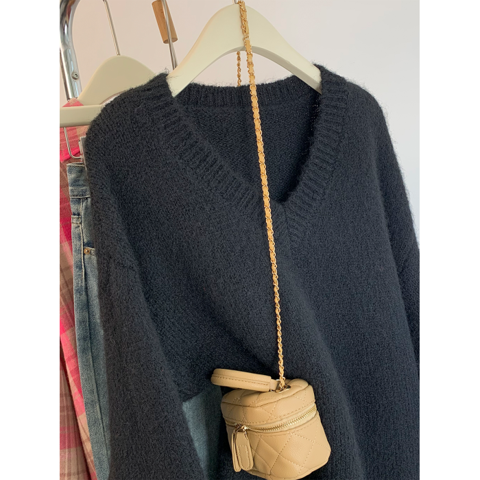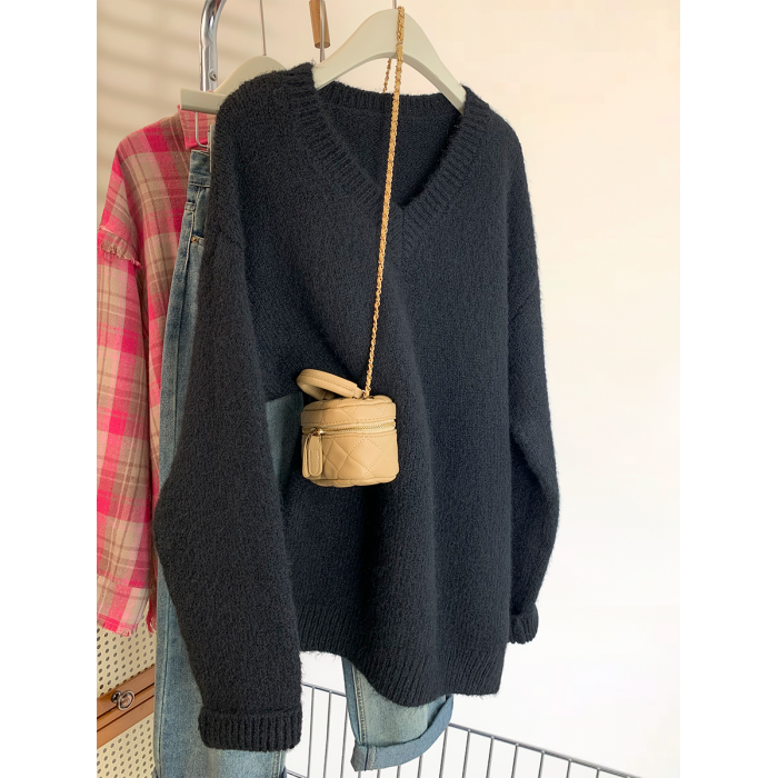黑色浣熊絨v領套頭毛衣女春季2026新款慵懶風軟糯加厚打底針織衫