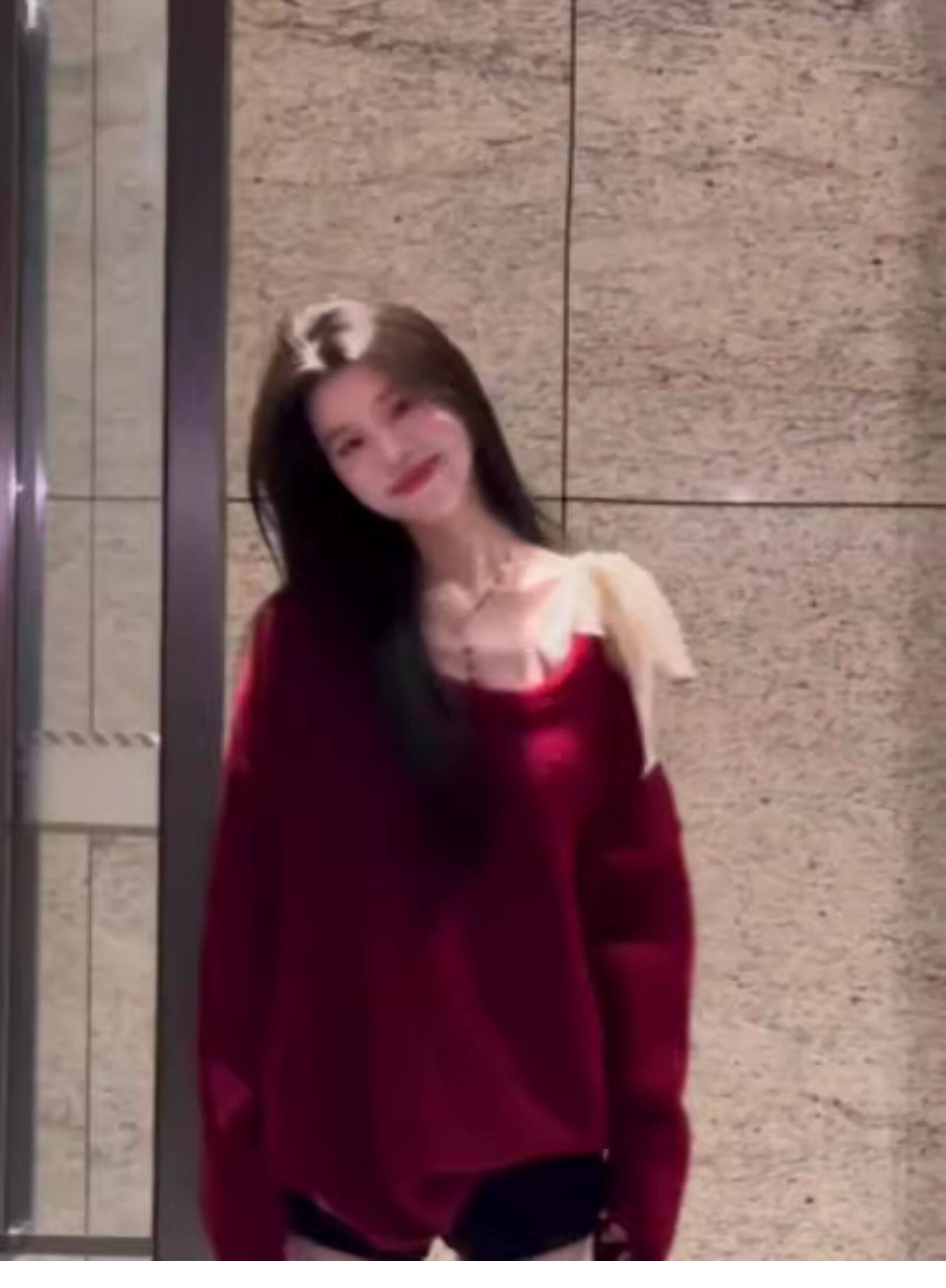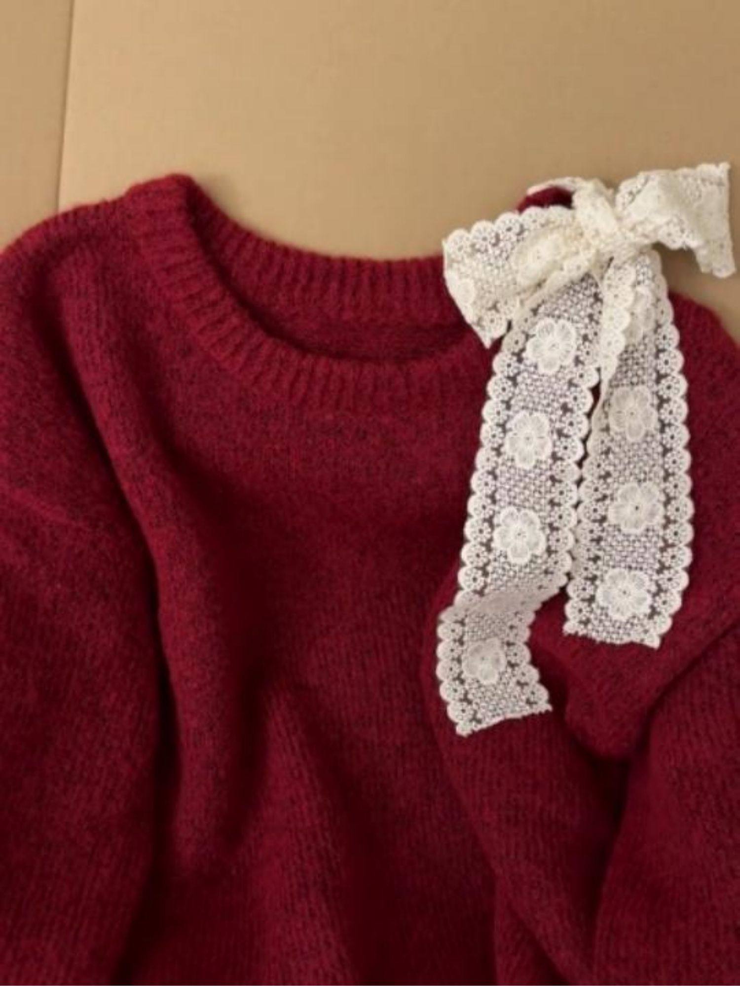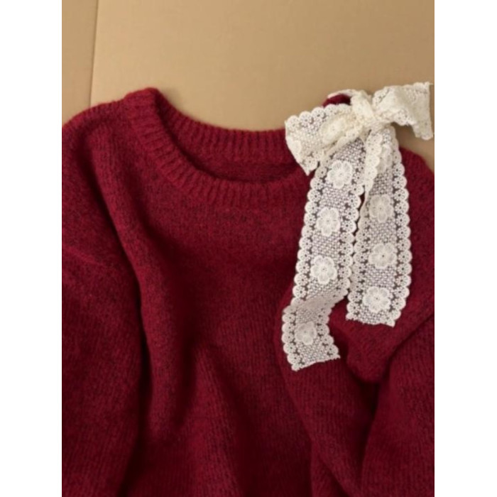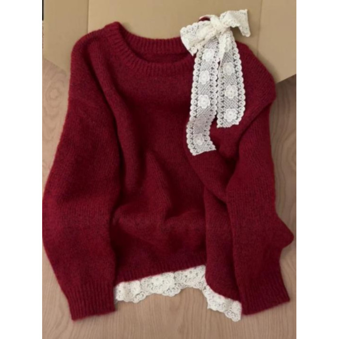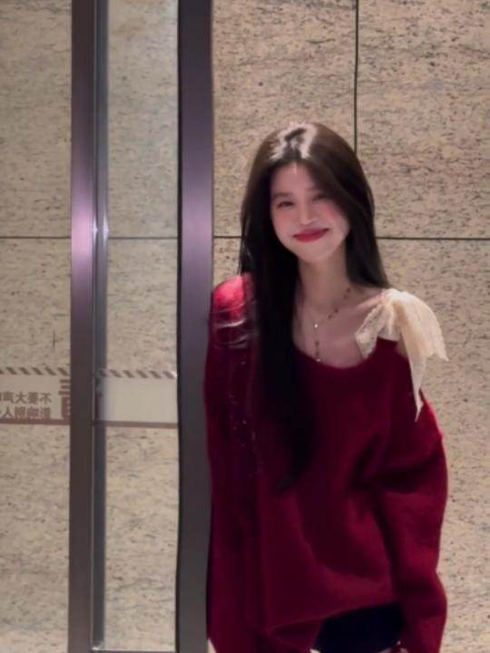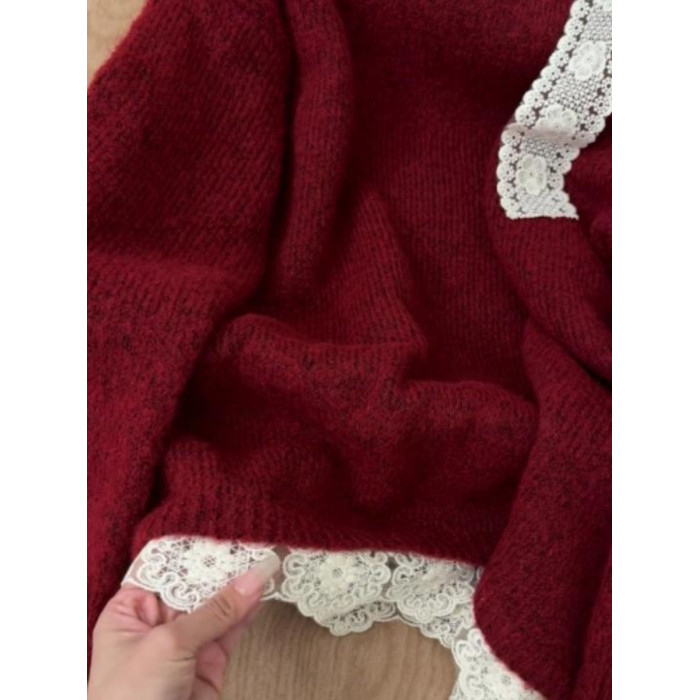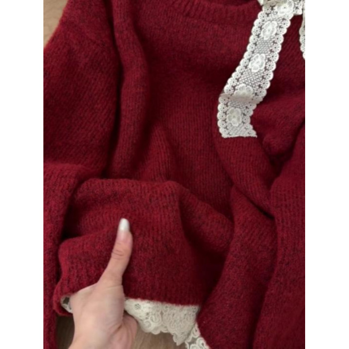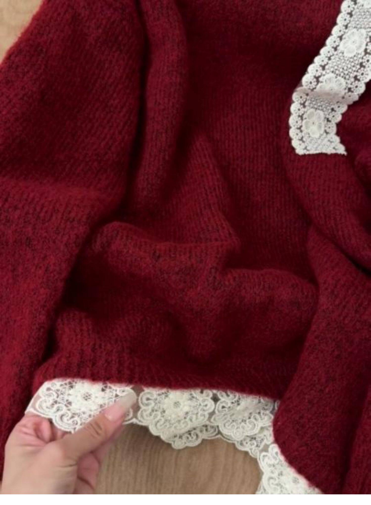 高級感蕾絲紅色露肩毛衣女秋冬新款設計感超好看的寬鬆慵嬾針織衫