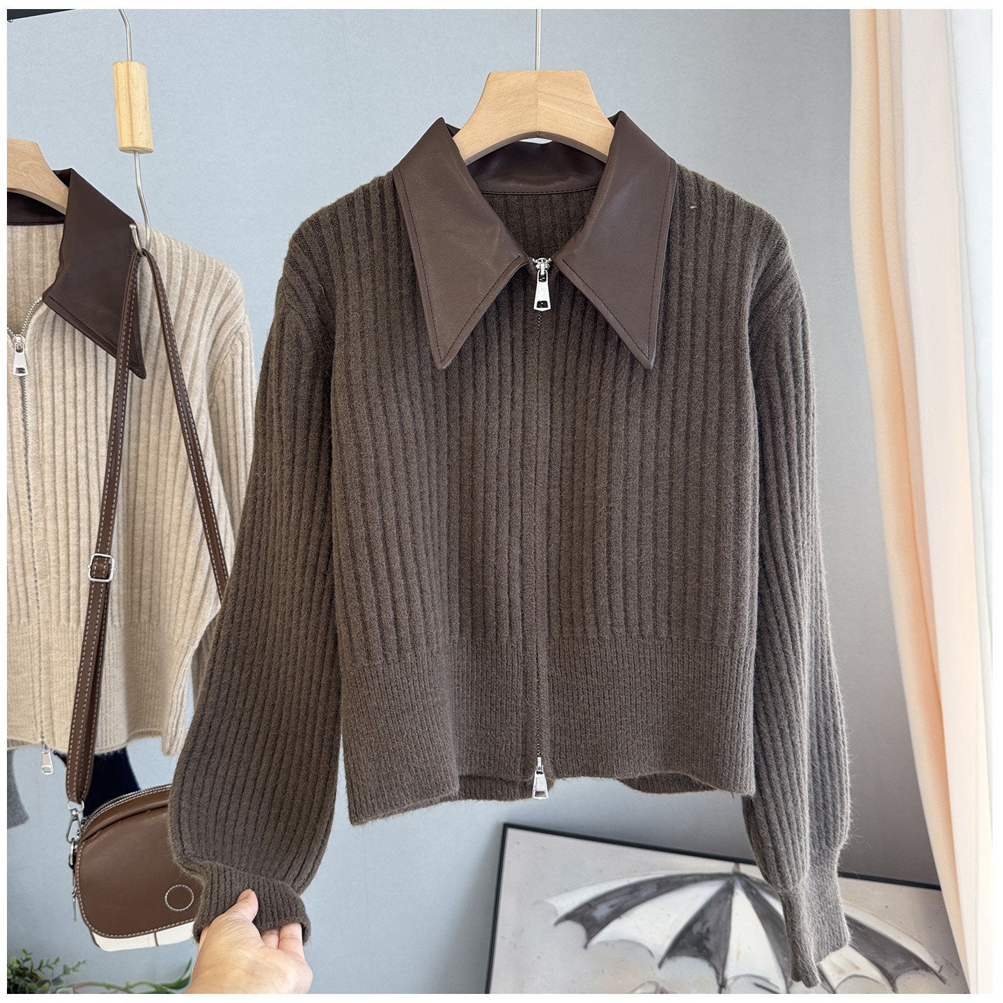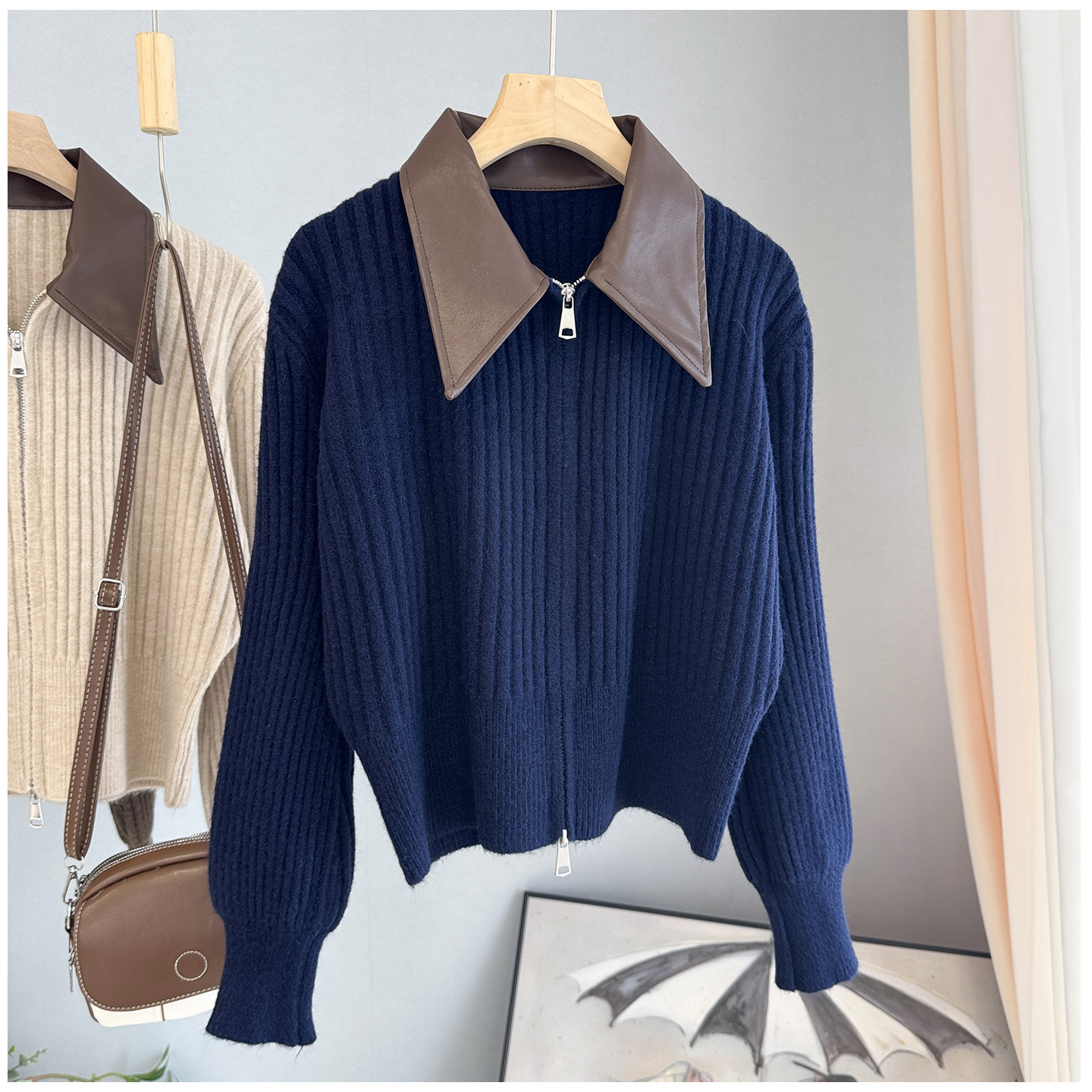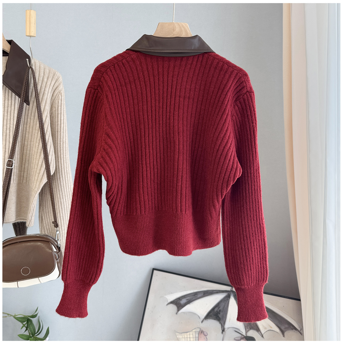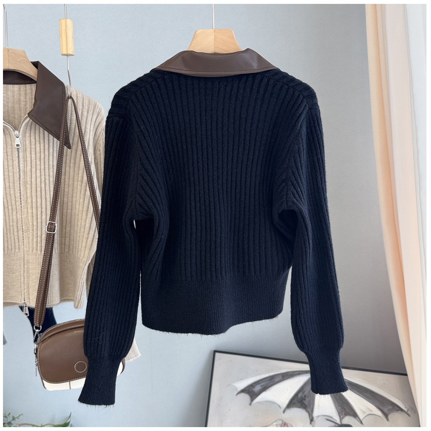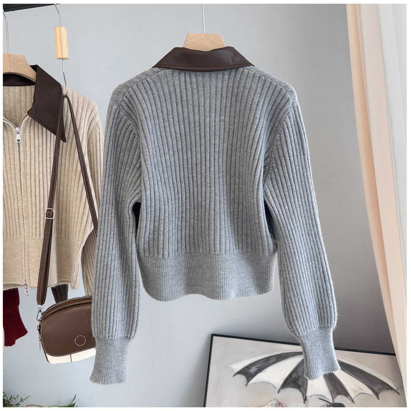 設計感拼接皮領毛衣外套女2025秋裝新款韓版修身顯瘦針織開衫上衣